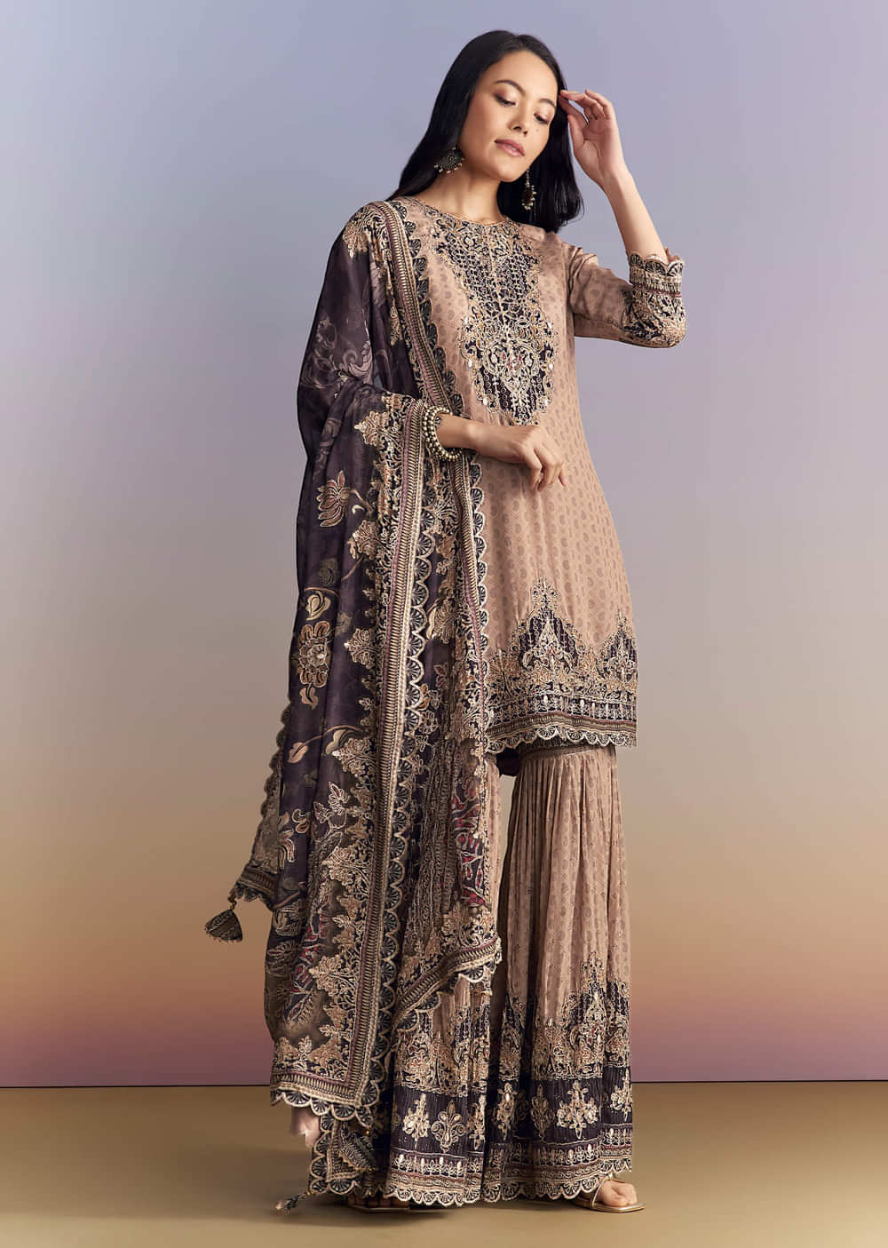 When you want soft colour with festive charm, this peach crepe sharara suit brings a flattering glow to wedding functions. All-over paisley keeps the look graceful, while delicate zari work... More Product Details