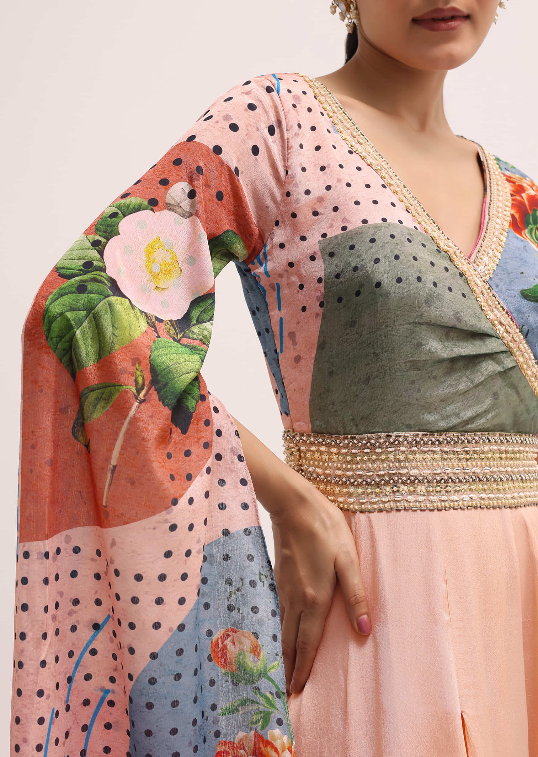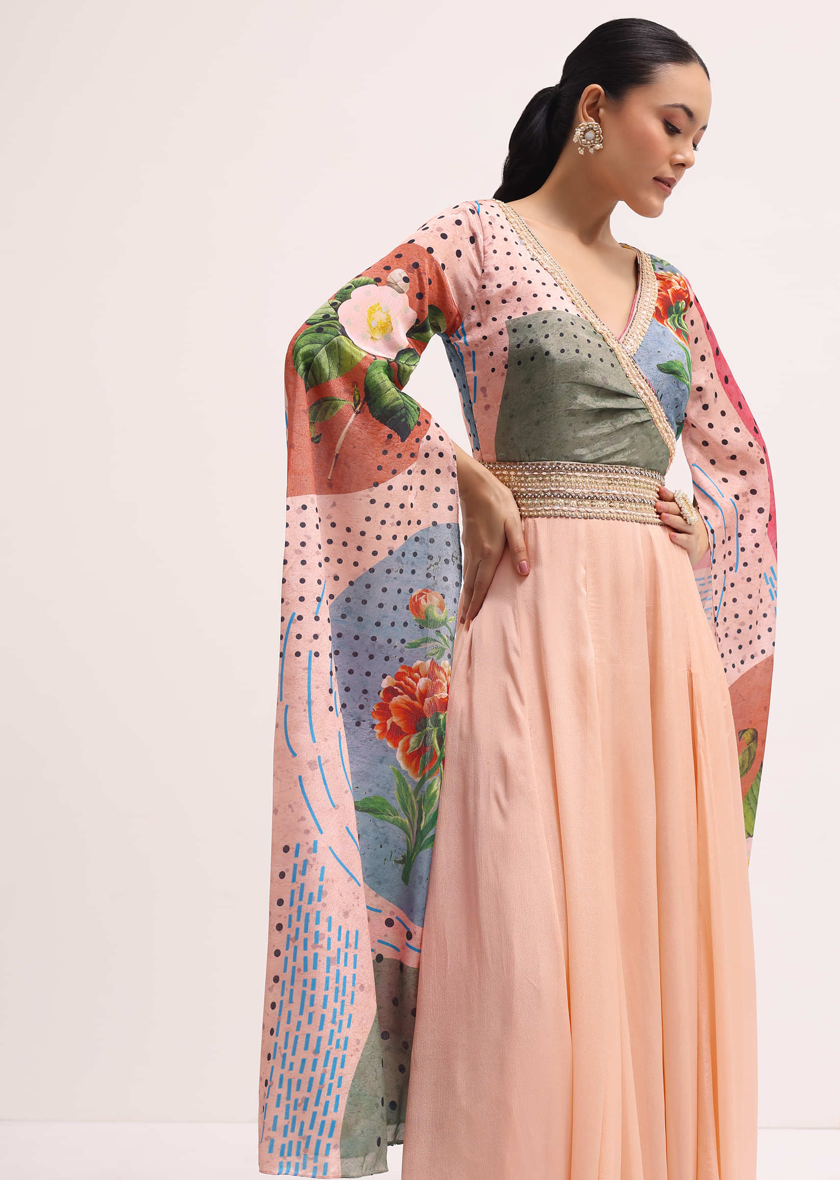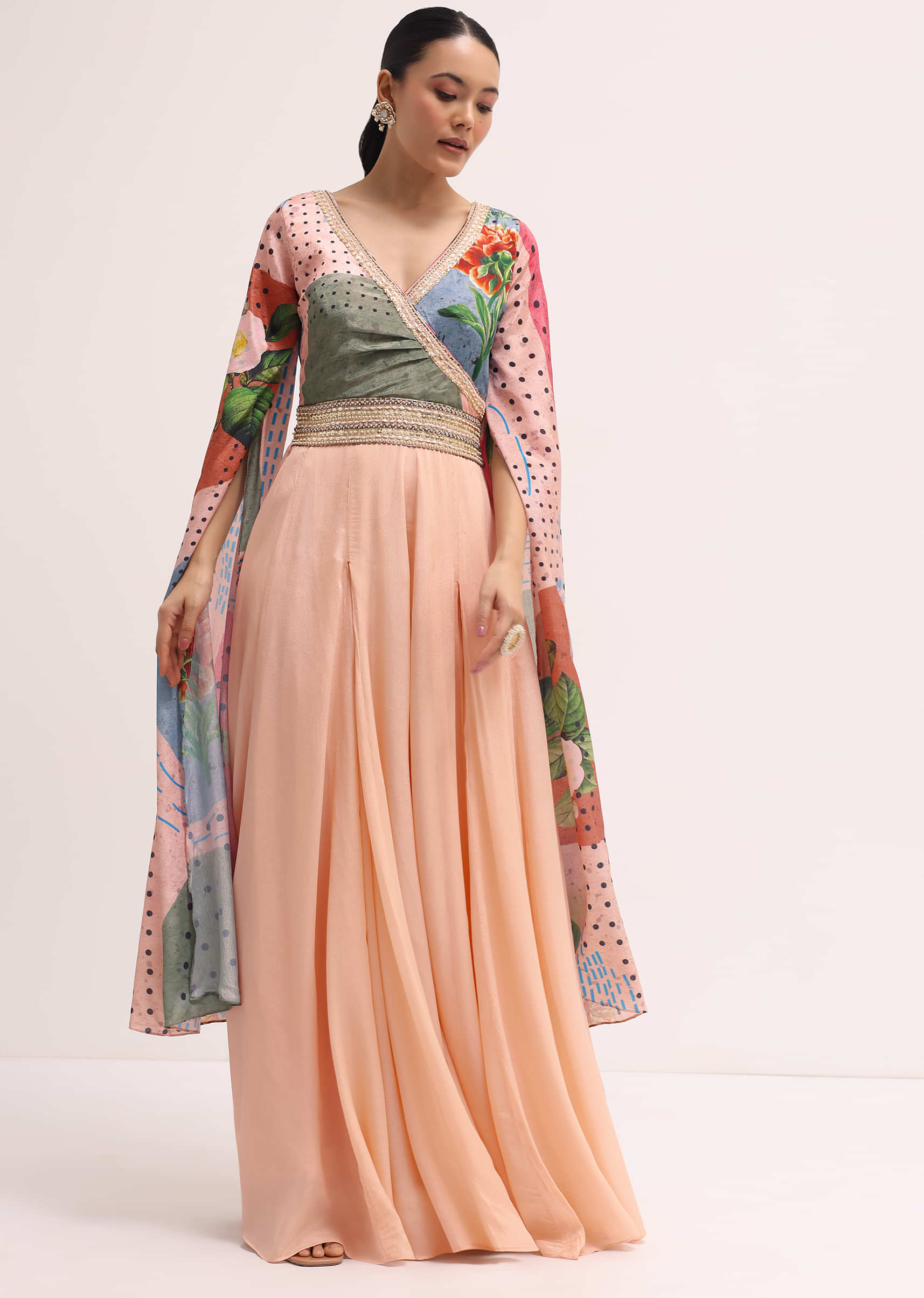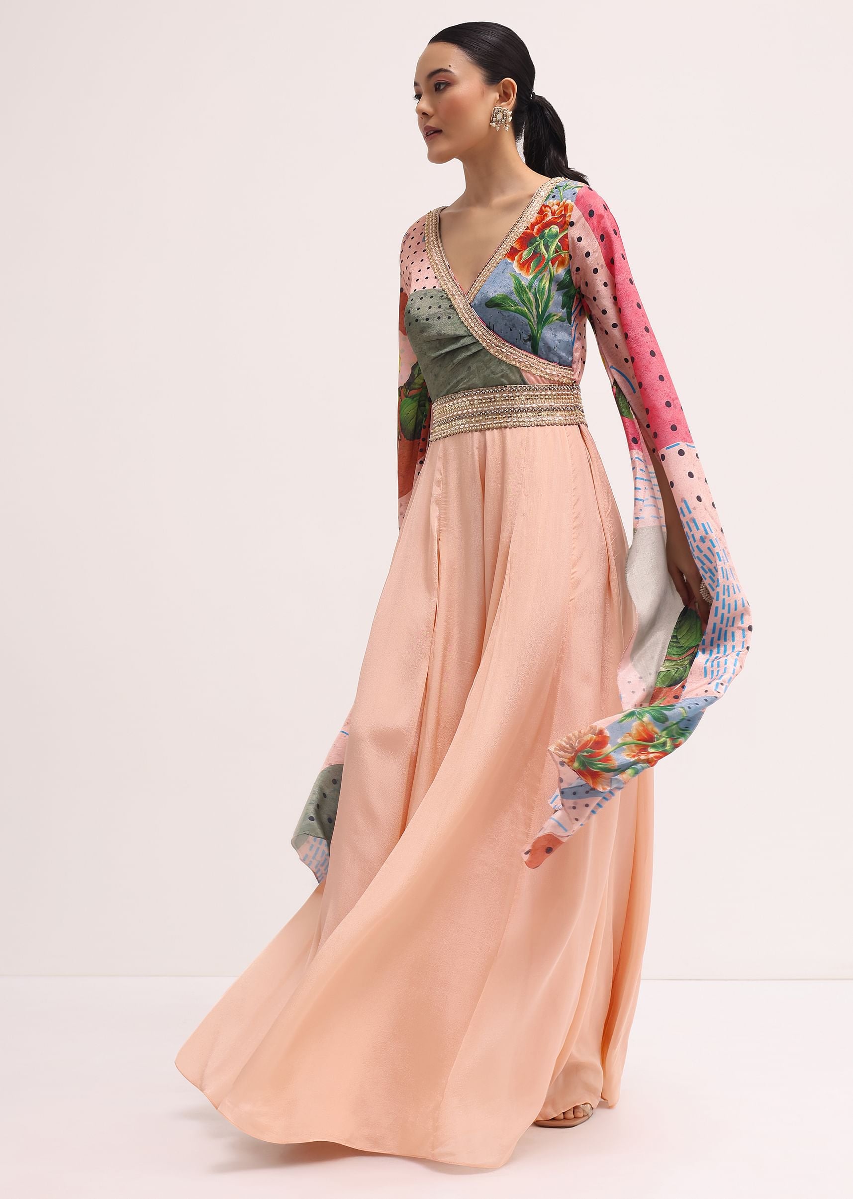 - Fashioned from chinnon fabric it is embellished with prints cut dana moti and sequin embroidery.