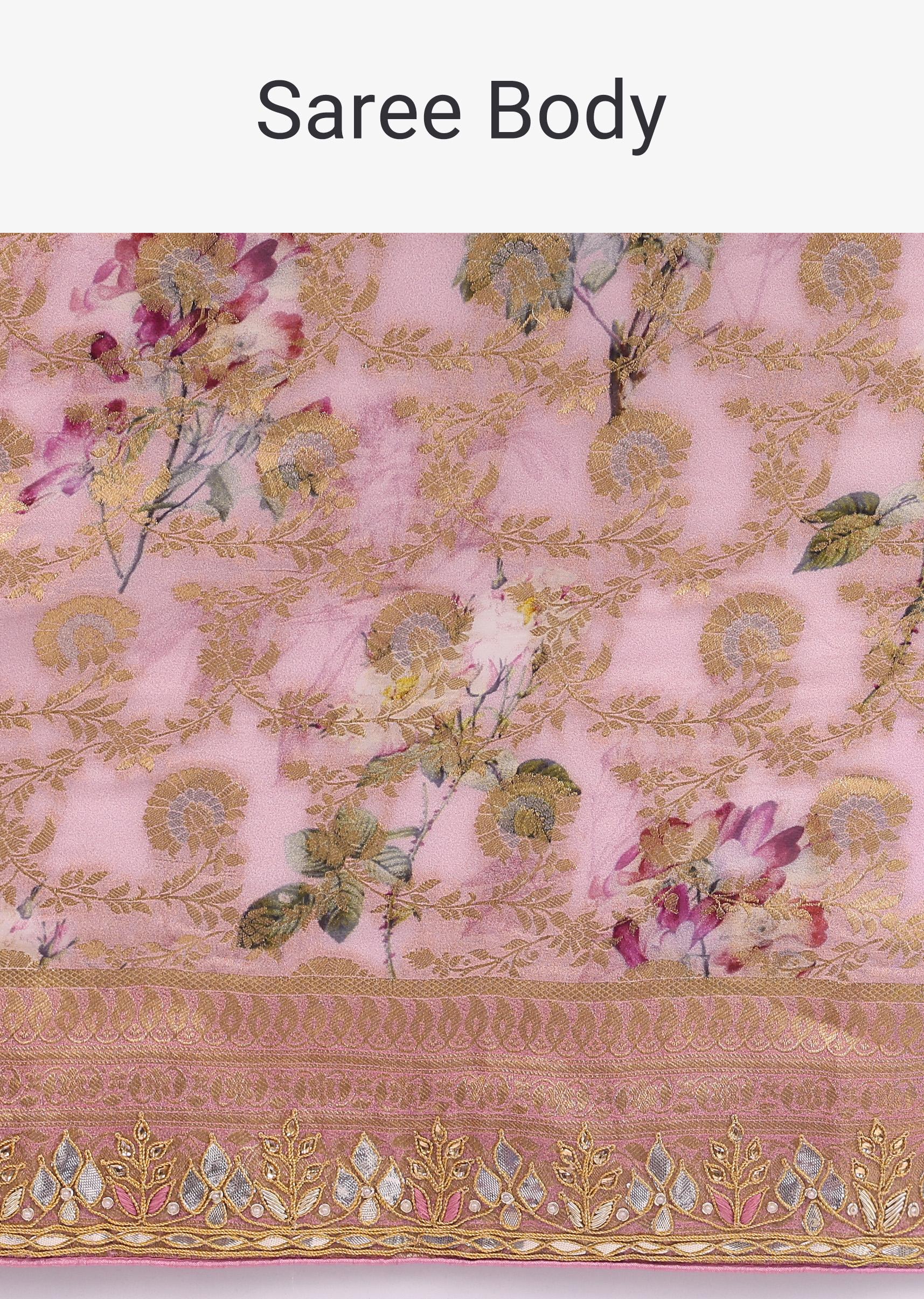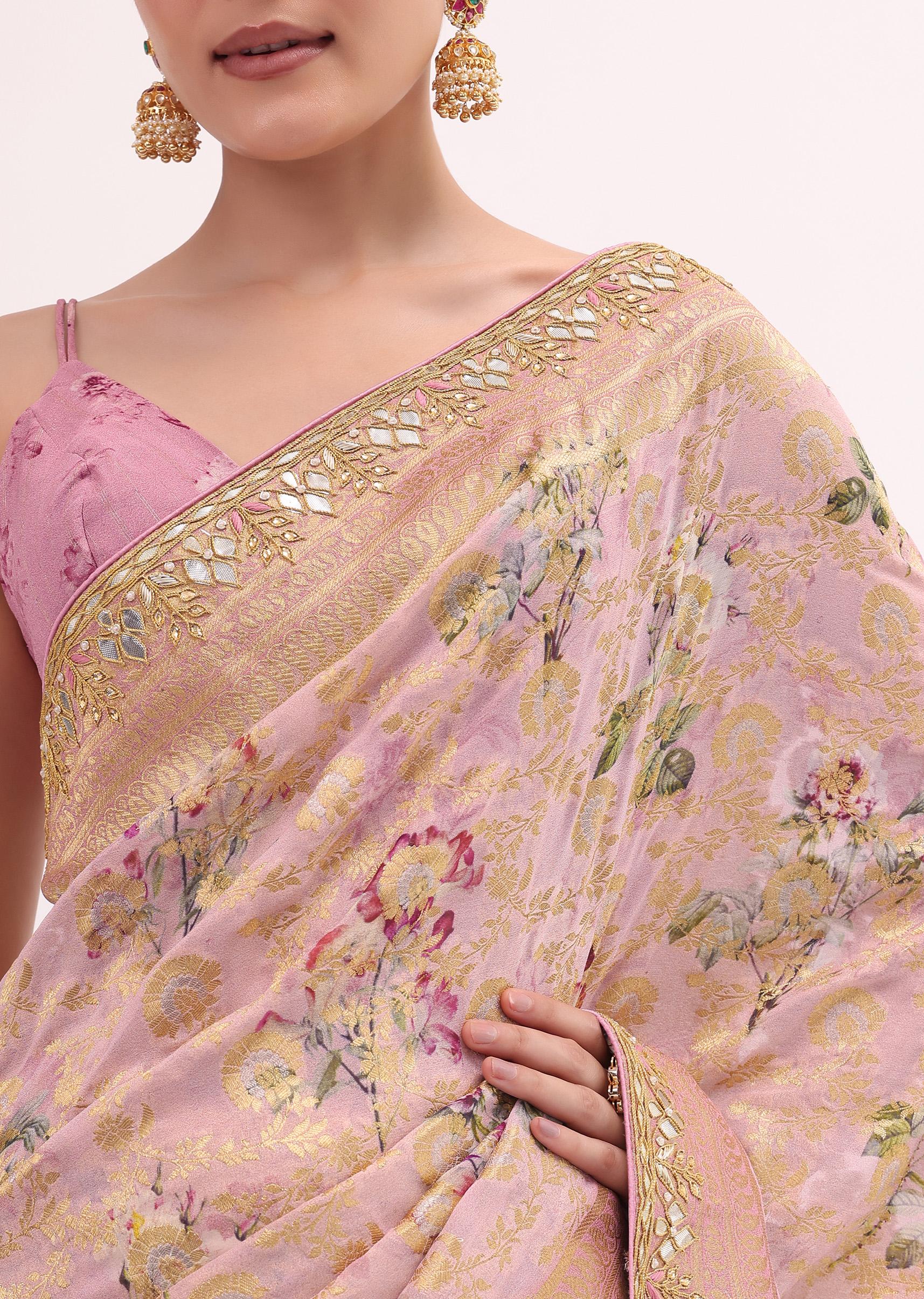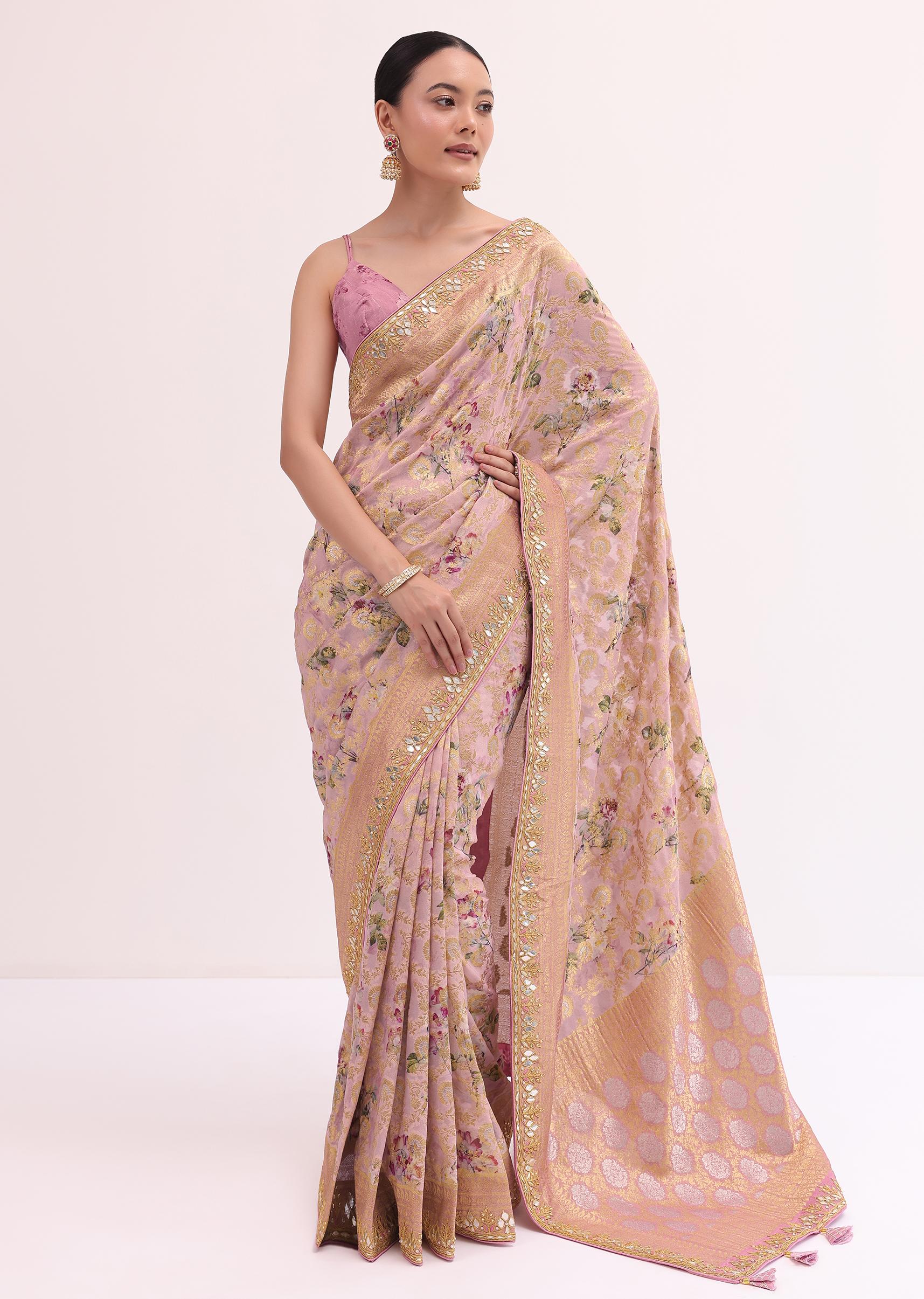 - Discover the charm of our peach banarasi khaddi saree, enhanced with floral prints and gotta patti work.