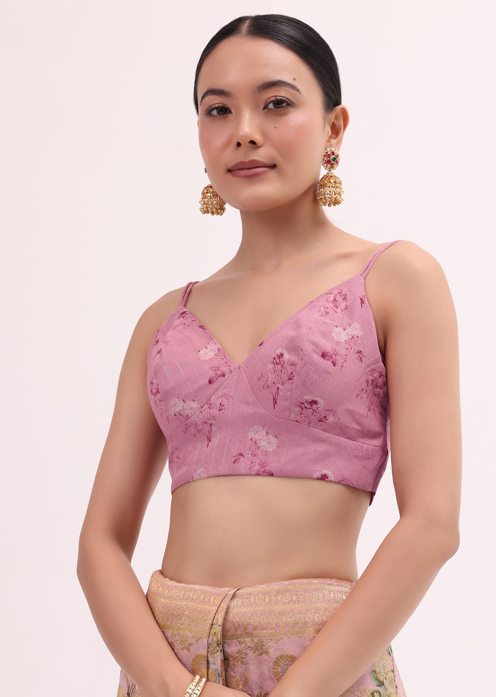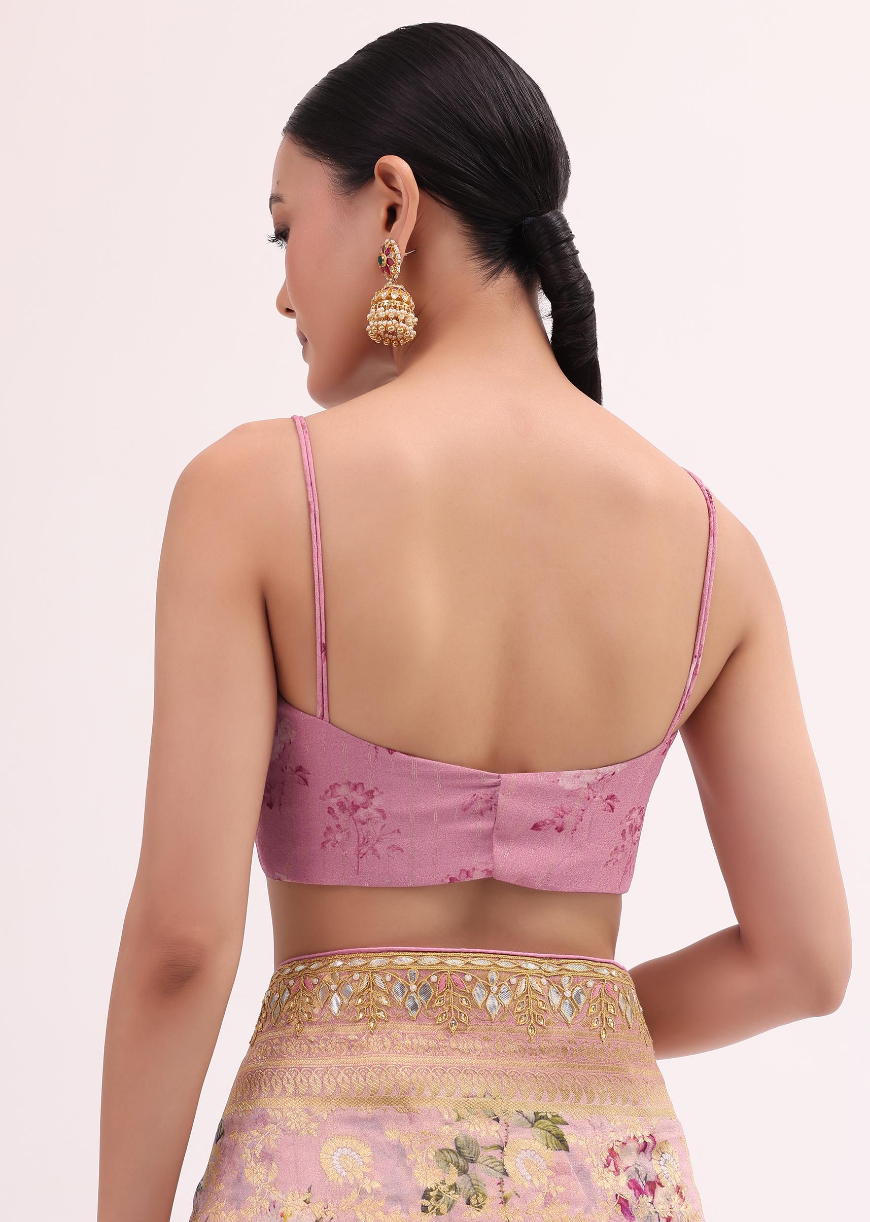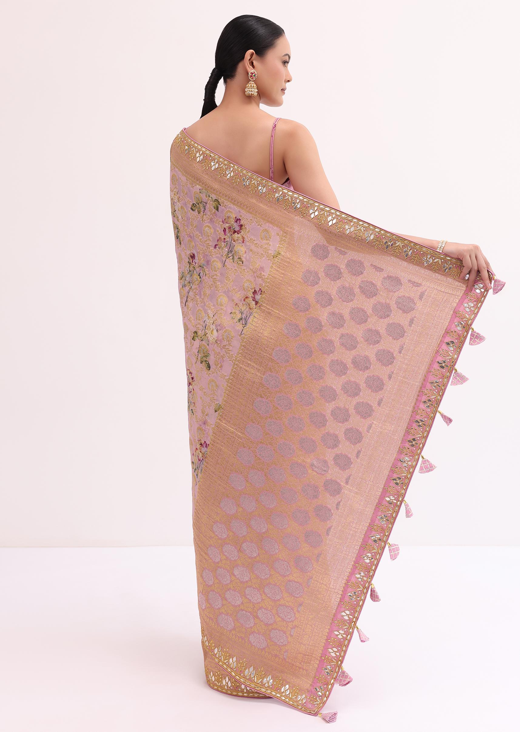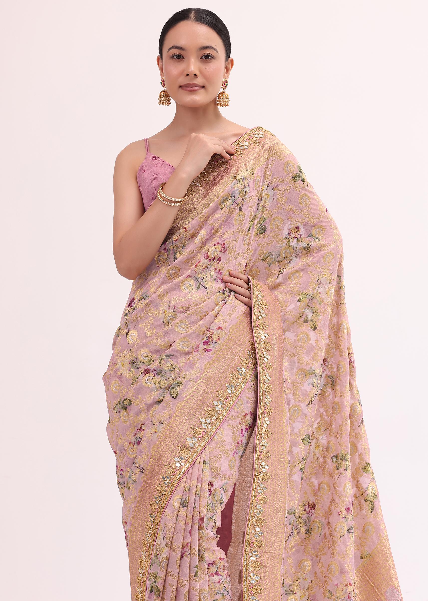 - Discover the charm of our peach banarasi khaddi saree, enhanced with floral prints and gotta patti work.