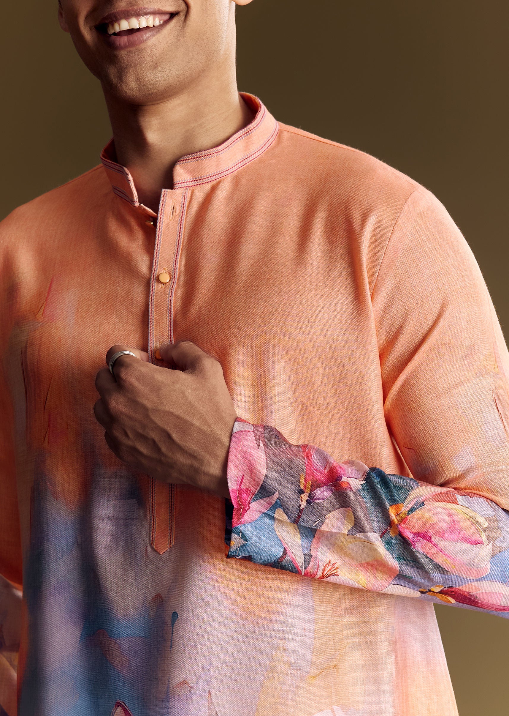 Peach Floral Printed Linen Kurta Set With Contemporary Styling