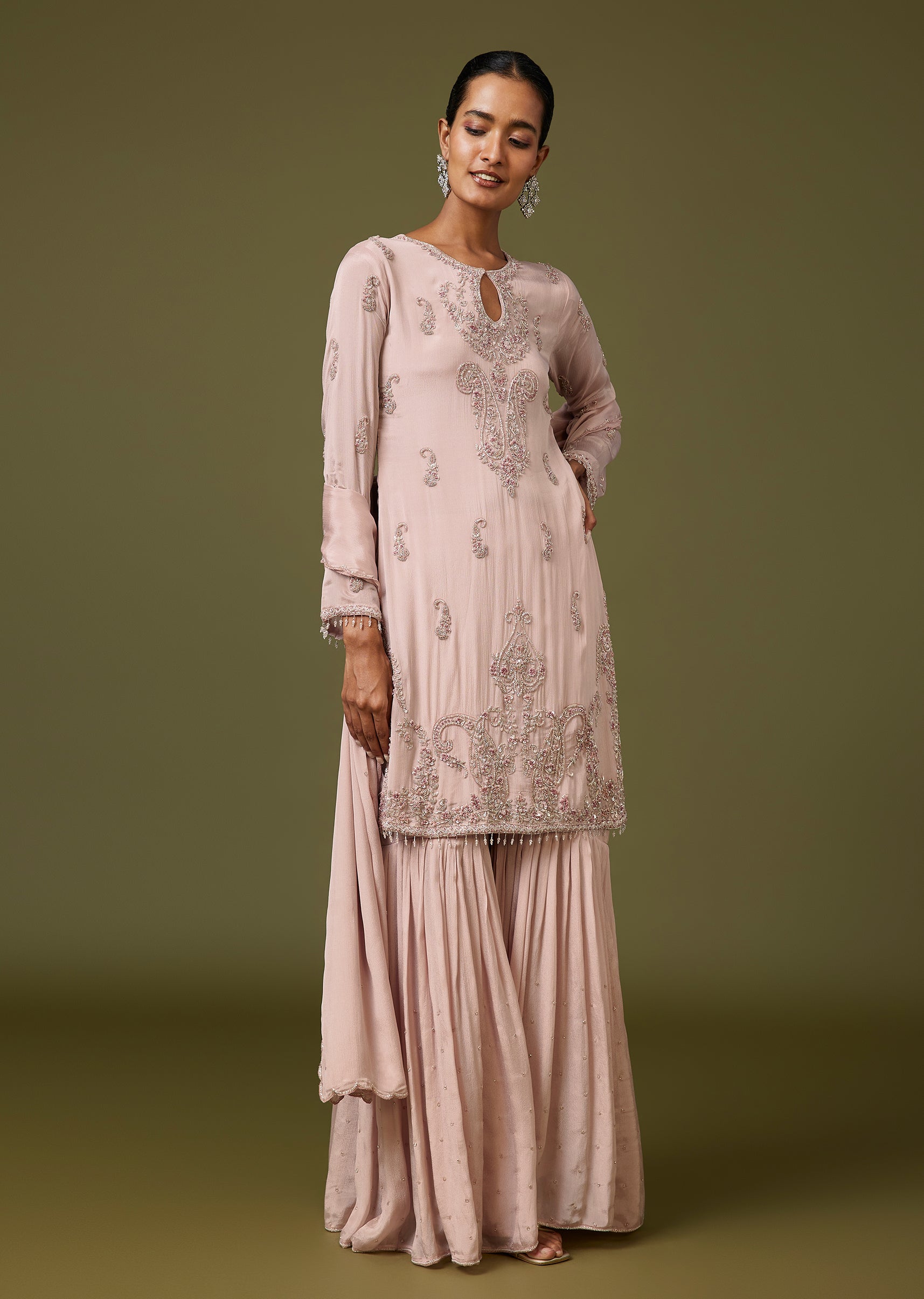Soft and festive, this peach chinon sharara set is finished with French knot embroidery and bead detailing for a rich handcrafted feel. Featuring a keyhole neckline and full sleeves, it... More Product Details