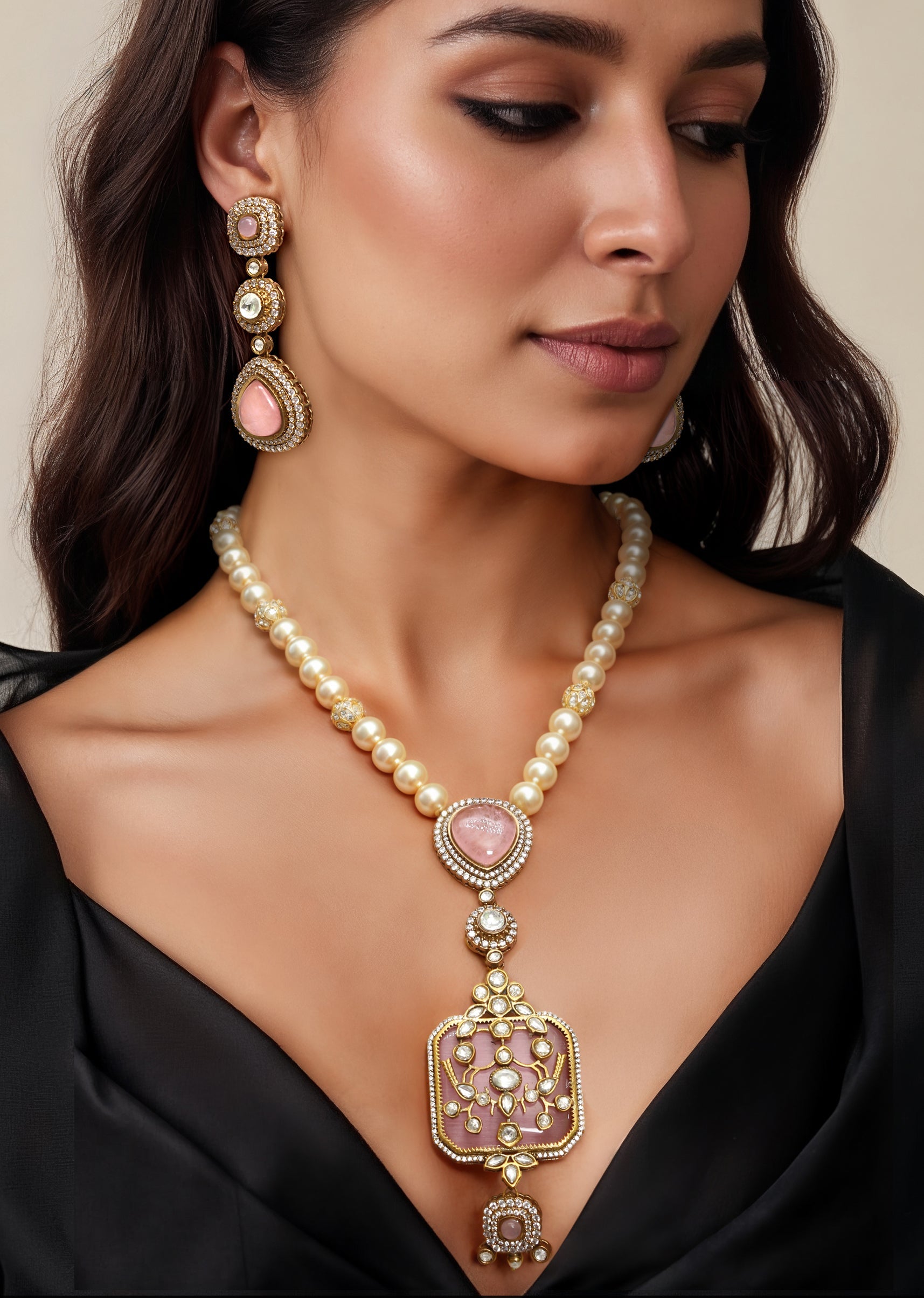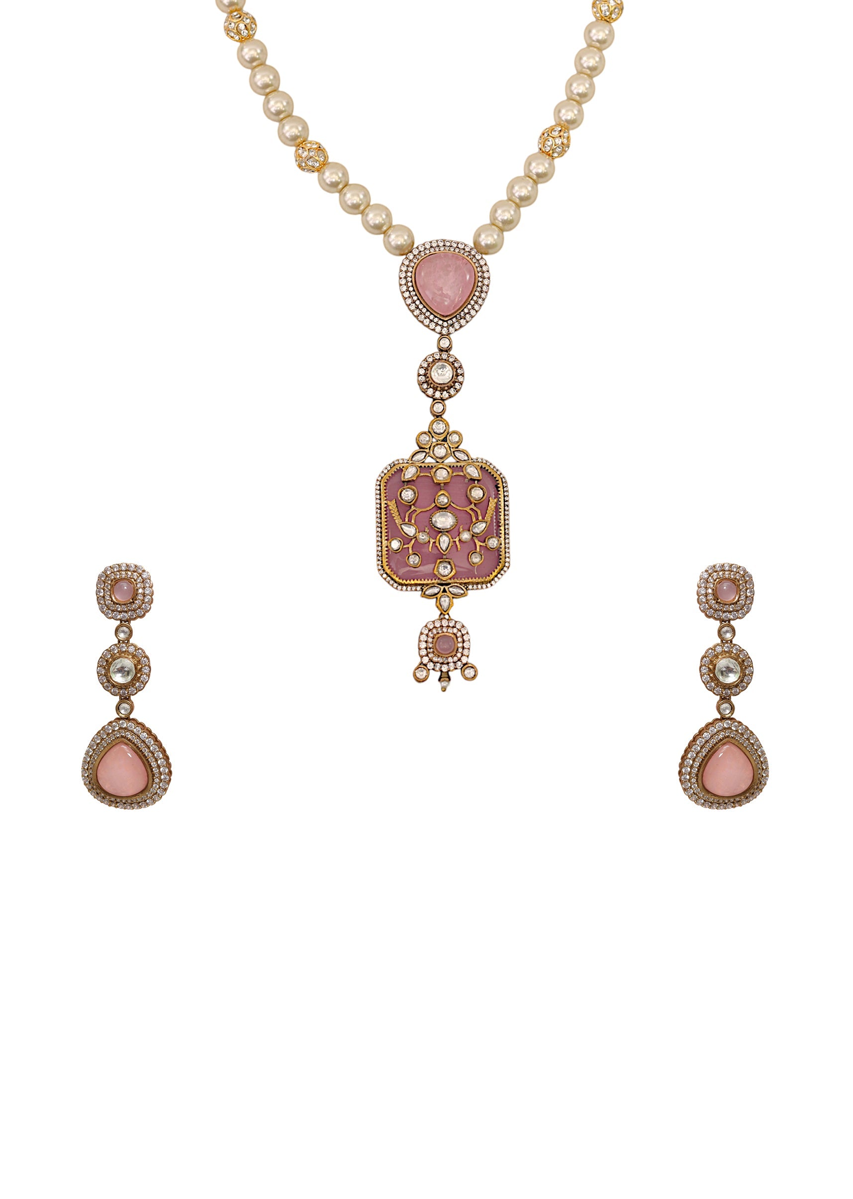 A peach fusion pendant drop necklace set featuring a radiant pendant adorned with peach-toned stones and intricate craftsmanship, exuding soft elegance and modern sophistication. Perfect for adding a graceful and... More Product Details