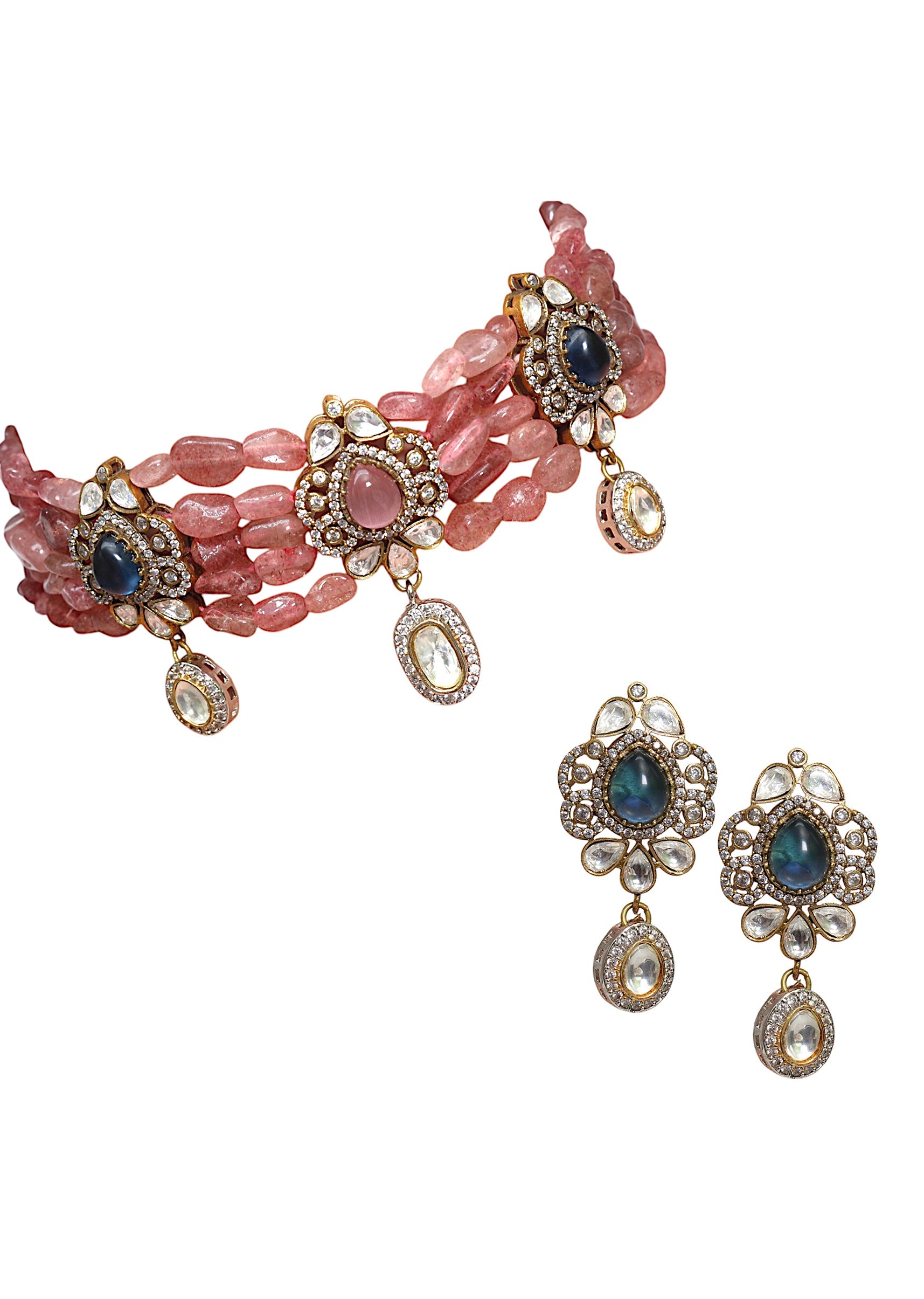 A peach fusion pendant drop stone necklace set featuring a delicately crafted pendant with peach-toned stones and fine detailing, blending soft elegance with modern charm. Perfect for adding a graceful... More Product Details
