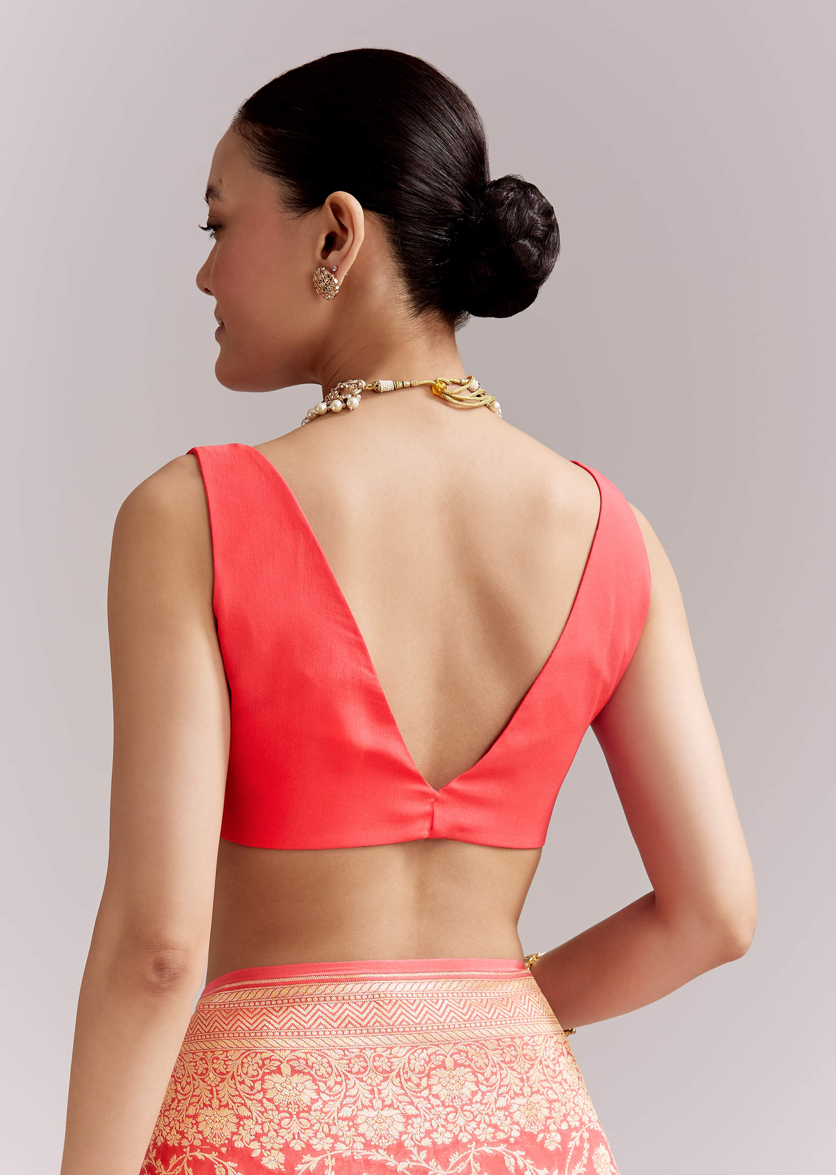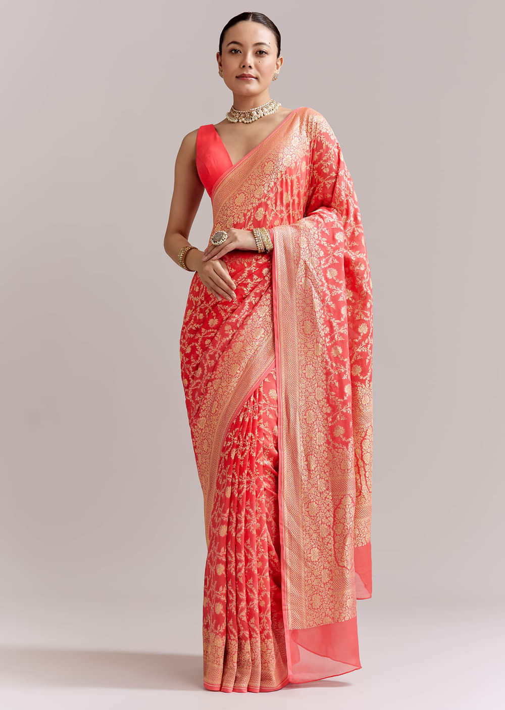 Through long celebrations, this peach georgette saree keeps energy high while feeling feather light. An all-over floral jaal meets a weighty woven border and pallu that sharpen every pleat. Best... More Product Details