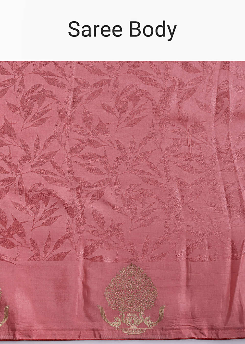 Soft and graceful in tone, this peach jacquard woven saree carries zari-woven brocade along the border and pallu for quiet shine. A contrast brocade blouse fabric gives the set a... More Product Details