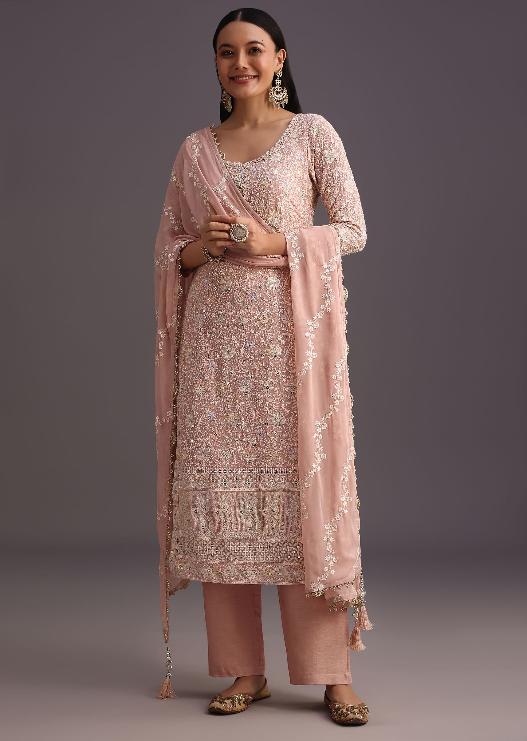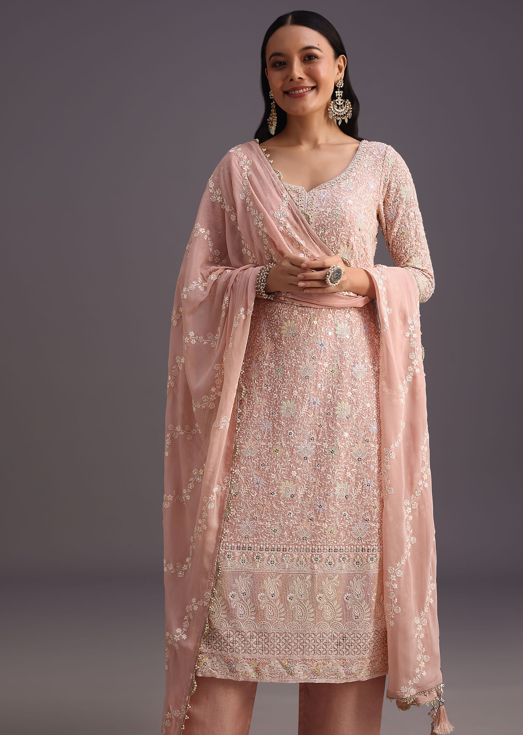 Peach Lucknowi kurta set With Resham Work Dupatta
