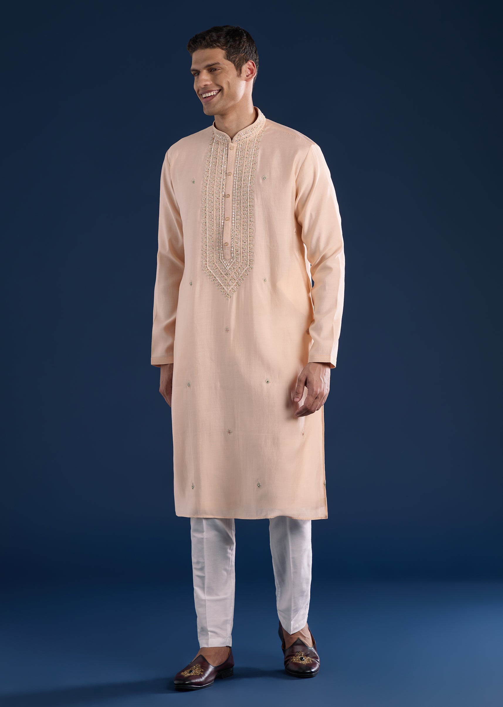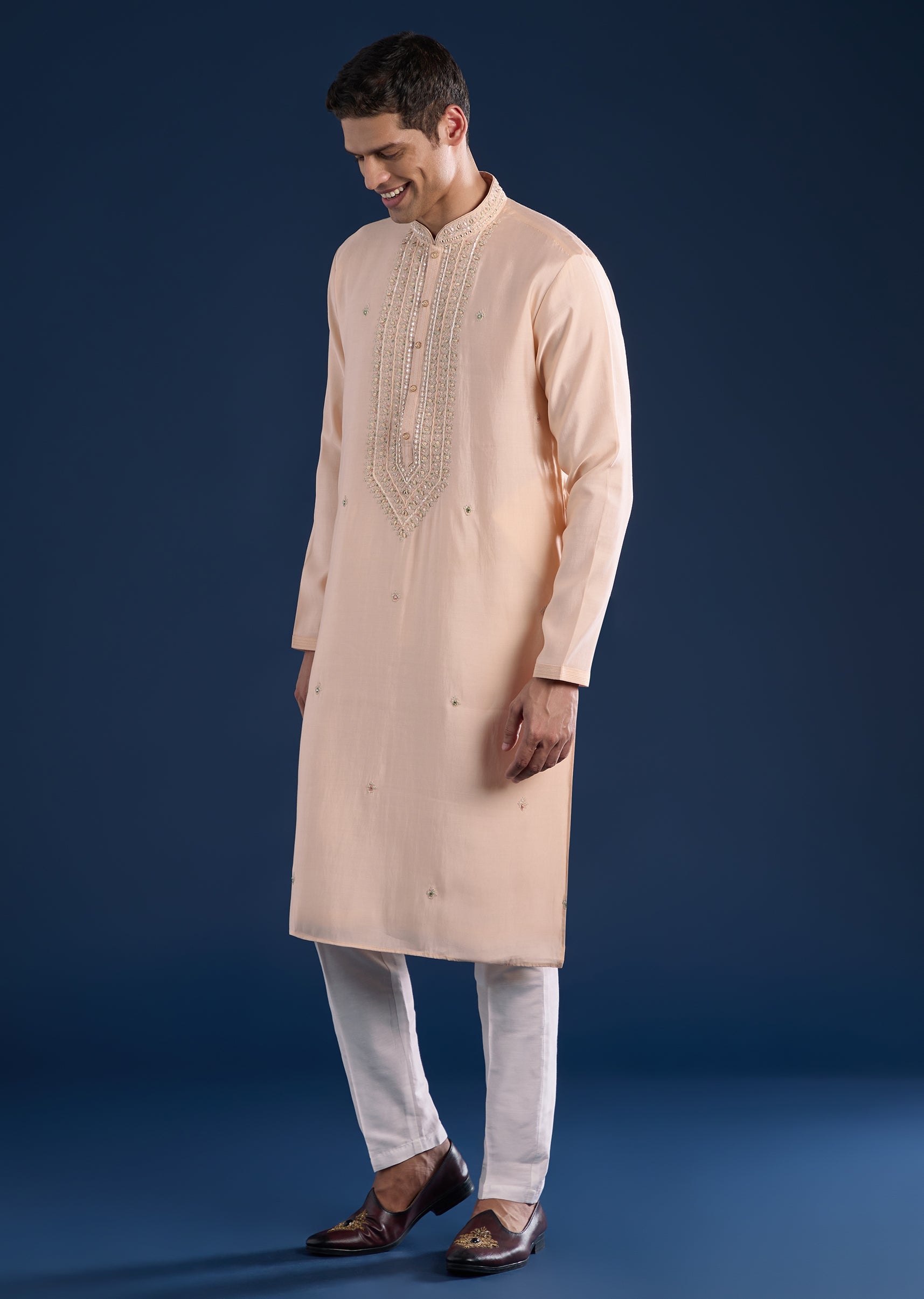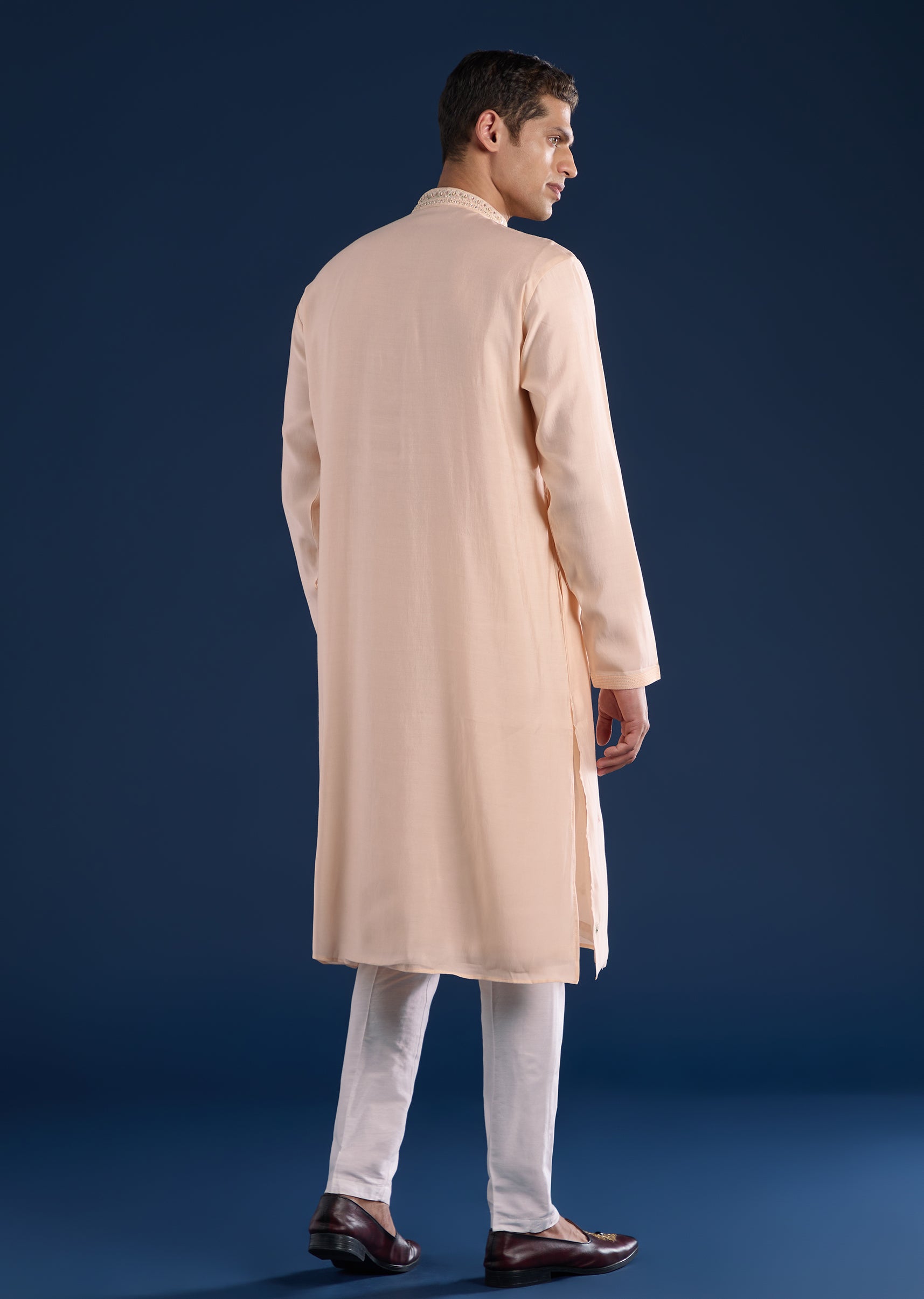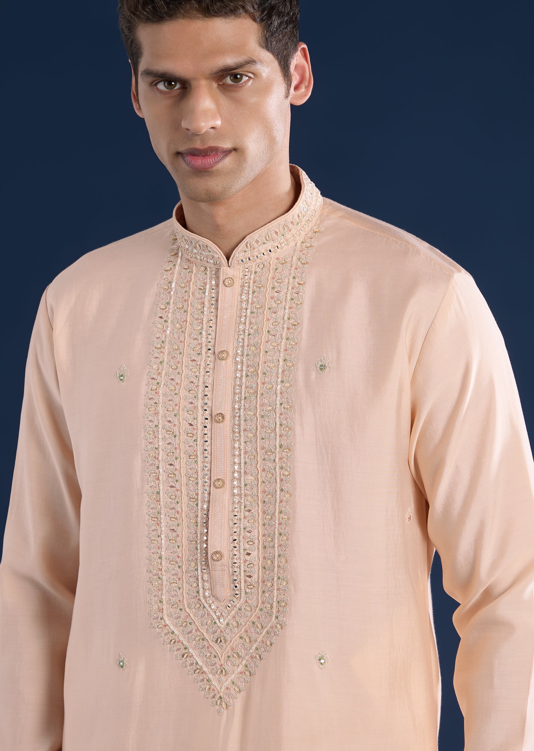 Crafted in smooth art silk, this peach kurta set brings easy elegance to pooja and festive occasions. Designed with a mandarin collar, full sleeves, and side slits, it features subtle... More Product Details