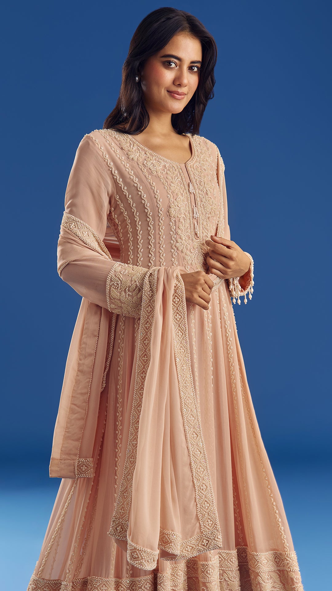 In peach georgette, this moti and bead embroidered anarkali twirls with tassel adorned dupatta edges, made for sangeet melodies. Awarded as the Most Trusted Brand, we're delivering styles you love,... More Product Details