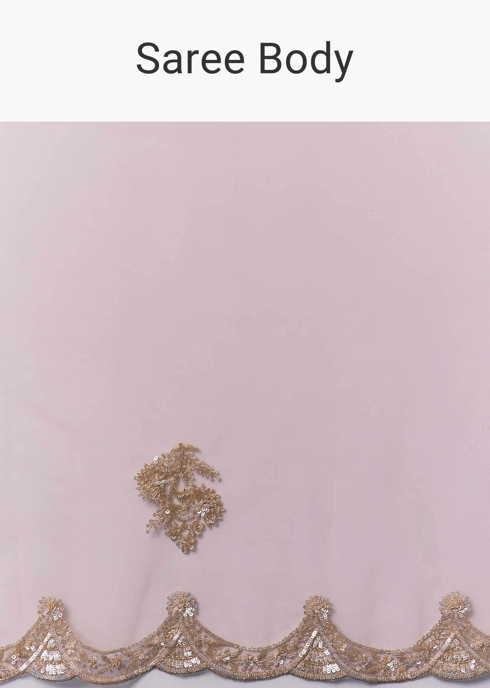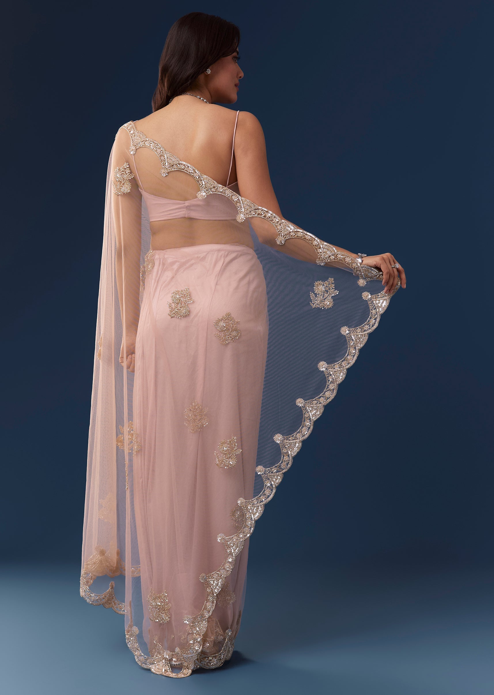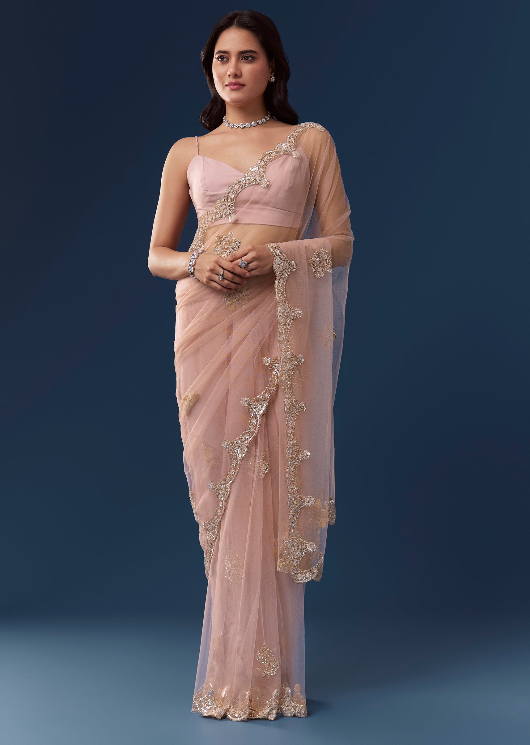 Peach Net Saree With Deep Scallop Border And Butti Embroidery