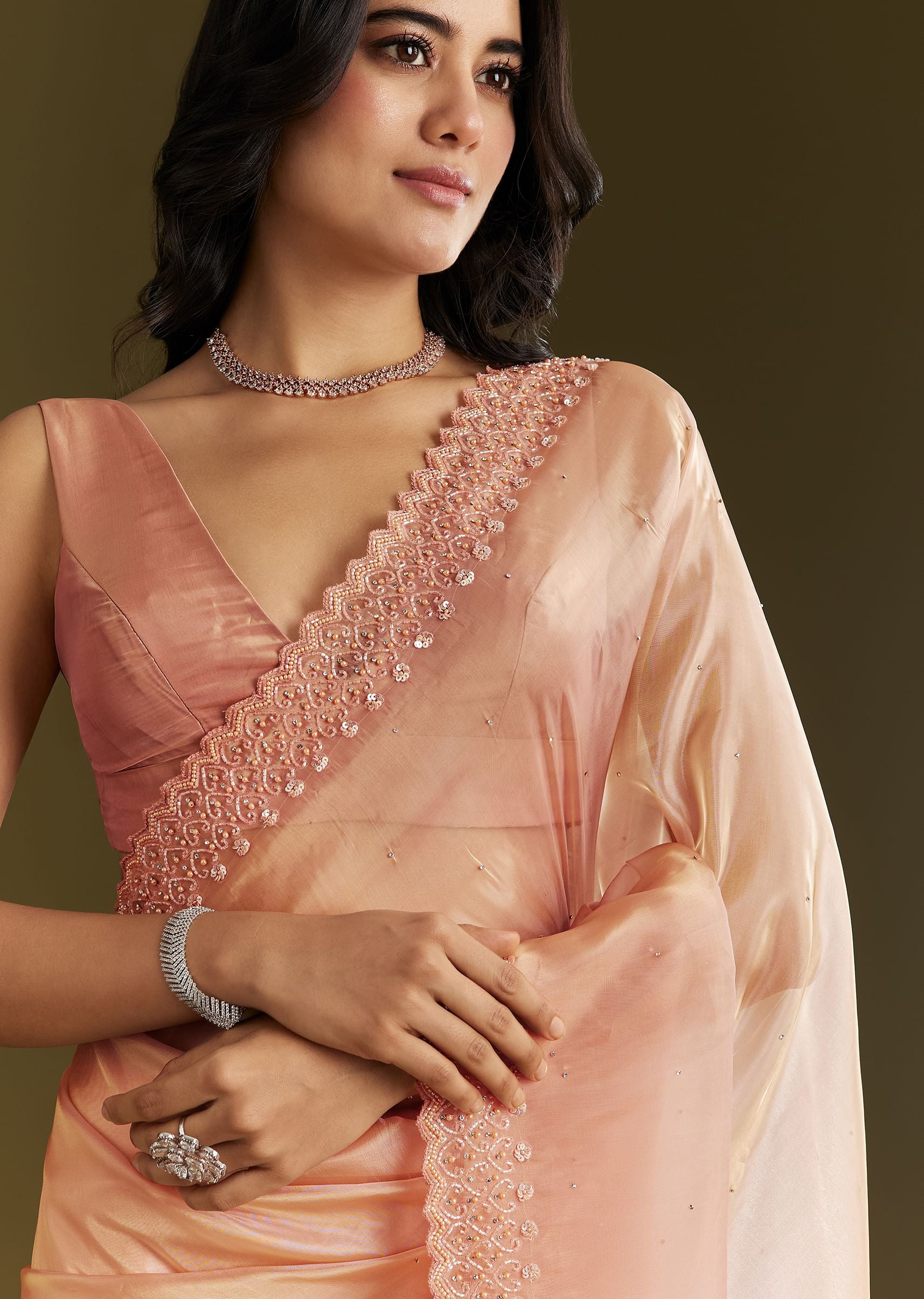 As soft as a peach blossom breeze, this organza saree glows with scalloped elegance and is delicately embellished with stones, sequins, and bead embroidery—perfect for morning rituals or twilight reveries. Awarded as the Most Trusted Brand, we're delivering styles you love, just as promised.