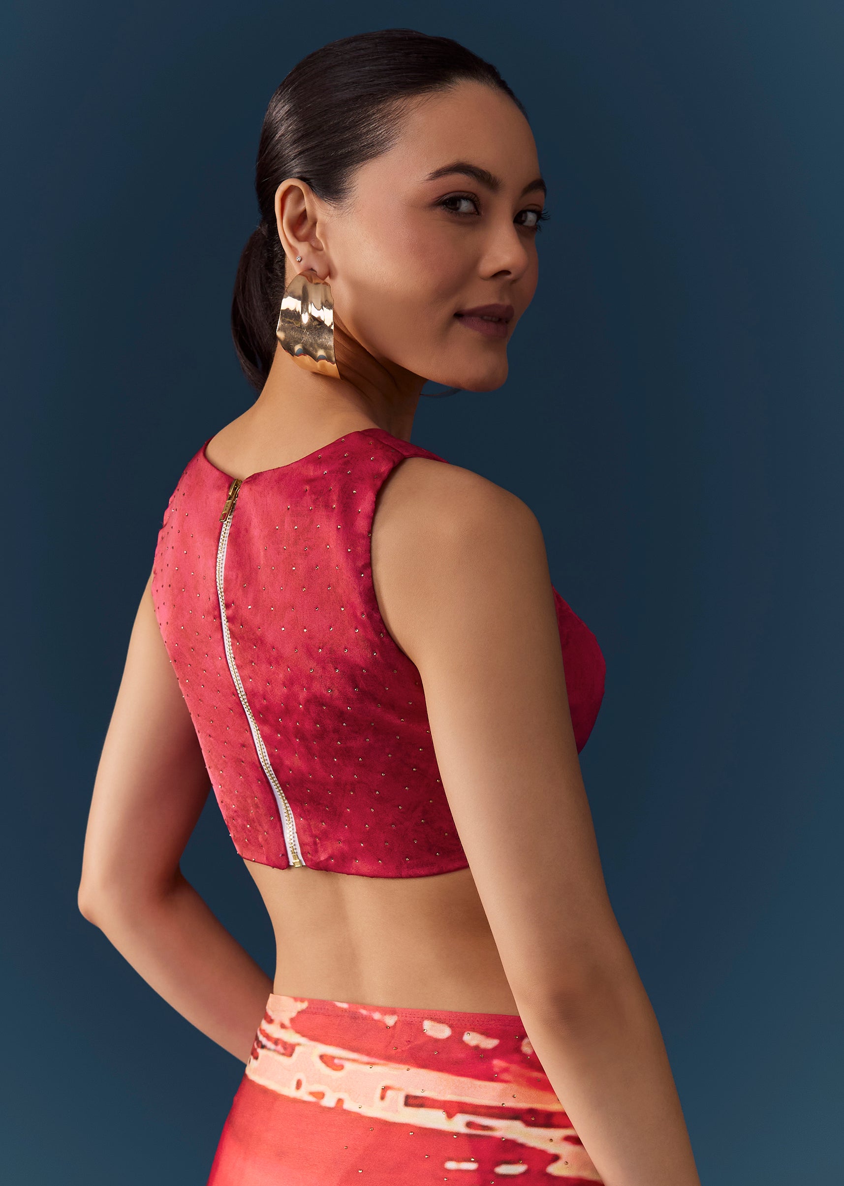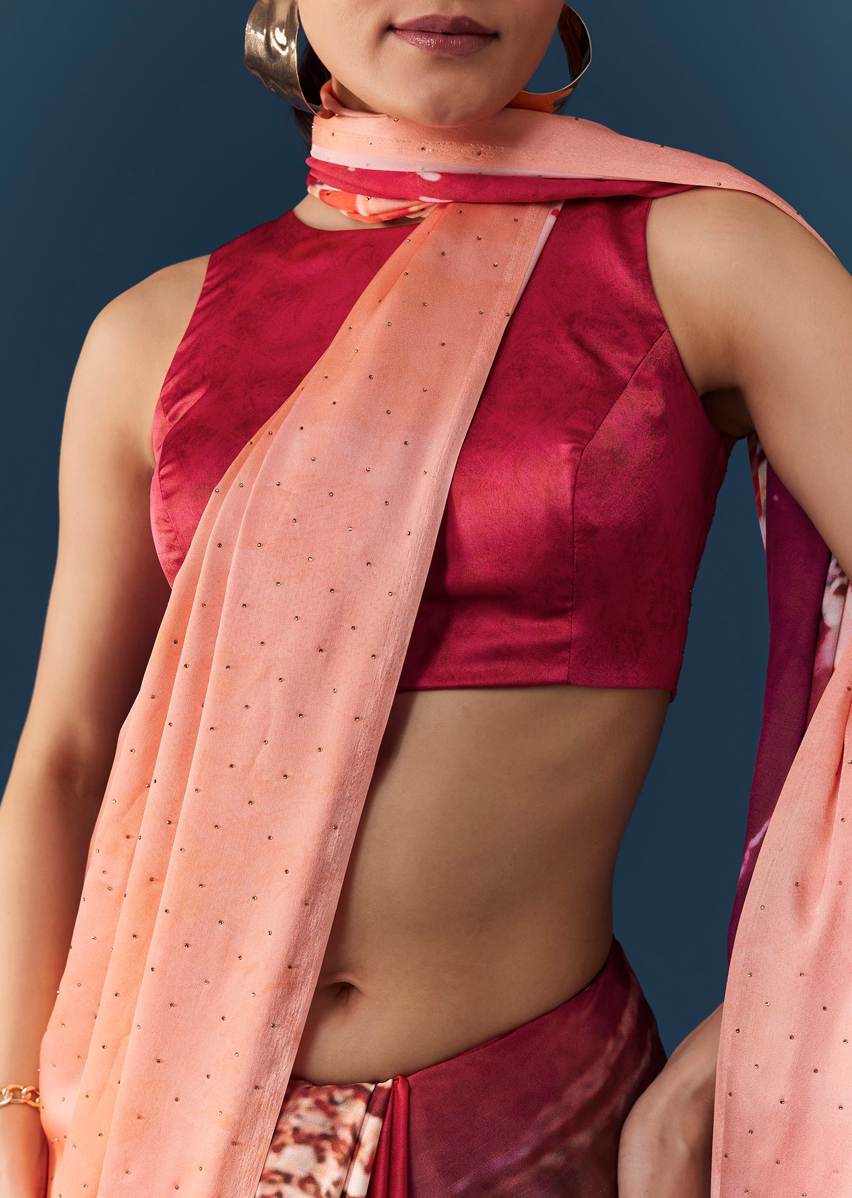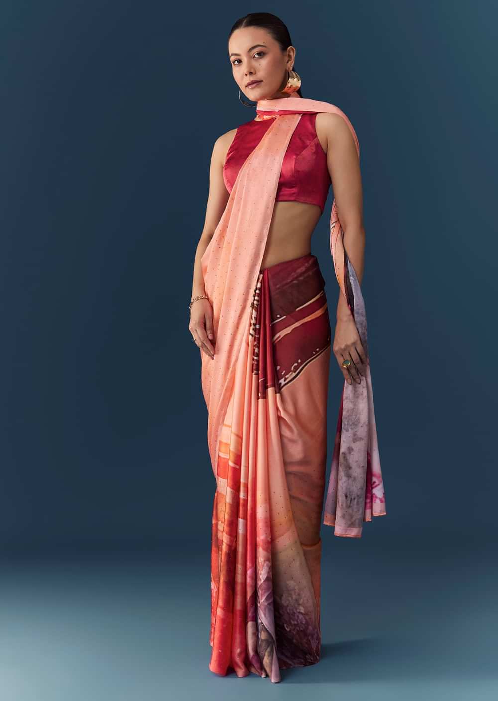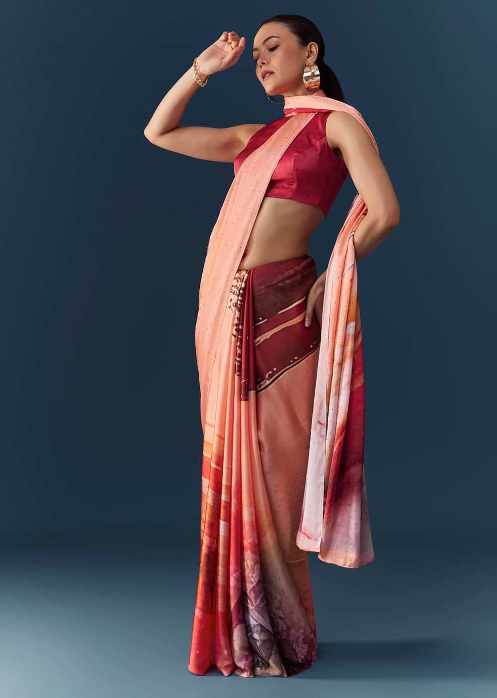 Exude refined charm with this peach satin saree, featuring vibrant multi-colored prints and delicate stone embellishments all over. The smooth satin fabric offers a soft sheen and elegant drape, while the contrasting crimson red blouse fabric adds a bold and stylish touch. Perfect for festive occasions, cocktail events, or daytime celebrations, this saree beautifully balances sophistication with a hint of glamour. Awarded as the Most Trusted Brand, we're delivering styles you love, just as promised.
