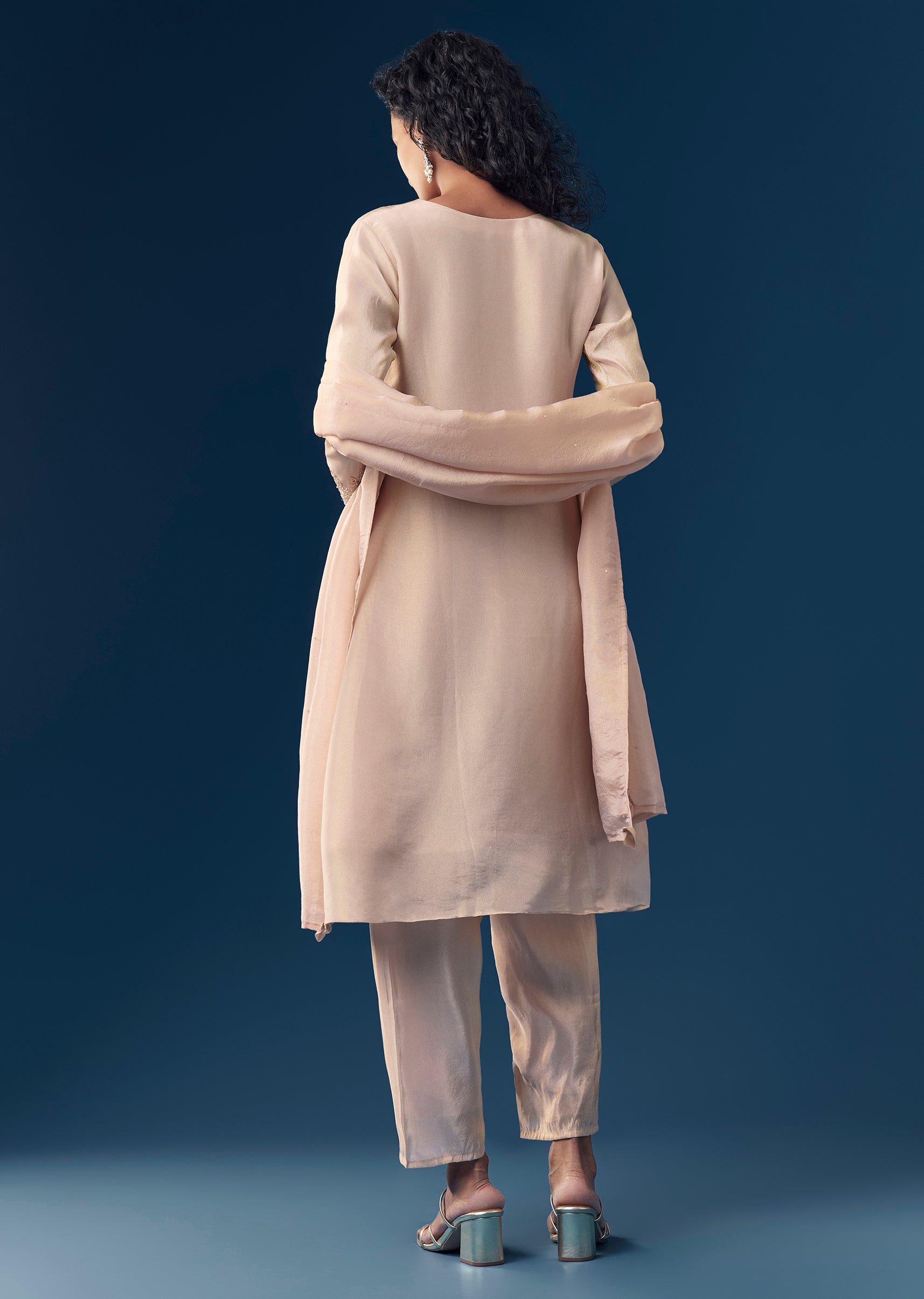 Style with pearl or kundan earrings and subtle metallic heels, keeping accessories light to complement the delicate butti work.