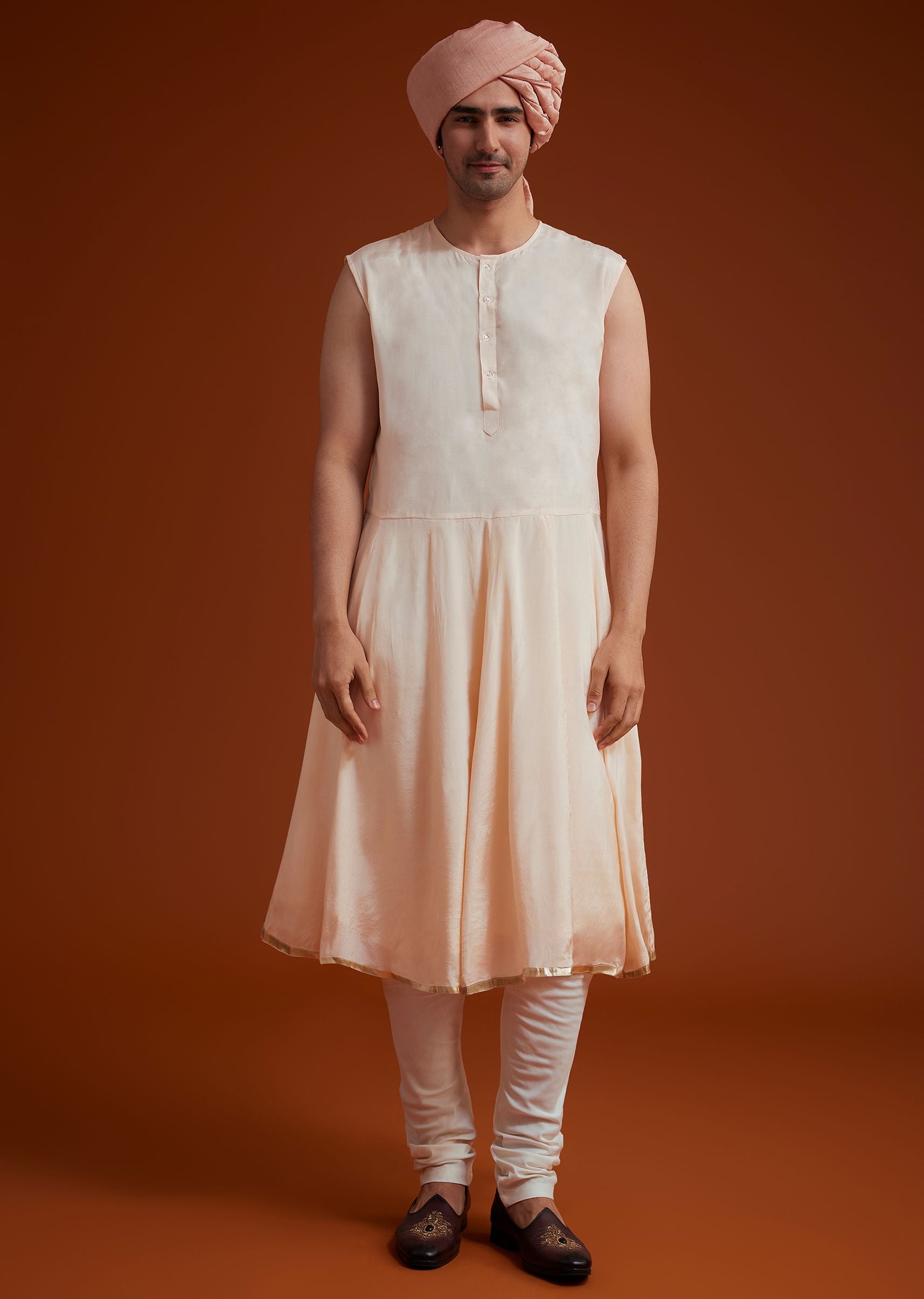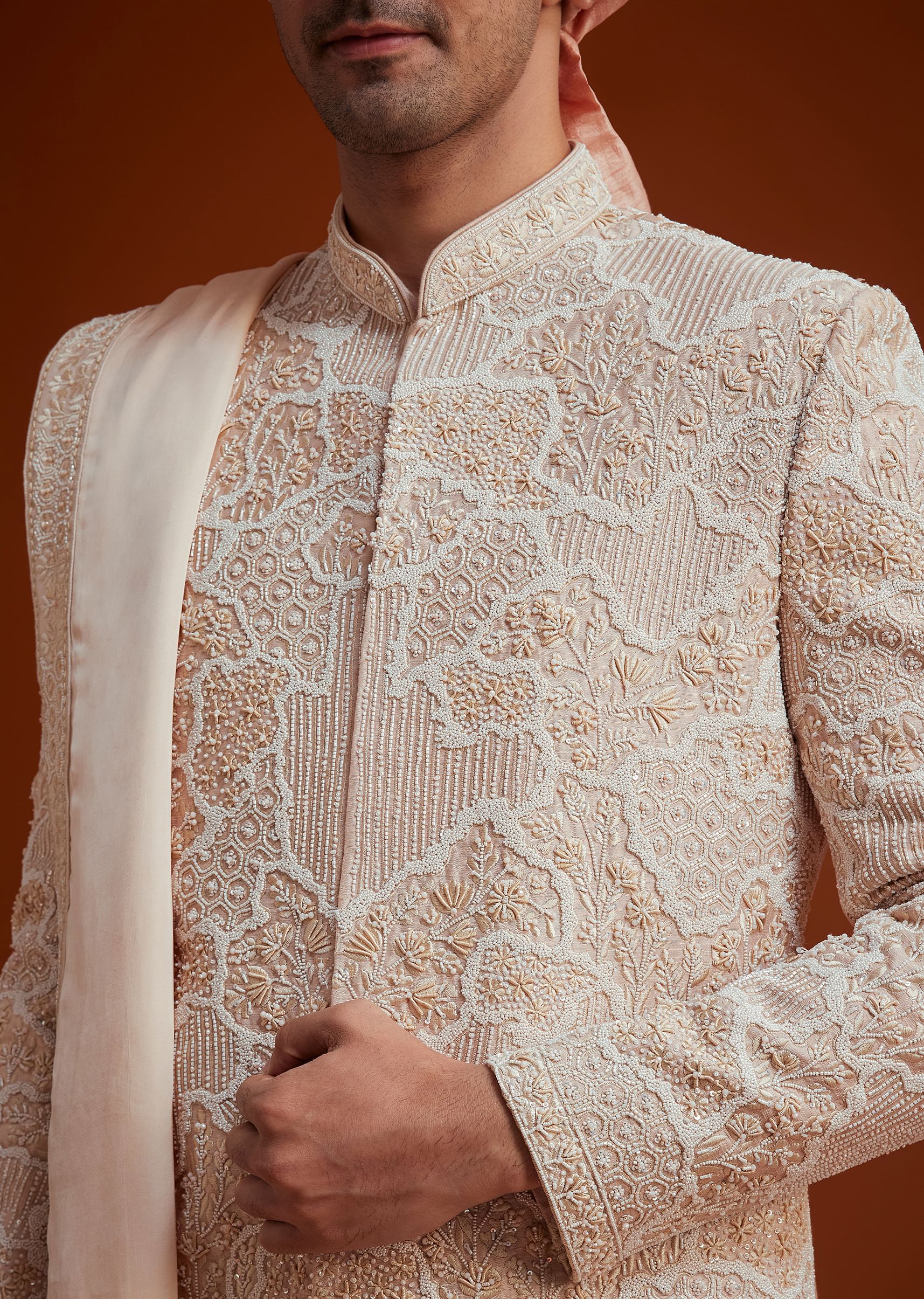 This peach sherwani exudes grace with its intricate tonal embroidery, blending bead and threadwork in a seamless symphony of craftsmanship. The delicate detailing across the fabric lends a regal aura, making it an impeccable choice for weddings and grand festivities. Paired with a matching embroidered stole, it elevates the ensemble with understated sophistication. A timeless piece that beautifully balances tradition and modern elegance. Awarded as the Most Trusted Brand, we're delivering styles you love, just as promised.