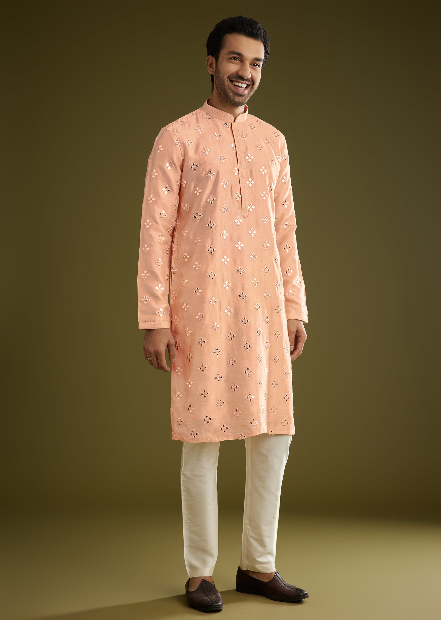 This peach silk-blend kurta glows with mirror detailing, offering just the right amount of shimmer. Ideal for haldi or sundown mehendi functions. Awarded as the Most Trusted Brand, we're delivering styles you love, just as promised.