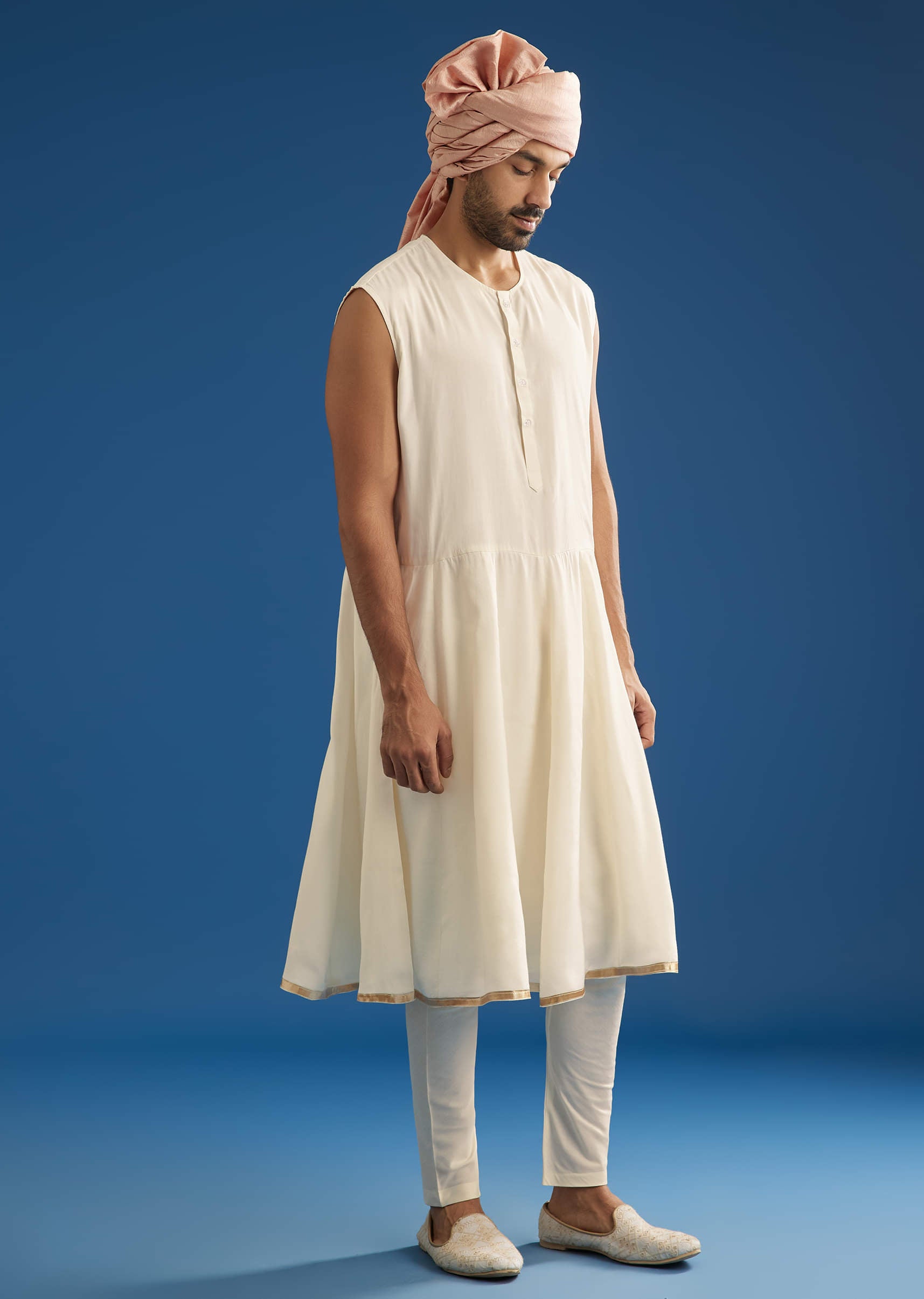 This light peach silk sherwani dazzles with traditional thread and zardosi work, tailored for the modern groom. Rich detailing adds regal depth. Awarded as the Most Trusted Brand, we're delivering styles you love, just as promised.