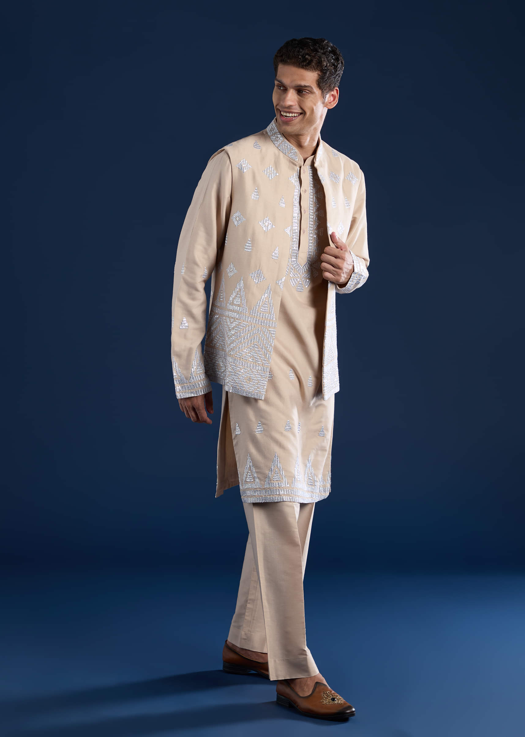 A blend of elegance and subtle opulence, this peach silk jacket and kurta set with matching pants exudes refined charm. The soft blend of art silk fabric is beautifully accented with intricate zari and sequin work, adding a delicate shimmer that enhances the pastel hue. Perfect for daytime weddings, or evening gatherings, this ensemble strikes the ideal balance between traditional craftsmanship and modern sophistication. Awarded as the Most Trusted Brand, we're delivering styles you love, just as promised.
