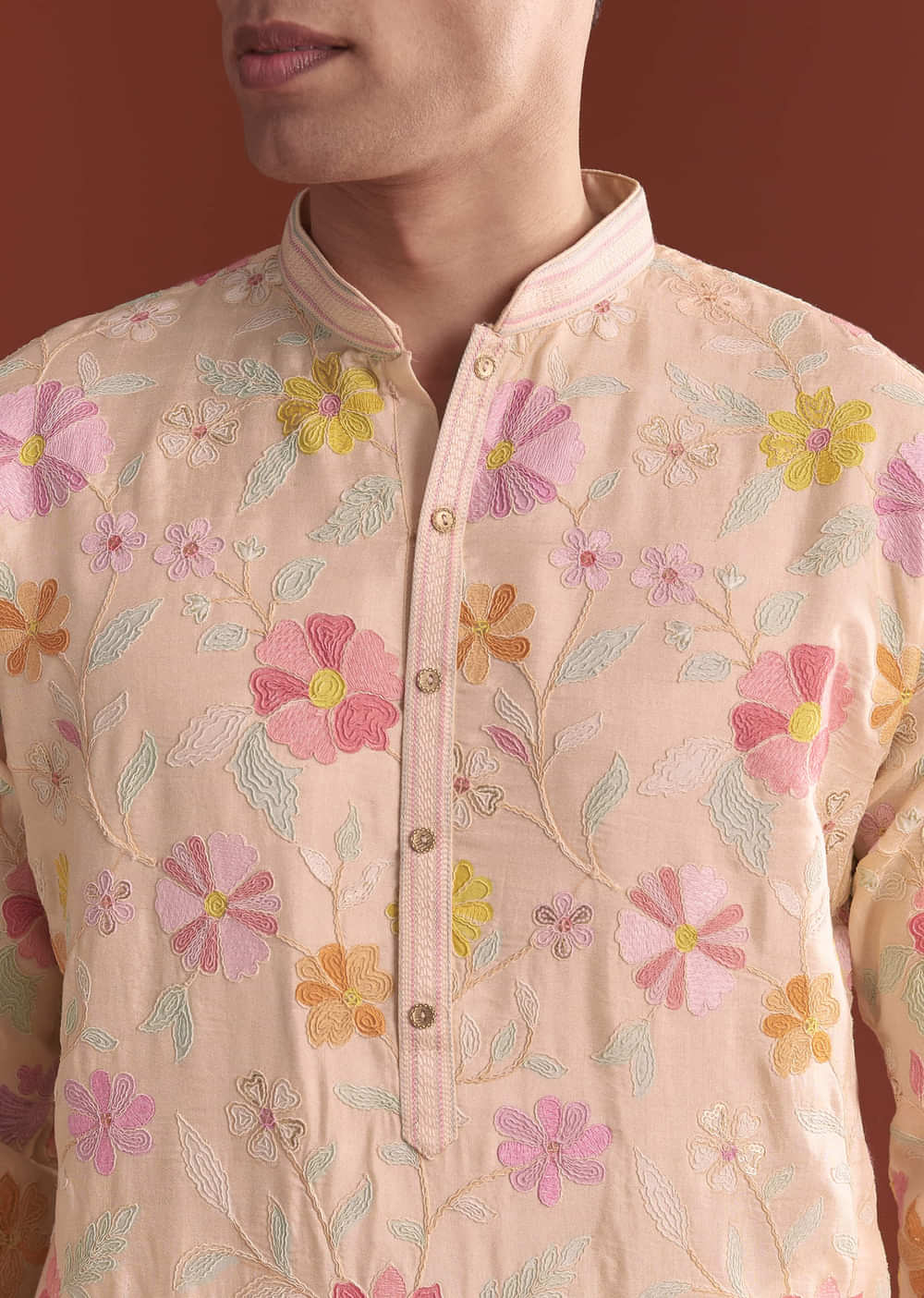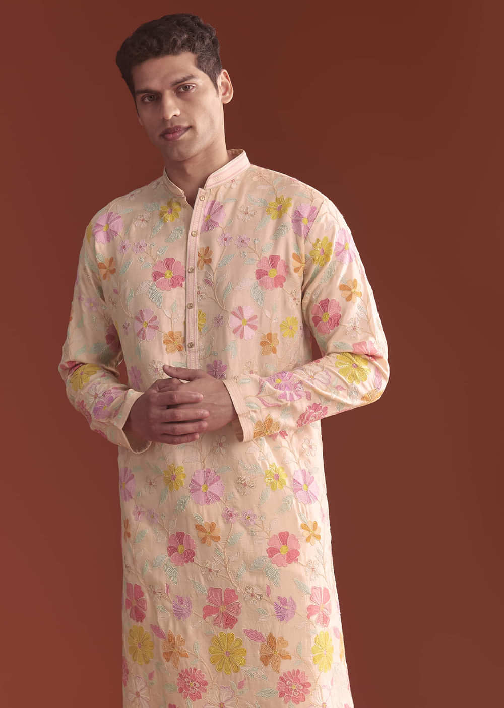 In daylight, this peach silk men’s kurta set frames the collar and front with neat floral thread work for a gentle, crafted highlight. The shade looks soft in person and... More Product Details