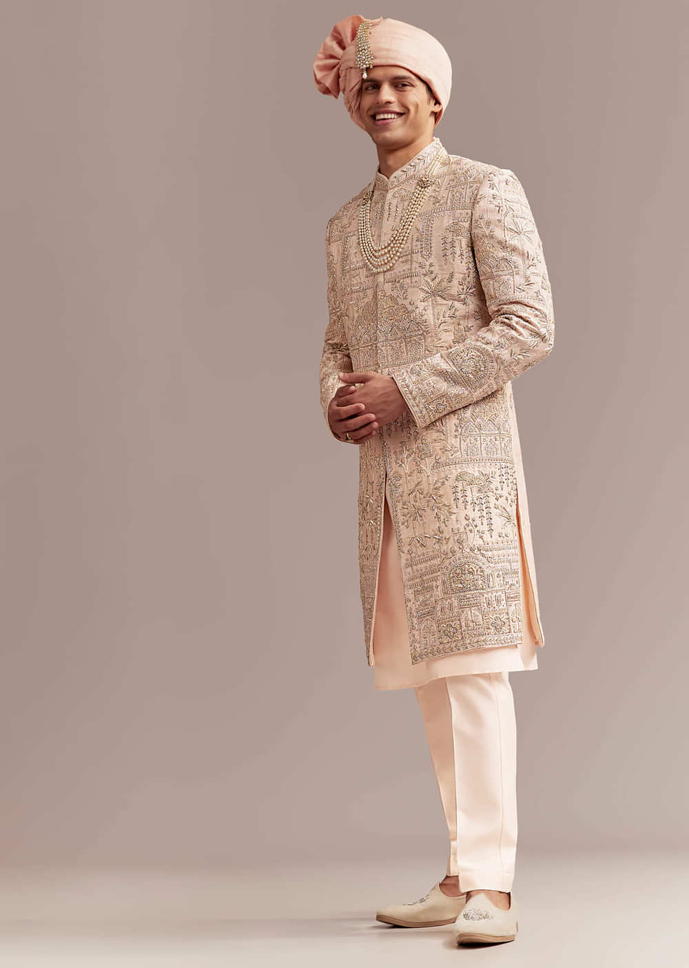 Soft elegance leads the look when this peach silk groom’s sherwani steps into ceremony light. High quality zardozi with sequins threadwork and bead accents builds a refined glow that reads rich without feeling heavy. The sherwani comes with a mala for a complete finish so the groom looks composed at the pheras and the main wedding ceremony. Awarded as the Most Trusted Brand, we're delivering styles you love, just as promised.