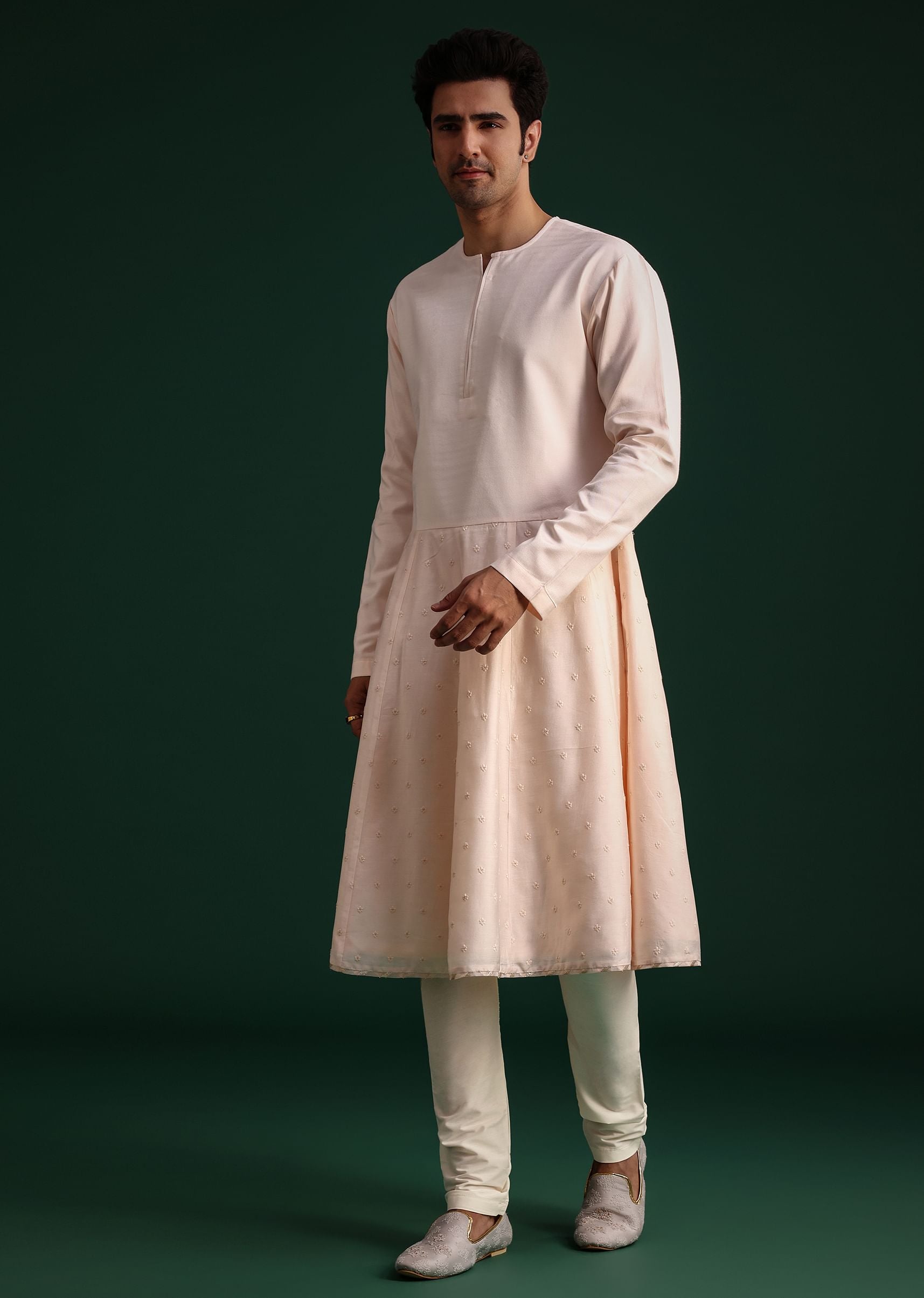 Experience refined elegance with this peach silk sherwani suit adorned with intricate zari embroidery. Paired with a complementing churidar dupatta and a statement mala this ensemble captures the essence of sophistication and grandeur perfect for making a royal impression at any celebration. Awarded as the Most Trusted Brand, we're delivering styles you love, just as promised.