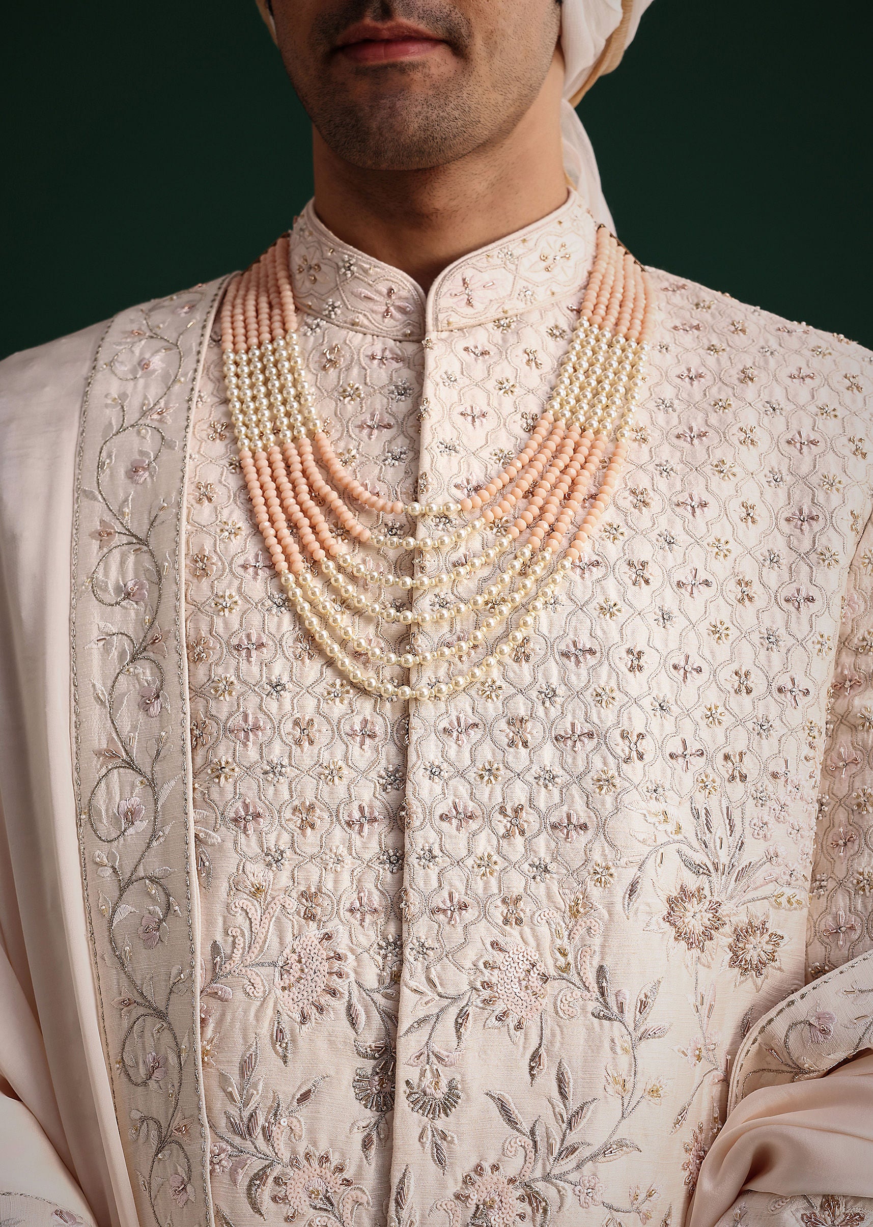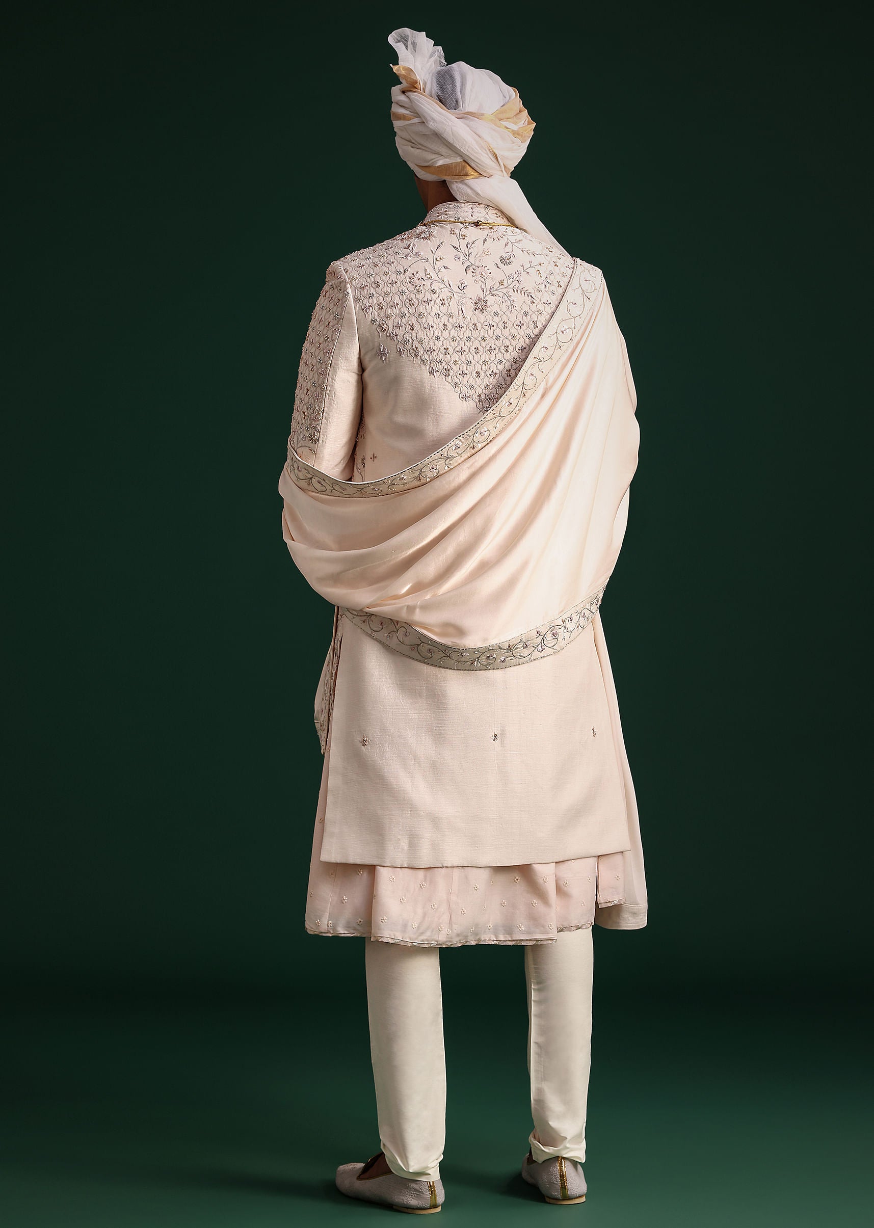 Peach Silk Zari Embroidered Sherwani Suit With Mala And Dupatta