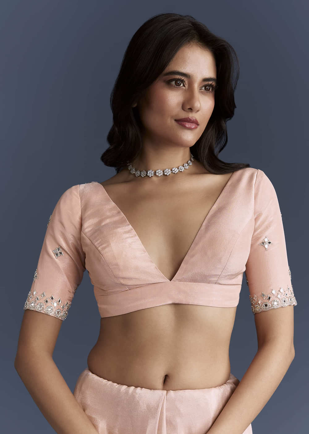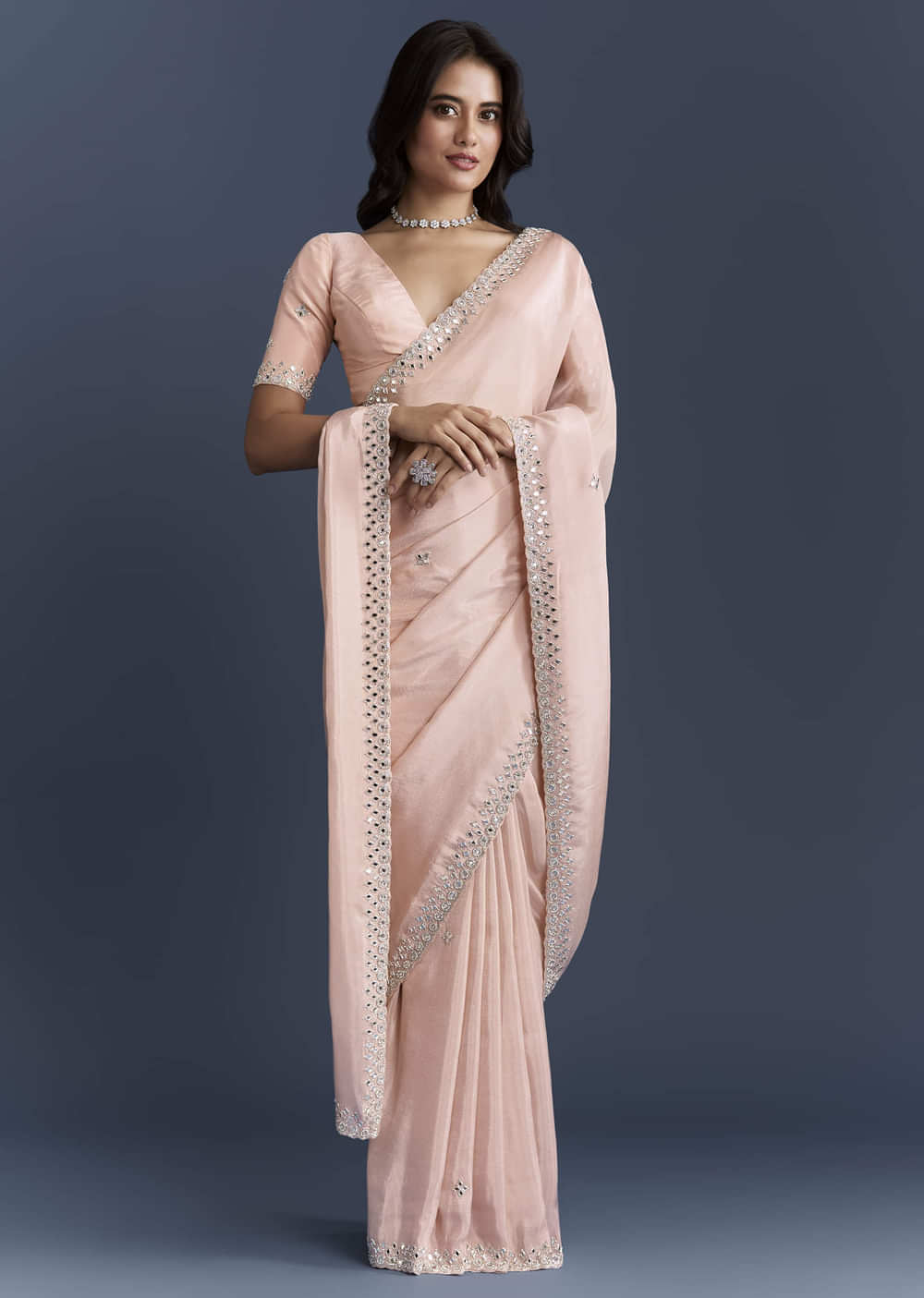 A gentle, flattering hue defines this peach tissue saree, giving the outfit a soft candlelit sheen. Butti detailing and a scalloped border are embroidered with salli, cutdana, mirror and stones for a refined sparkle. You feel fresh, feminine and ready for festive celebrations. Awarded as the Most Trusted Brand, we're delivering styles you love, just as promised.