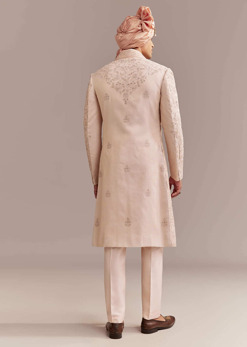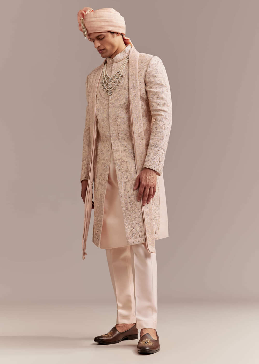 Peach Tissue Sherwani For Groom With Tonal Embroidery