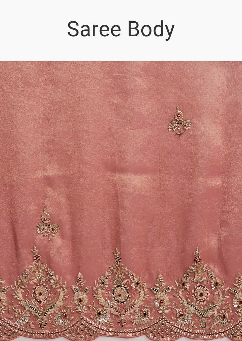 Peach Tissue Silk Saree With Heavy Hand Embroidery