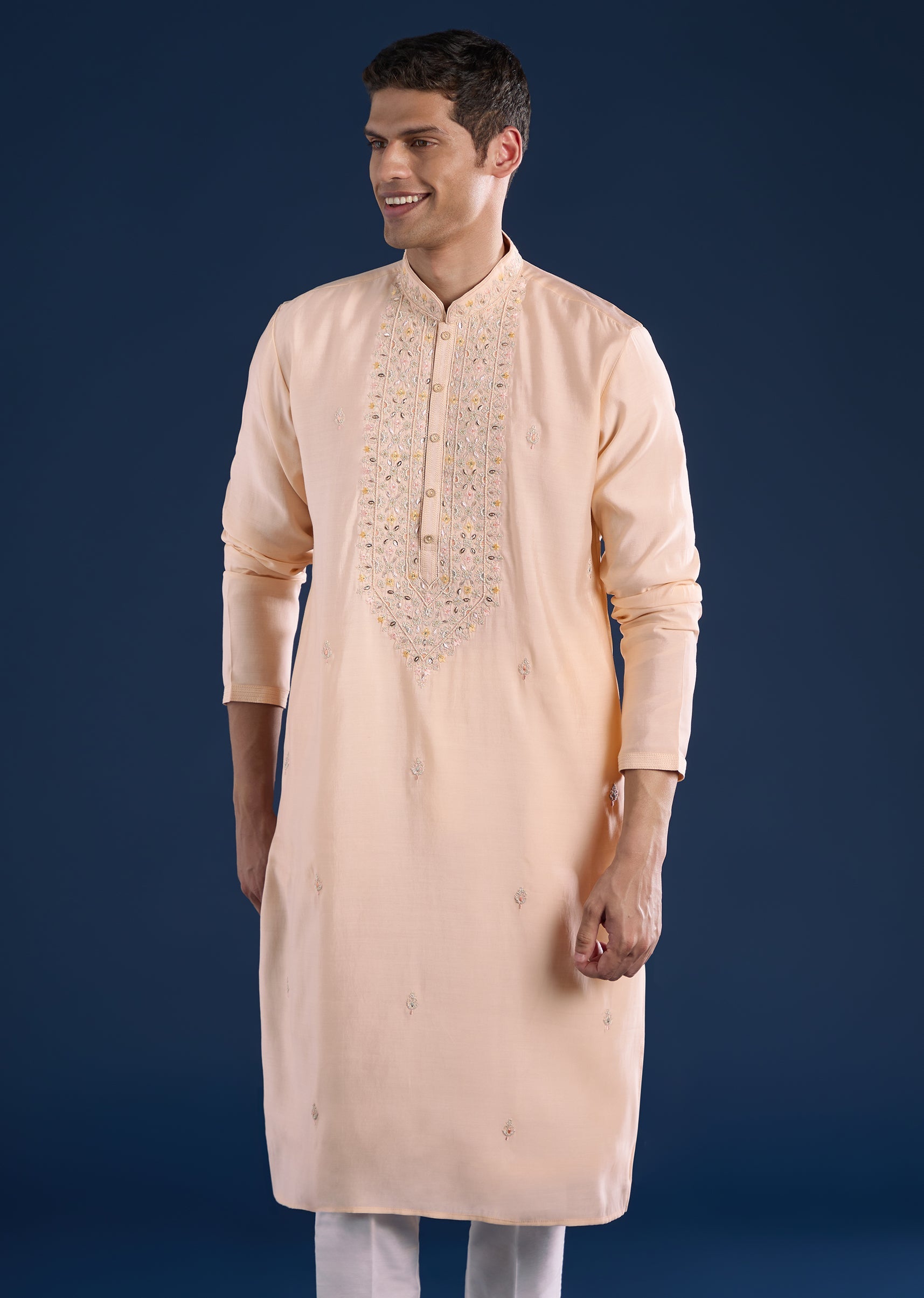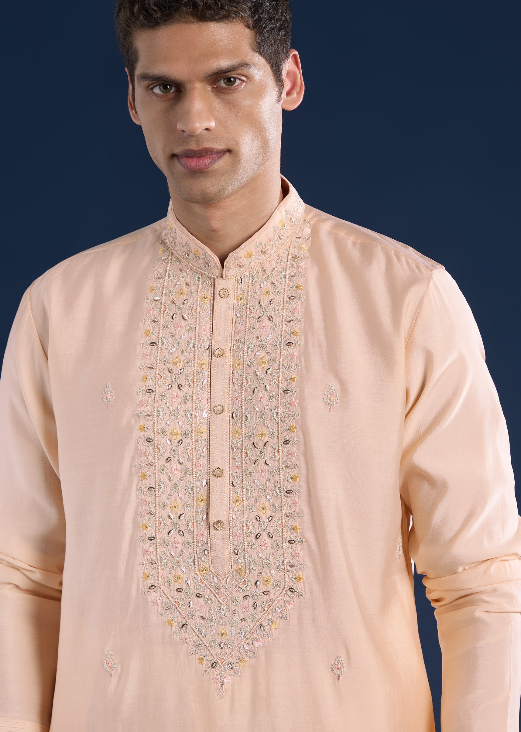 This peach kurta set is crafted in art silk and detailed with resham thread, zari highlights, and refined motifs for a subtle festive lift. Finished with a mandarin collar, full... More Product Details