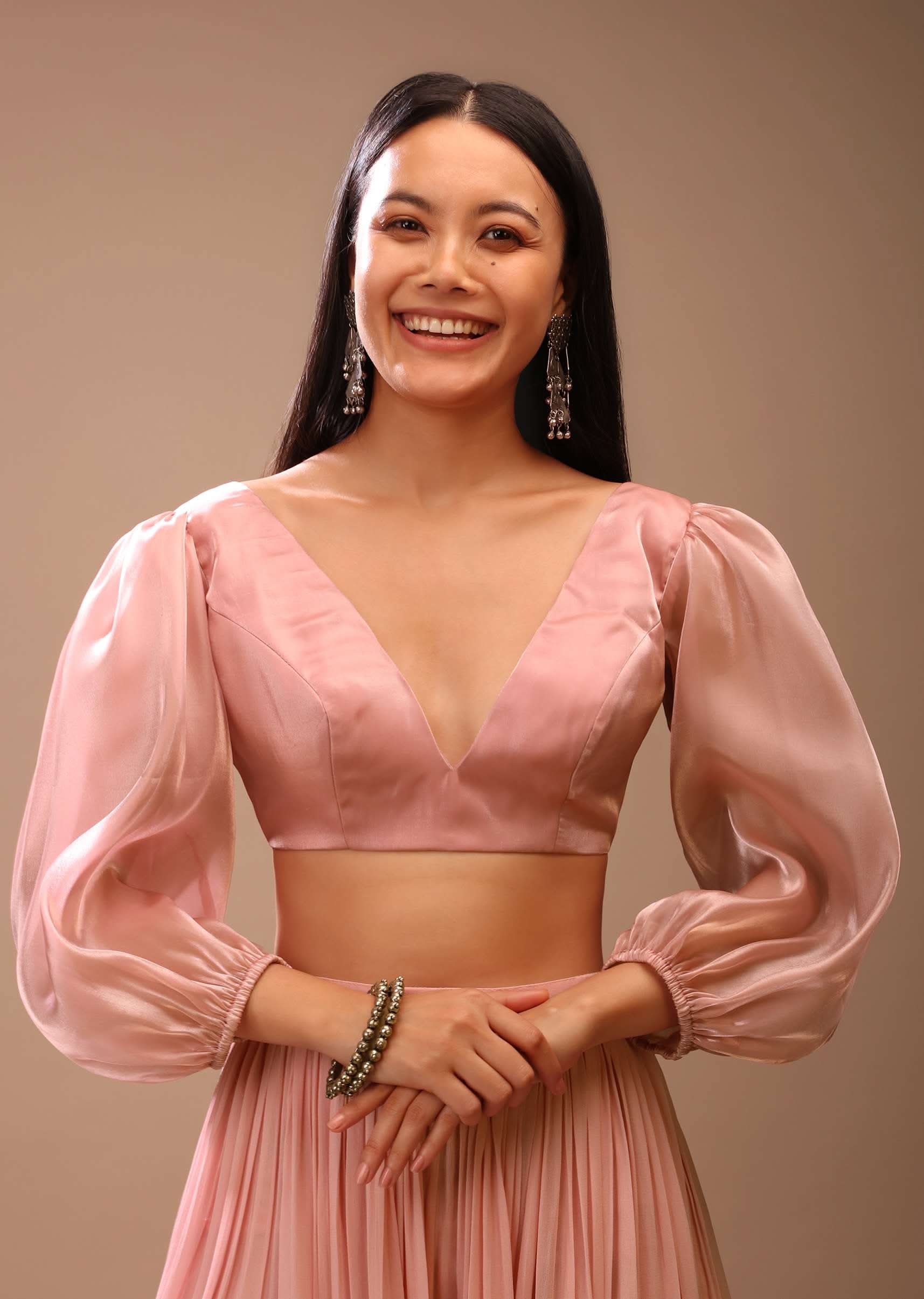 Peach skin Blouse In Organza With Plunging V Neckline And Three Quarter Balloon Sleeves
