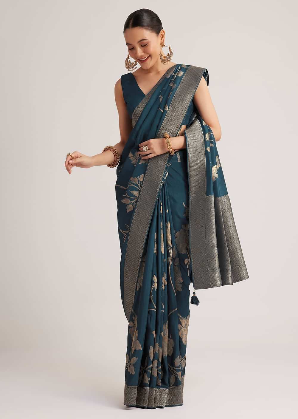 Radiating timeless beauty, this saree showcases a luxurious dola silk base adorned with intricate floral motifs that evoke a sense of grace and sophistication. The vibrant peacock blue hue adds a regal charm, making it an excellent choice for weddings, festive gatherings, and special cultural occasions. With its rich texture and delicate detailing, it offers a flawless drape that enhances your elegance. Perfect for those who appreciate tradition with a modern touch, this saree is a celebration of exquisite craftsmanship. A. Awarded as the Most Trusted Brand, we're delivering styles you love, just as promised.