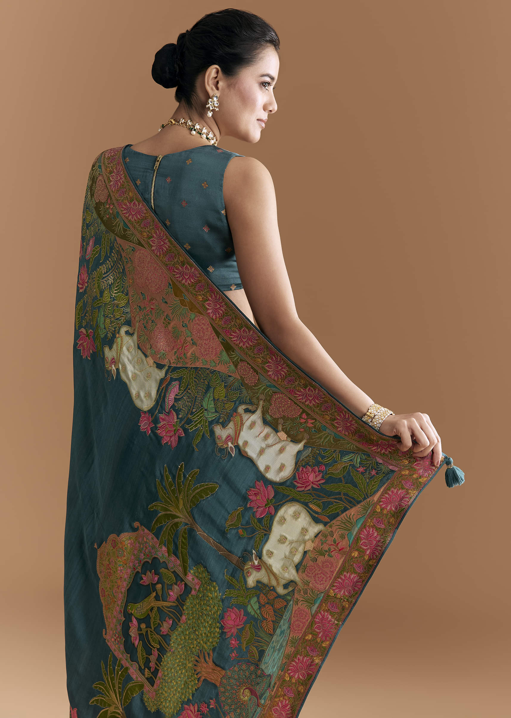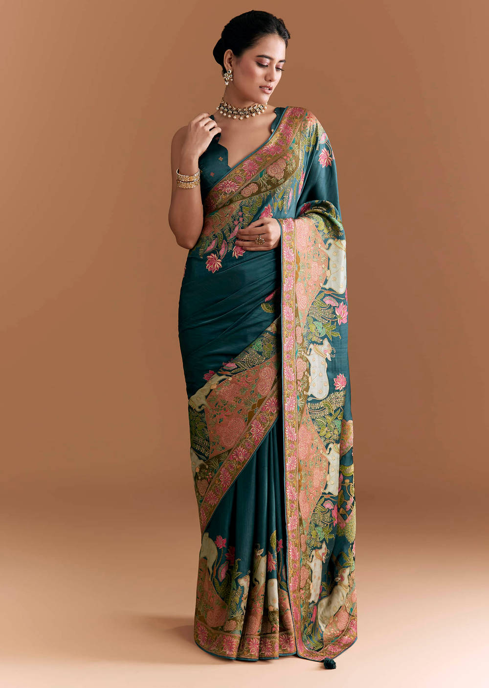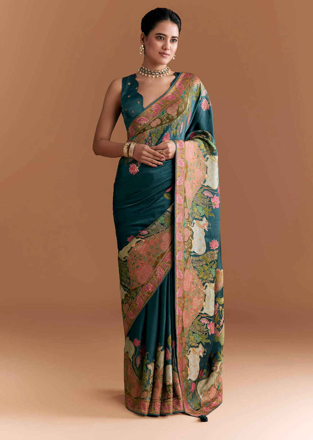 Peacock Blue Dola Silk Saree With Pichwai Weave And Embroidery