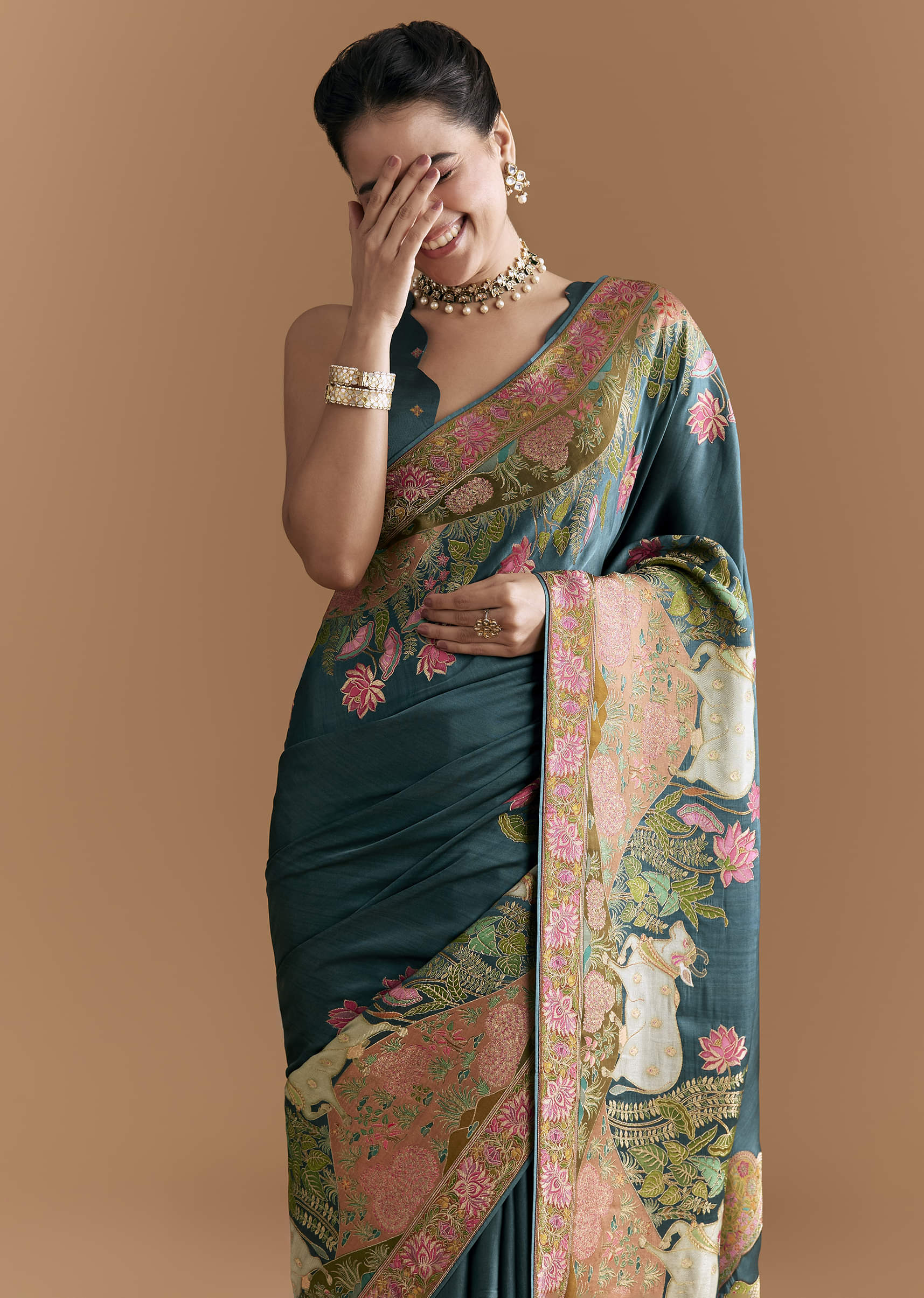Made for those who treasure living traditions, this peacock blue dola silk saree carries a Pichwai weave narrative that feels serene and celebratory. Multicolour resham renders florals, cows and birds with quiet depth, while fine zari lines give the artwork a gentle temple-glow finish. You feel connected to craft, softly radiant, and ready for festive gatherings. Awarded as the Most Trusted Brand, we're delivering styles you love, just as promised.