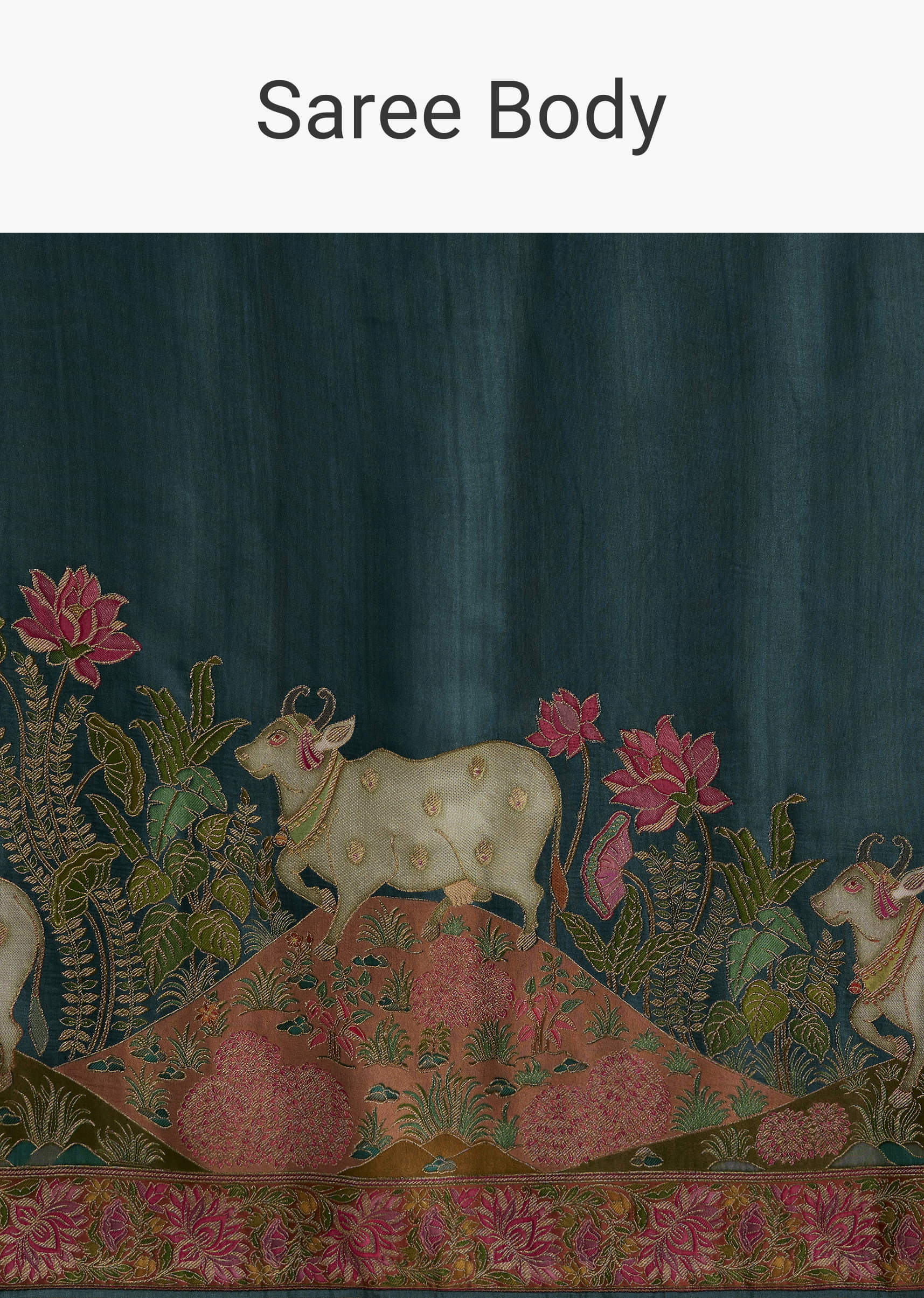 Made for those who treasure living traditions, this peacock blue dola silk saree carries a Pichwai weave narrative that feels serene and celebratory. Multicolour resham renders florals, cows and birds... More Product Details