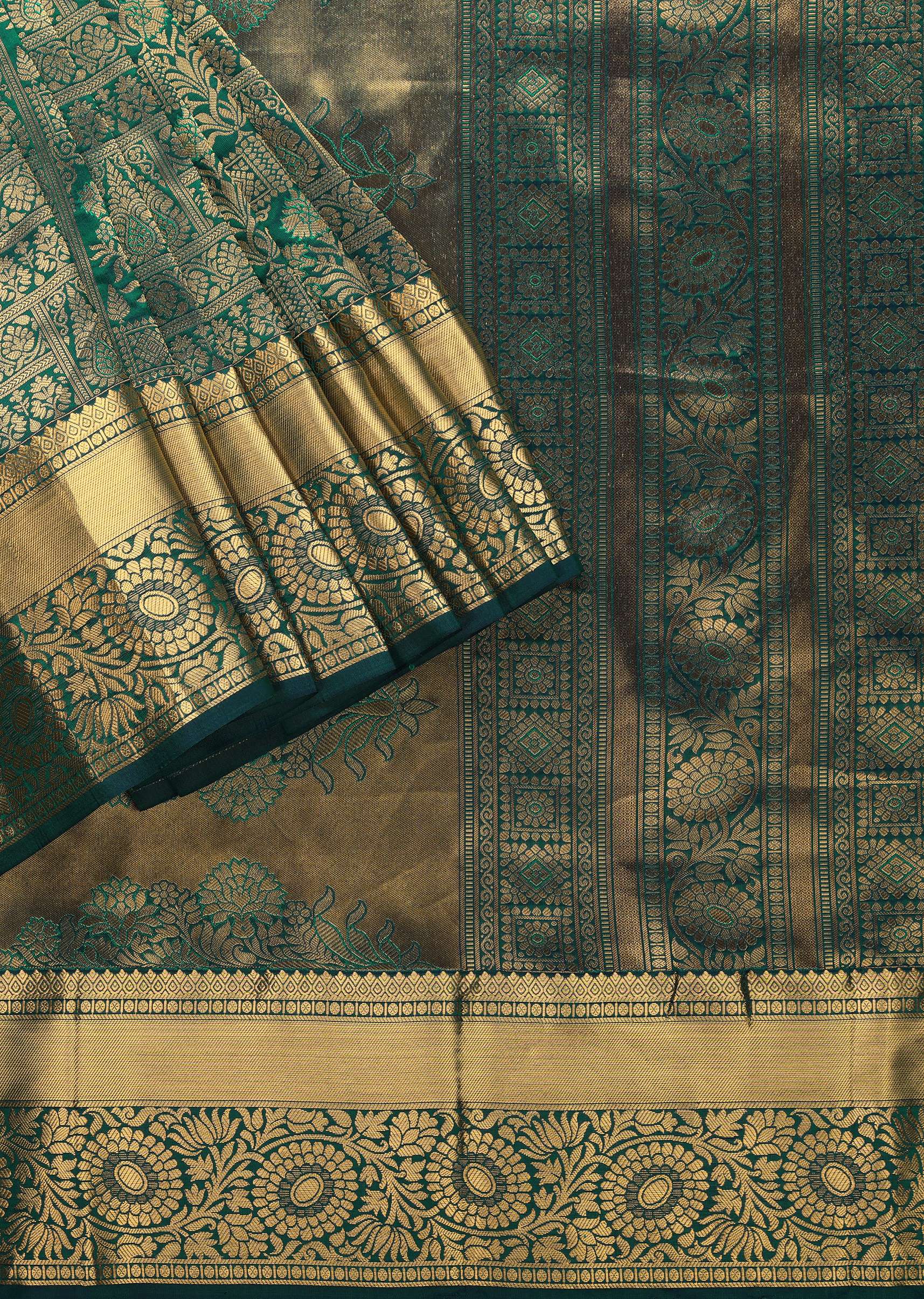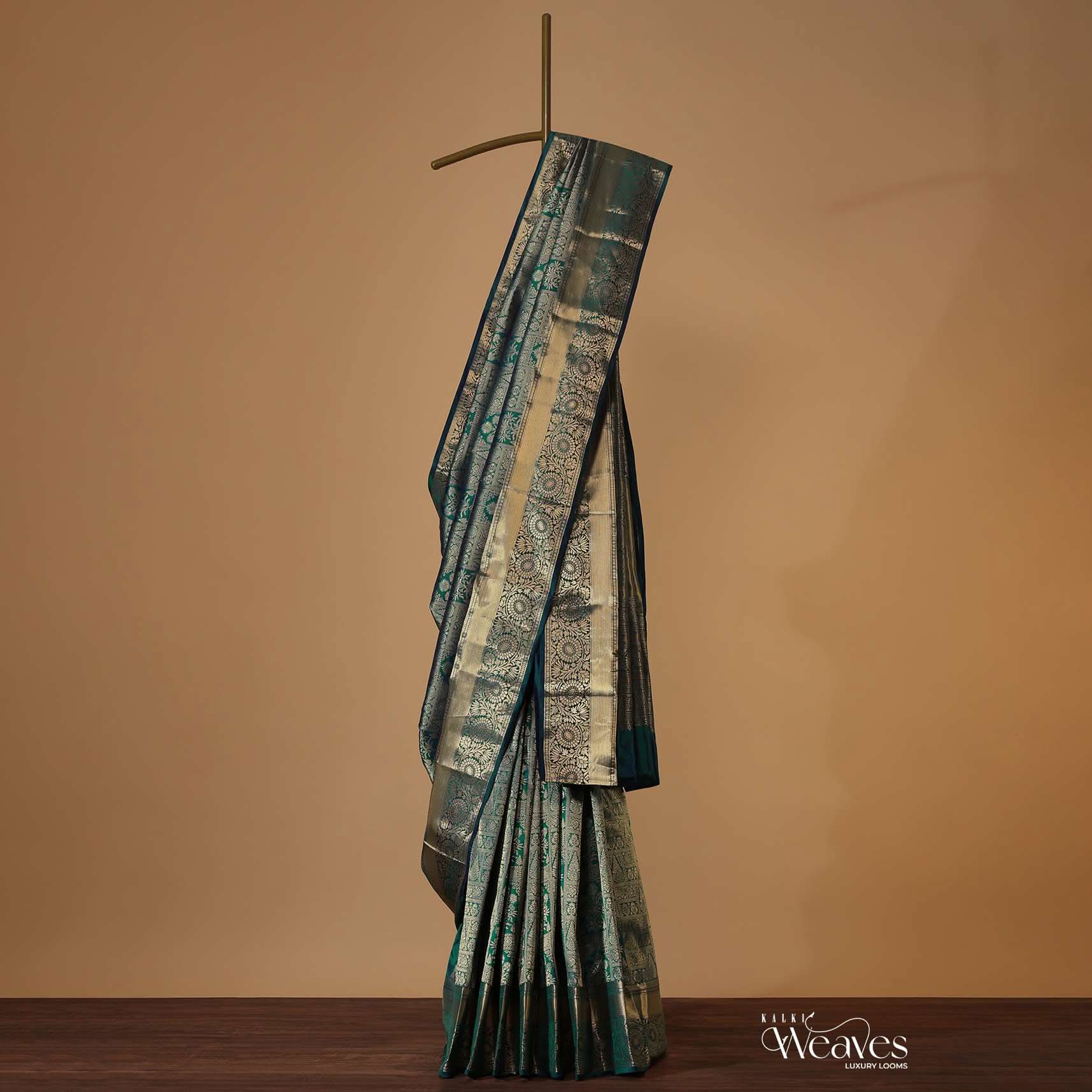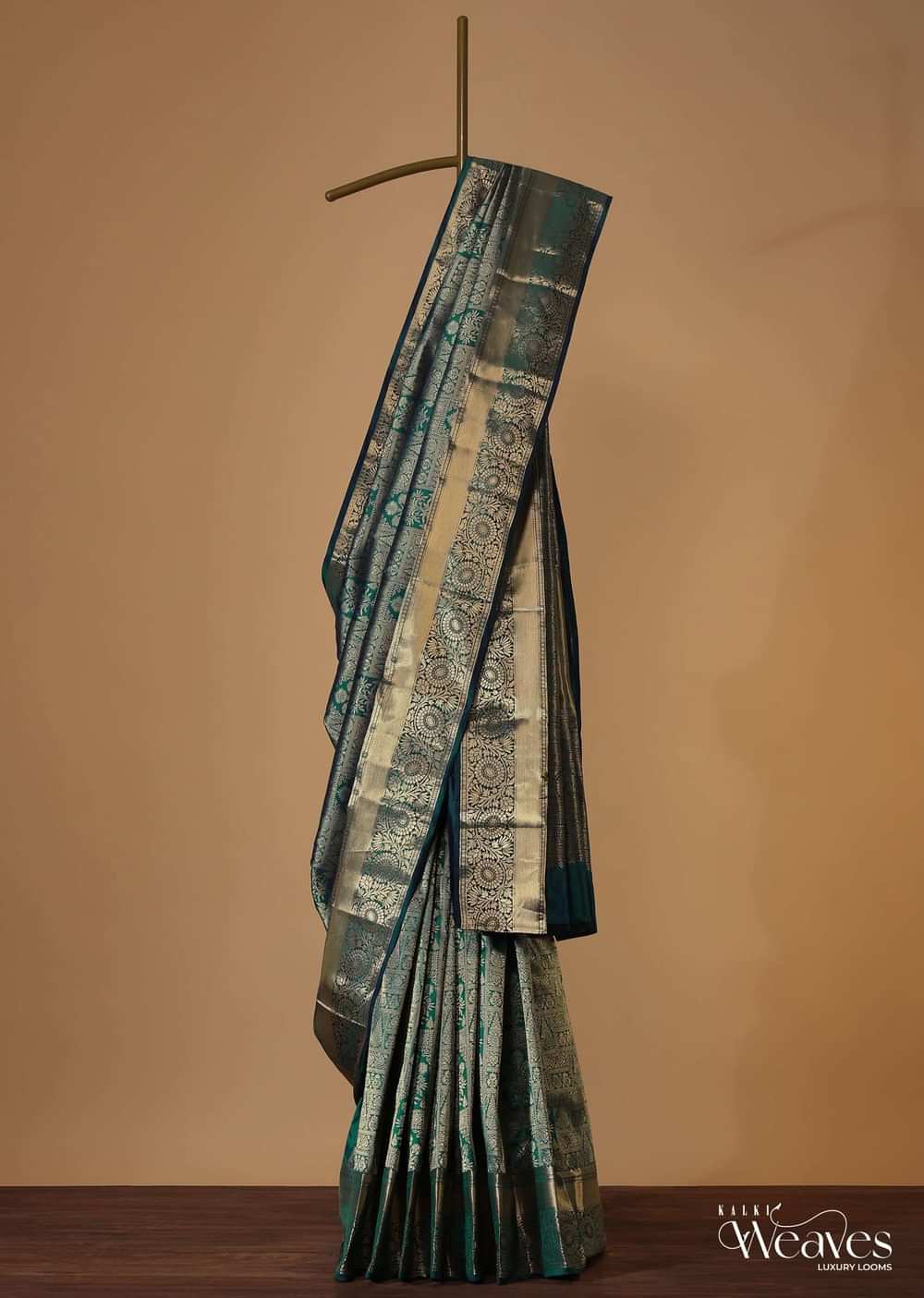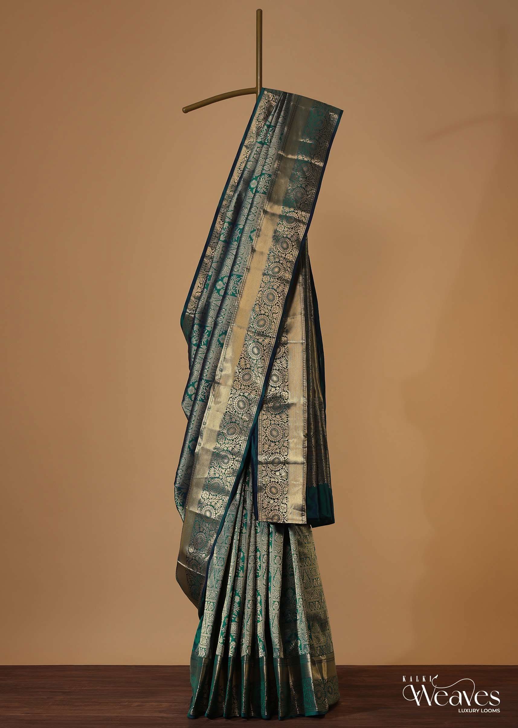Peacock Blue Kanjivaram Saree In Pure Uppada Silk With Zari Weave And Unstitched Blouse