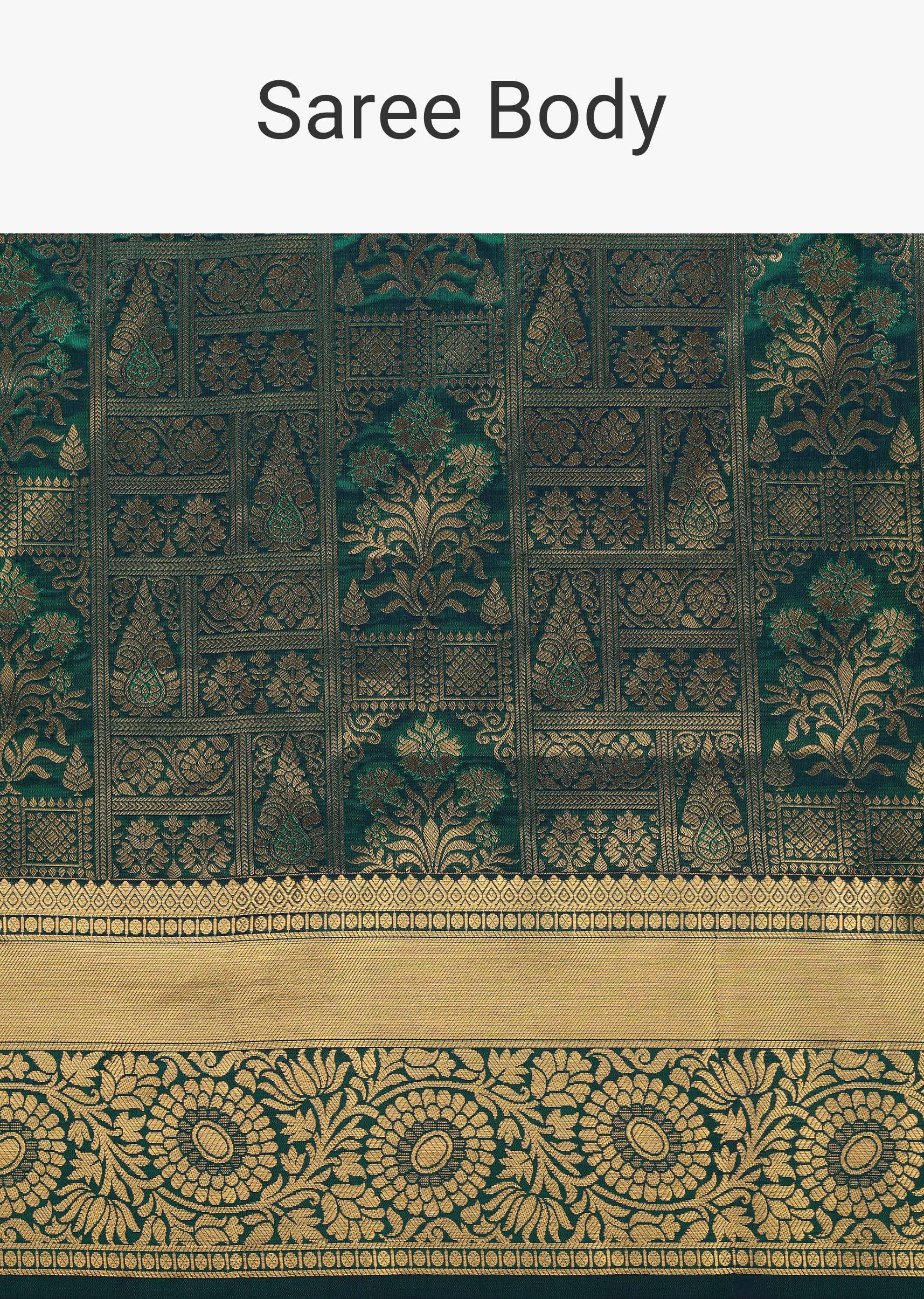 - The saree has a rich intricate zari weave all over, with a dense gold zari woven pallu and border.