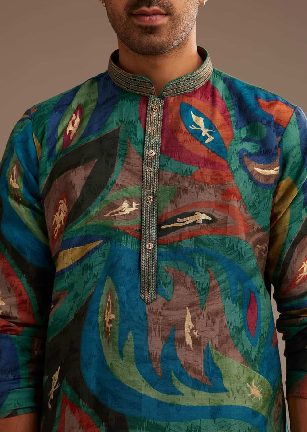 Peacock Blue Multi Color Silk Abstract Printed Kurta Set