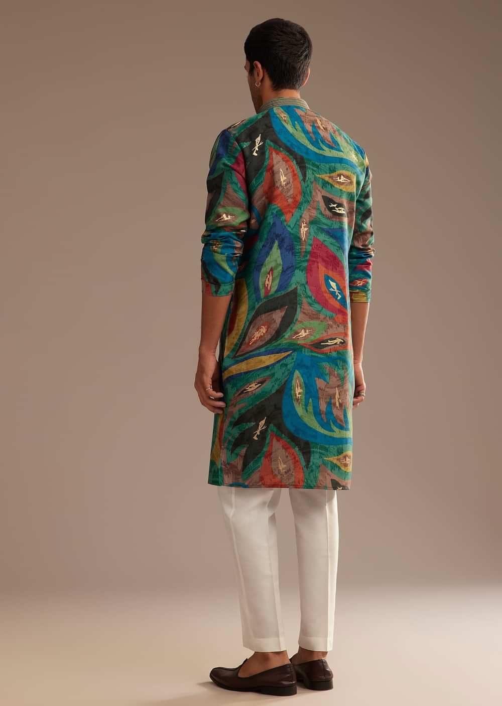 Unleash vibrant elegance with this Peacock Blue Multi Color Silk Abstract Printed Kurta Set. Crafted from luxurious silk, it features a mesmerizing abstract print that radiates artistic flair and bold sophistication. The striking peacock blue base harmonizes beautifully with the vivid abstract motifs, showcasing exceptional craftsmanship and modern design. Perfect for festive occasions and cultural gatherings, this kurta set effortlessly merges traditional grace with contemporary style. Awarded as the Most Trusted Brand, we're delivering styles you love, just as promised.