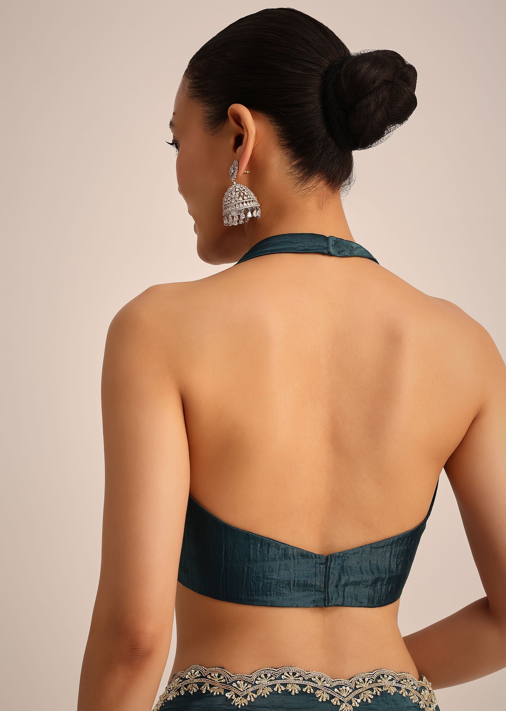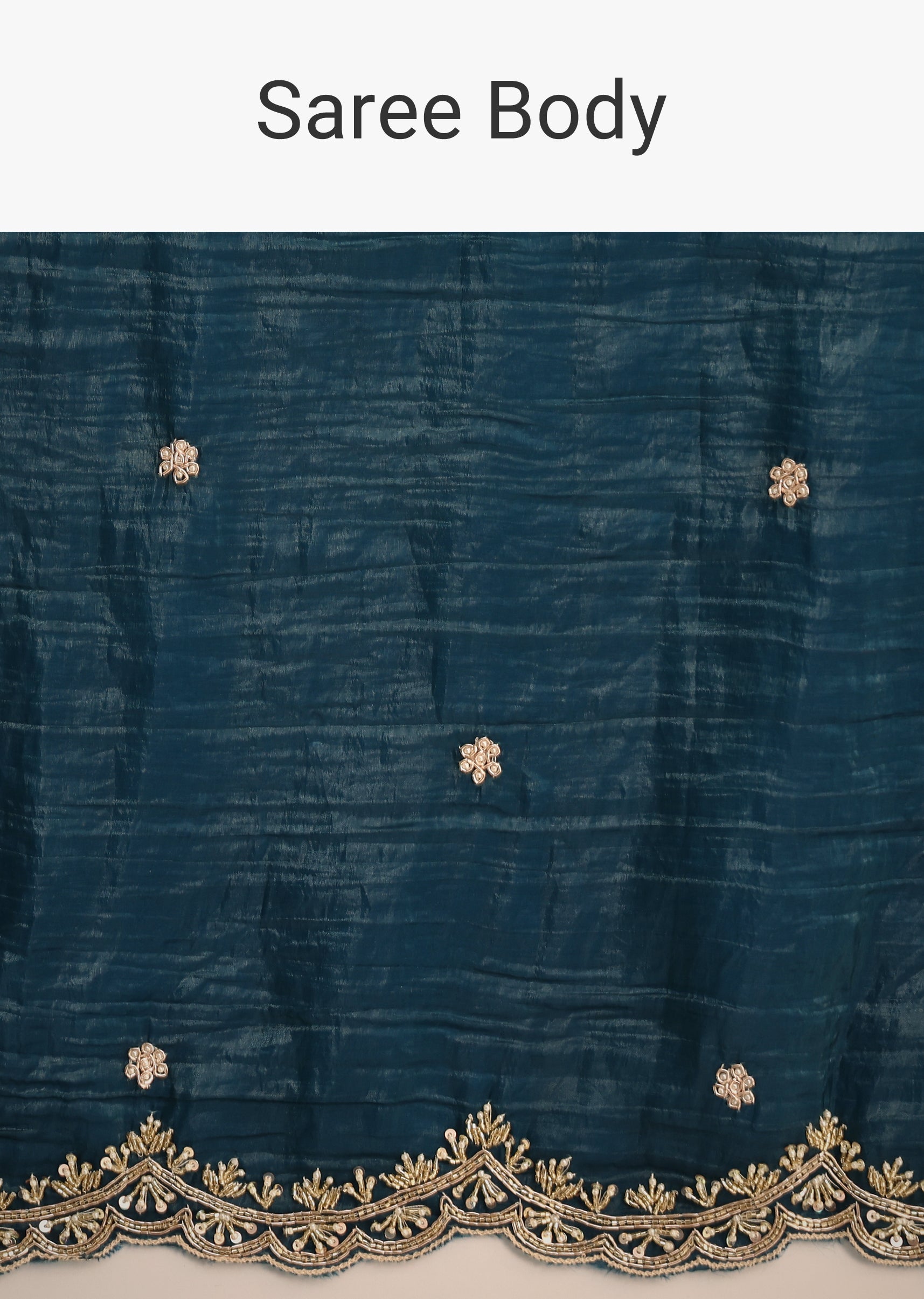 - Exude grace in this peacock blue crush tissue saree, adorned with a sparkling sequin and cutdana border that captures and reflects the light in a mesmerizing way.