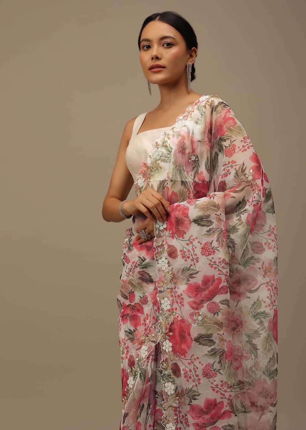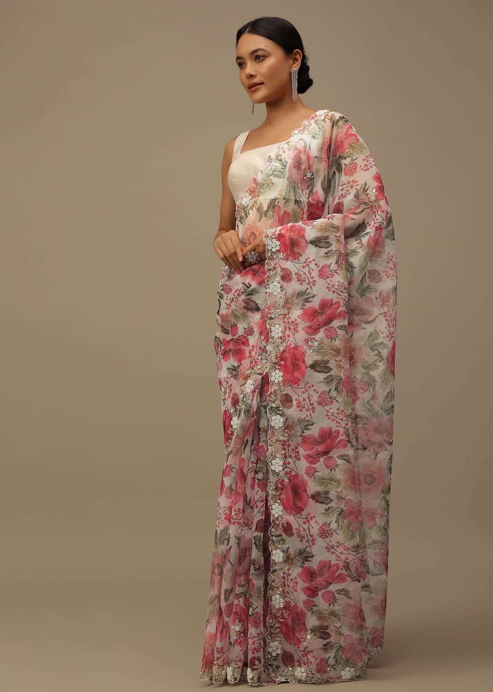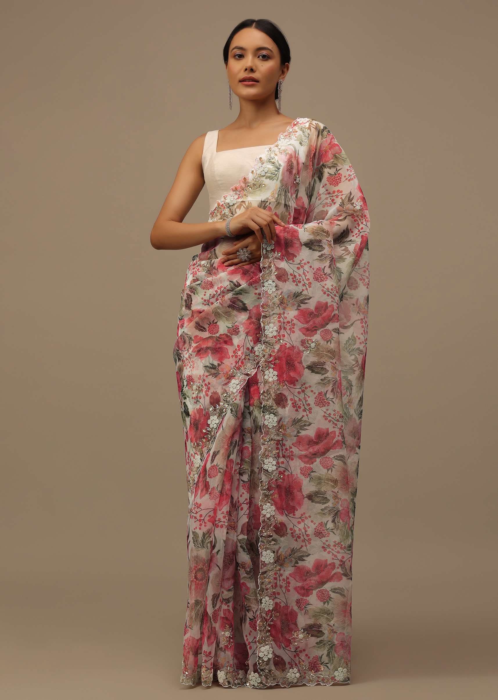 Pearl White Embroidered Organza Saree With Floral Print And Scallop Borders