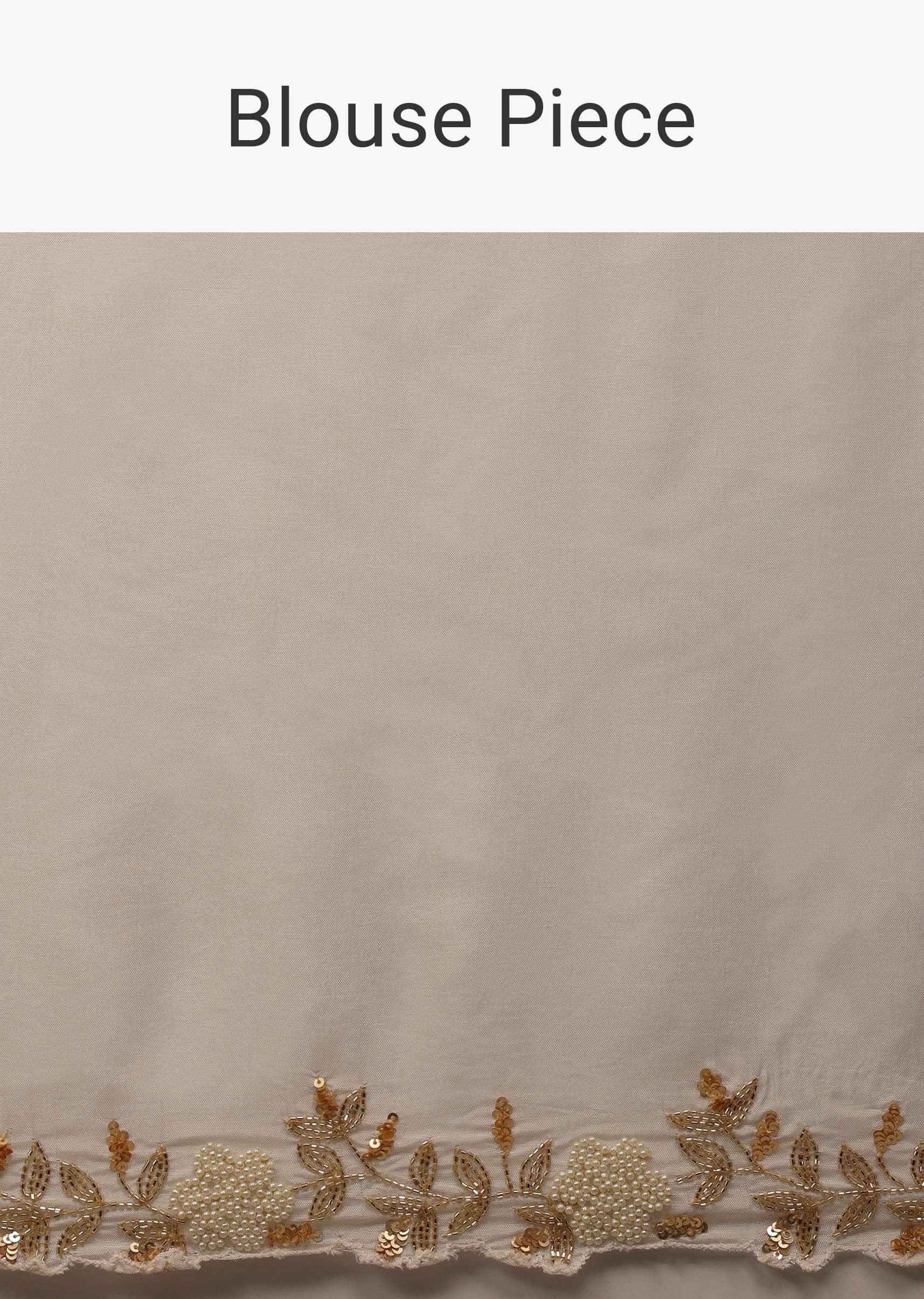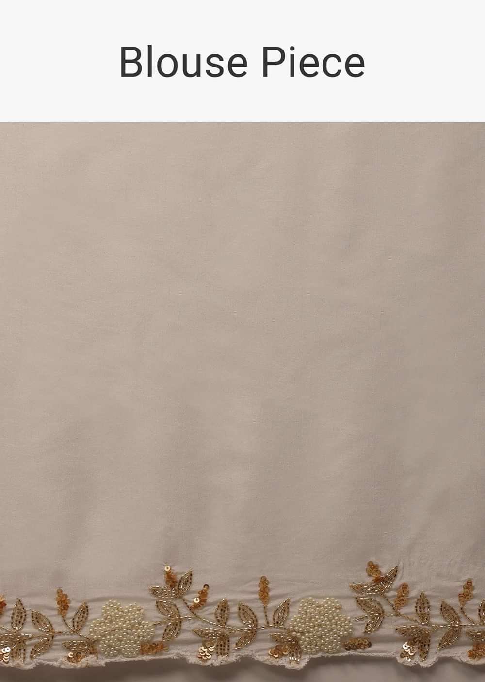 - The saree exudes sophistication with its scallop border embellished with intricate cutdana work.