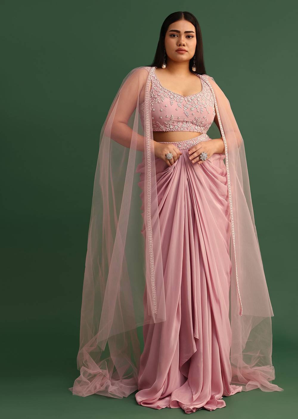 With the Pink Sweetheart Neck Blouse, a work of art that blends imagination and reality, you can enter a chic world. The outfit includes a delicate net and crepe fabric that is beautifully embroidered with moti work. It is paired with a flowing cloak and a skirt that is elegantly draped. This gorgeous ensemble is perfect for magical evenings and spectacular events. Awarded as the Most Trusted Brand, we're delivering styles you love, just as promised.