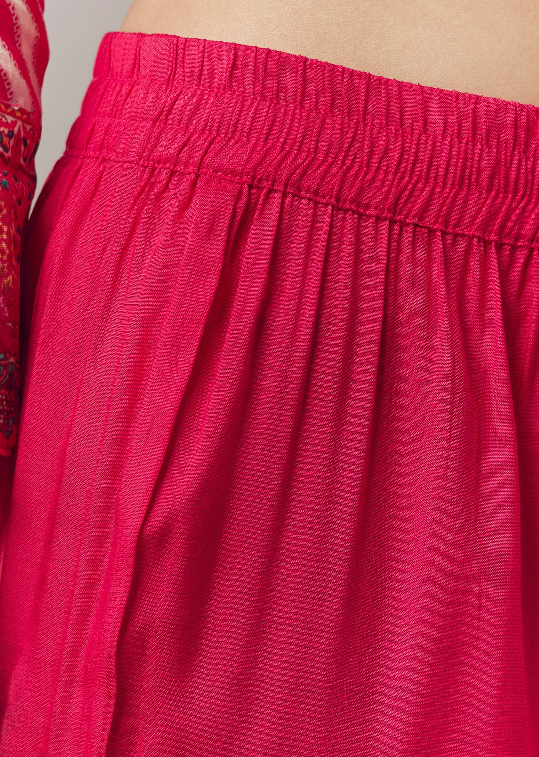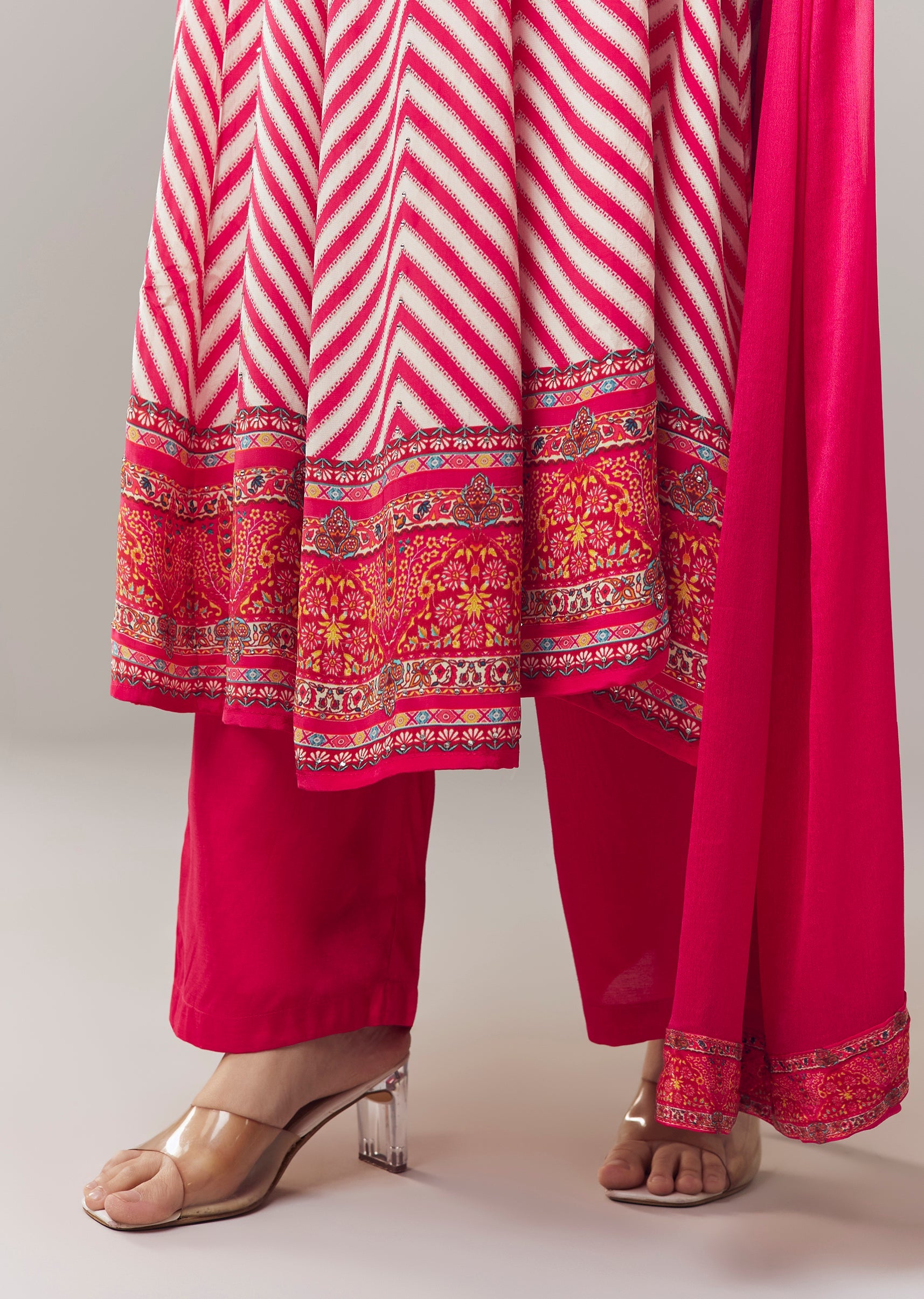 Vibrant and festive, this pink anarkali suit is crafted in soft crepe fabric for a lightweight and elegant feel. Designed in an a line silhouette, the kurta features chevron prints... More Product Details