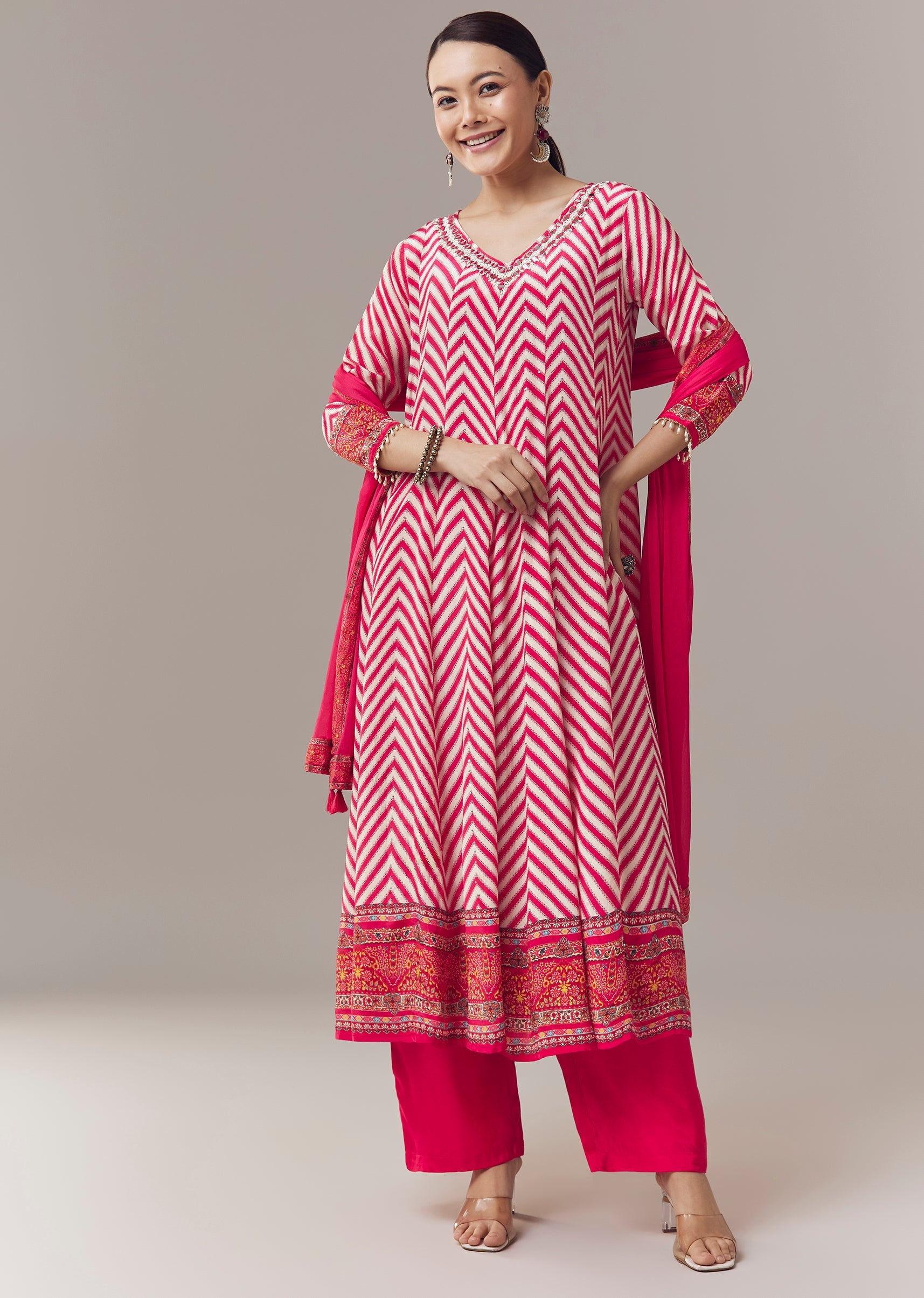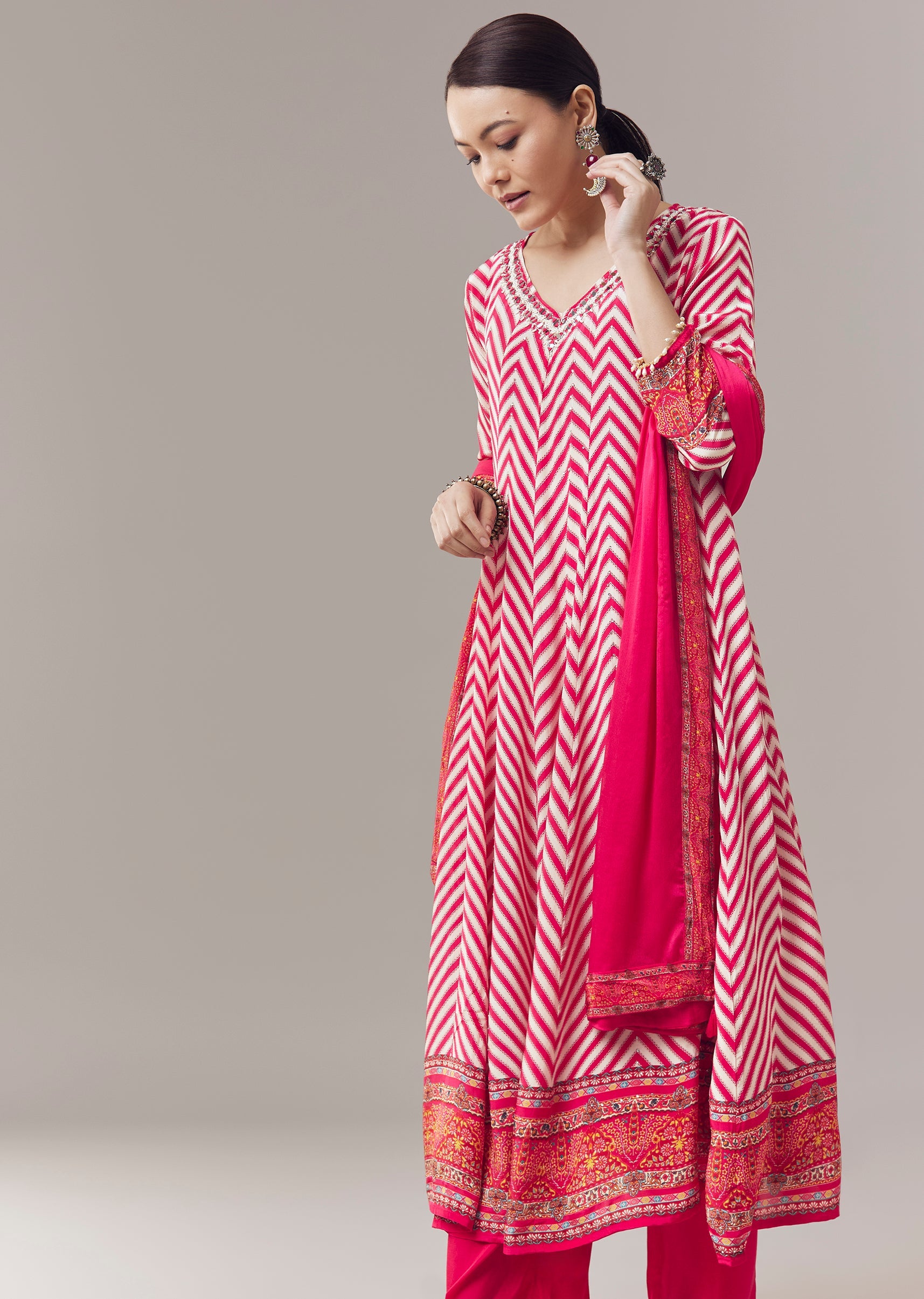 Pink Anarkali Suit In Chevron Print With Mirror Moti And Stone Work And Dupatta