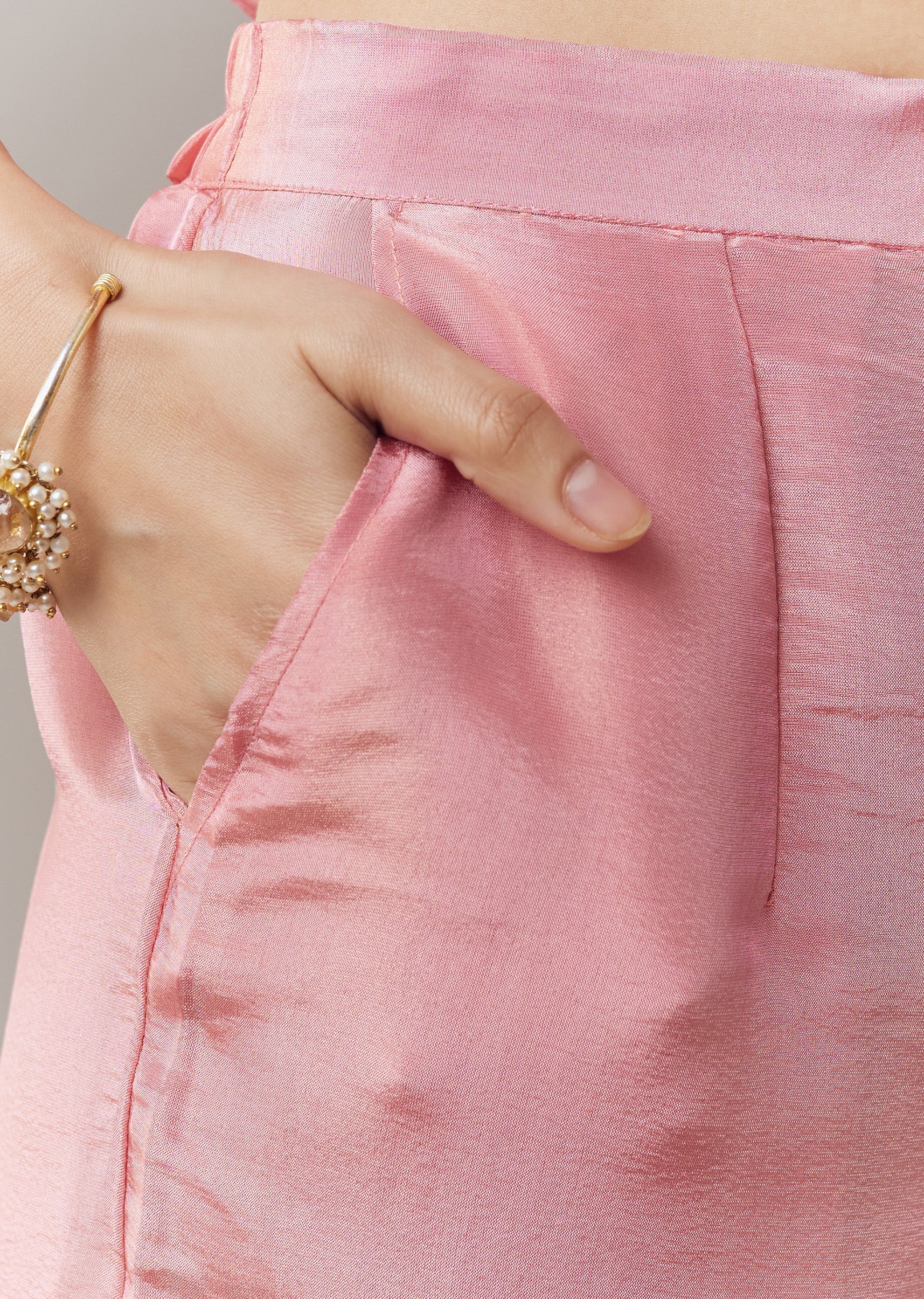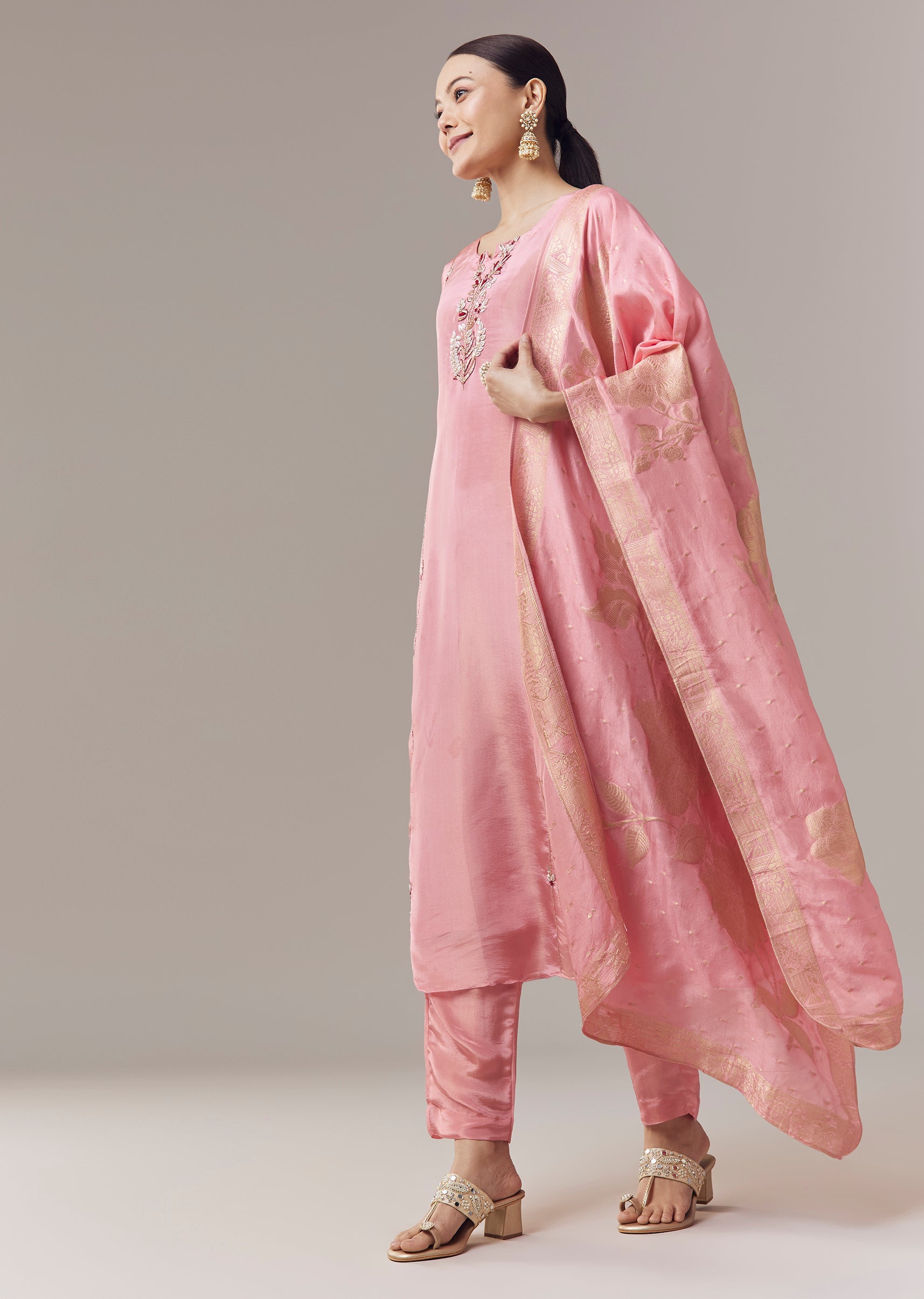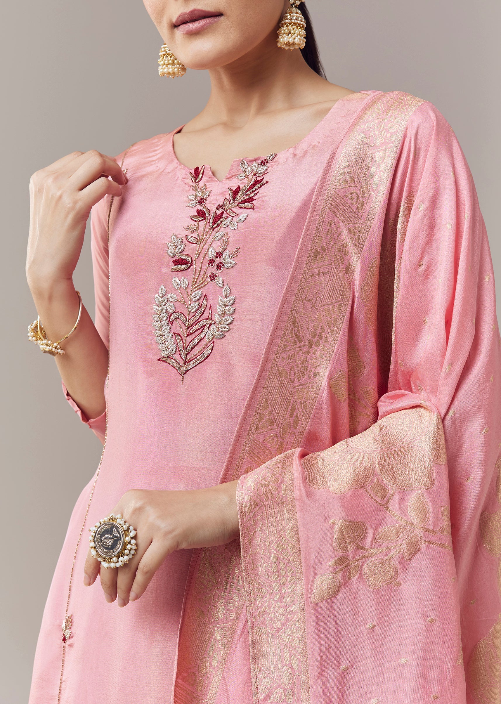 Delicate and festive, this pink anarkali suit is crafted in lightweight tissue fabric ideal for Pooja and other celebratory occasions. The kurta features intricate zardosi embroidery that adds subtle shimmer... More Product Details