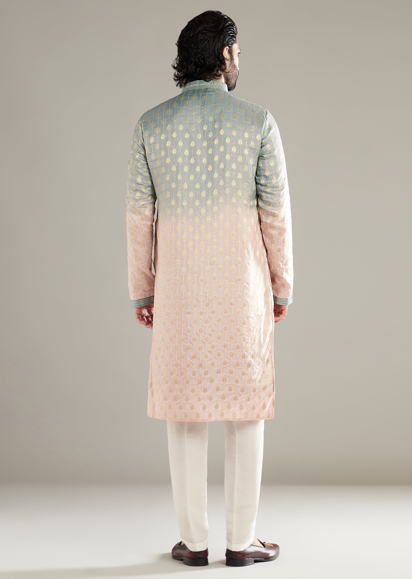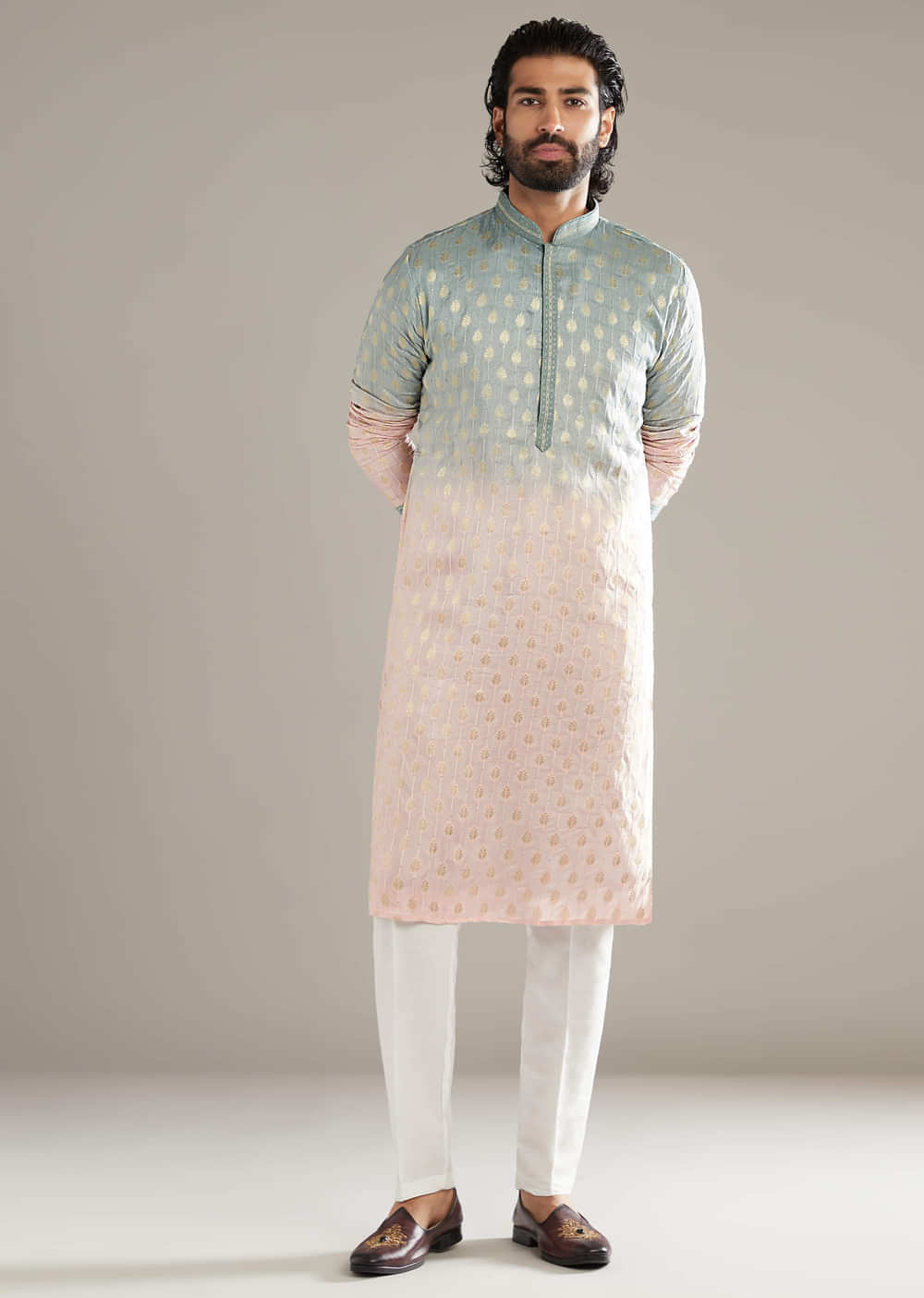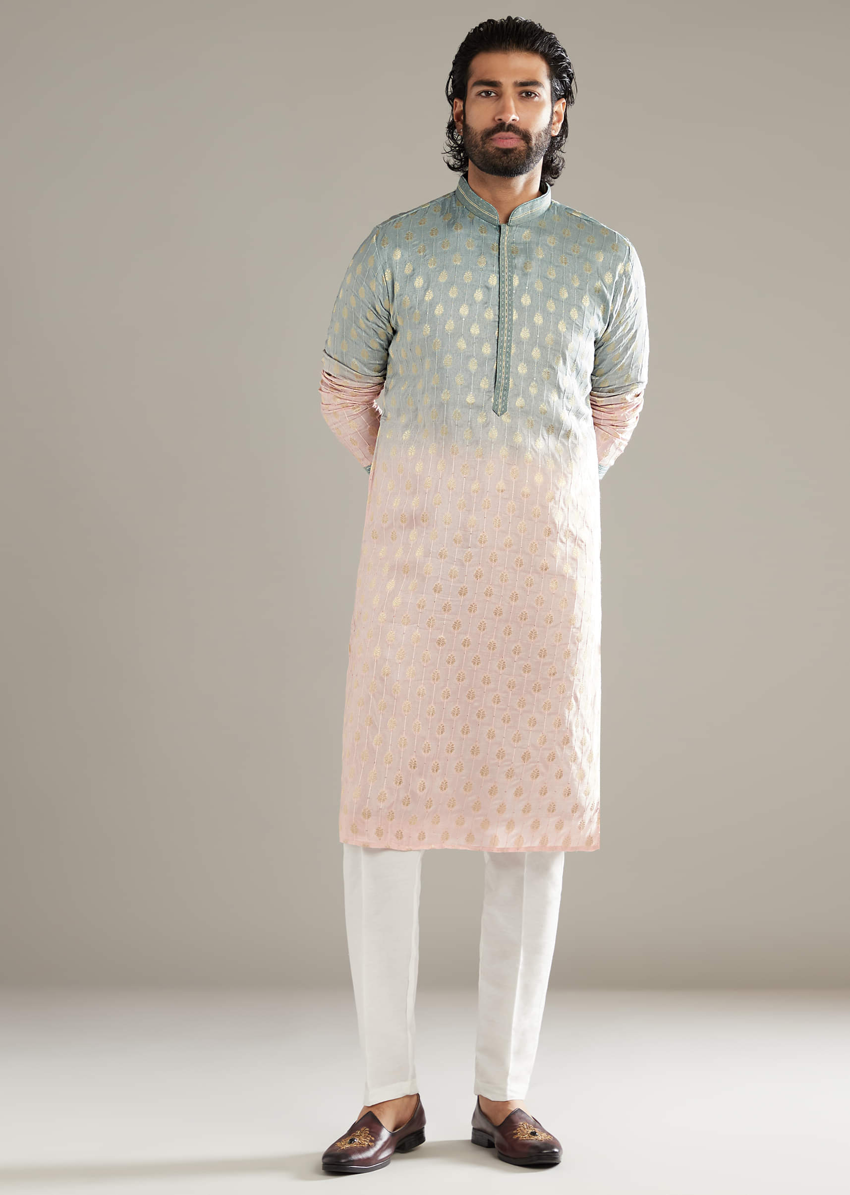Pink And Green Ombre Silk Kurta Set For Men With Foil Motifs