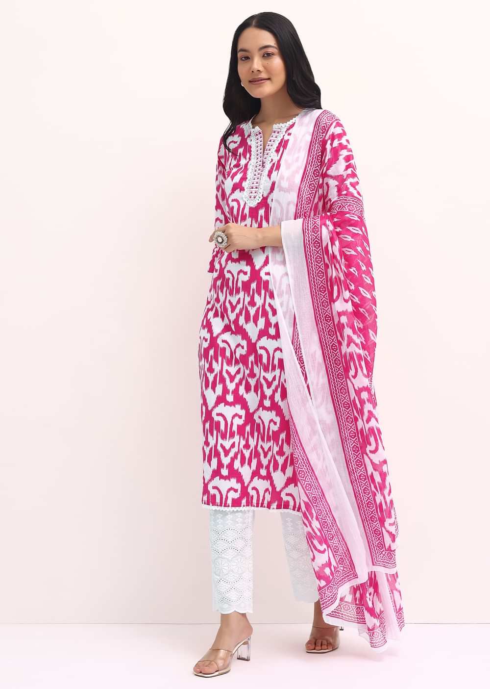 Pink And White Printed Kurta Set With Dupatta