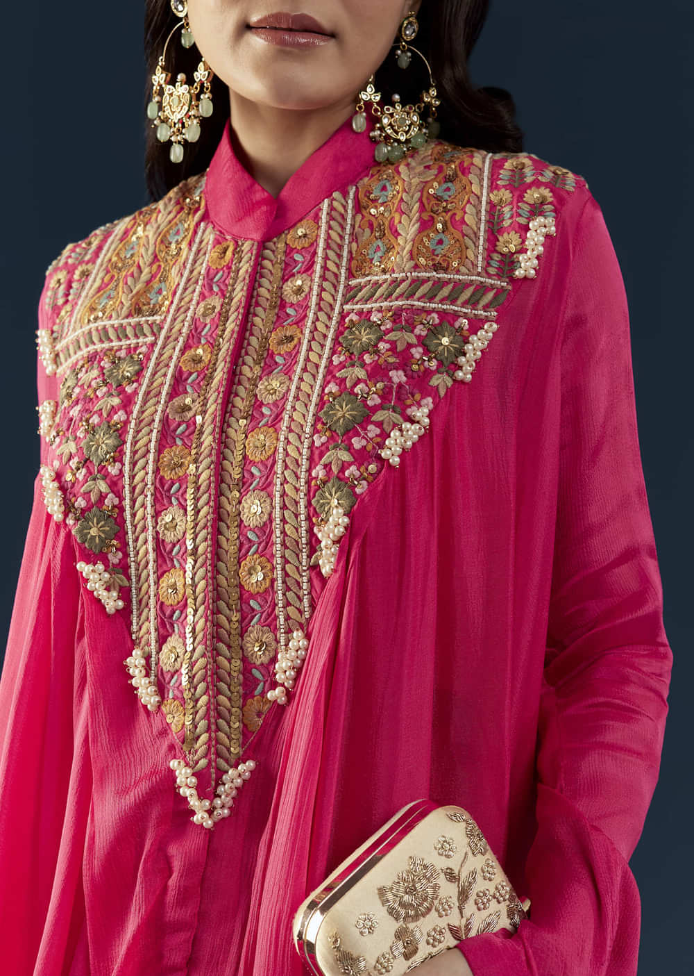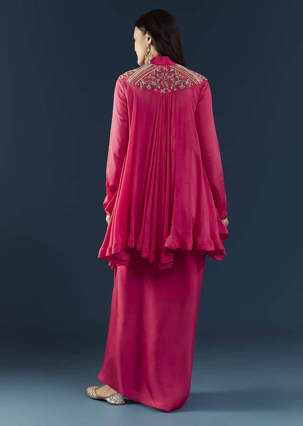 This pink asymmetric cape top and skirt set beautifully fuses modern design with traditional detailing. The ensemble features intricate thread, sequin, and moti work that adds delicate shimmer and texture... More Product Details