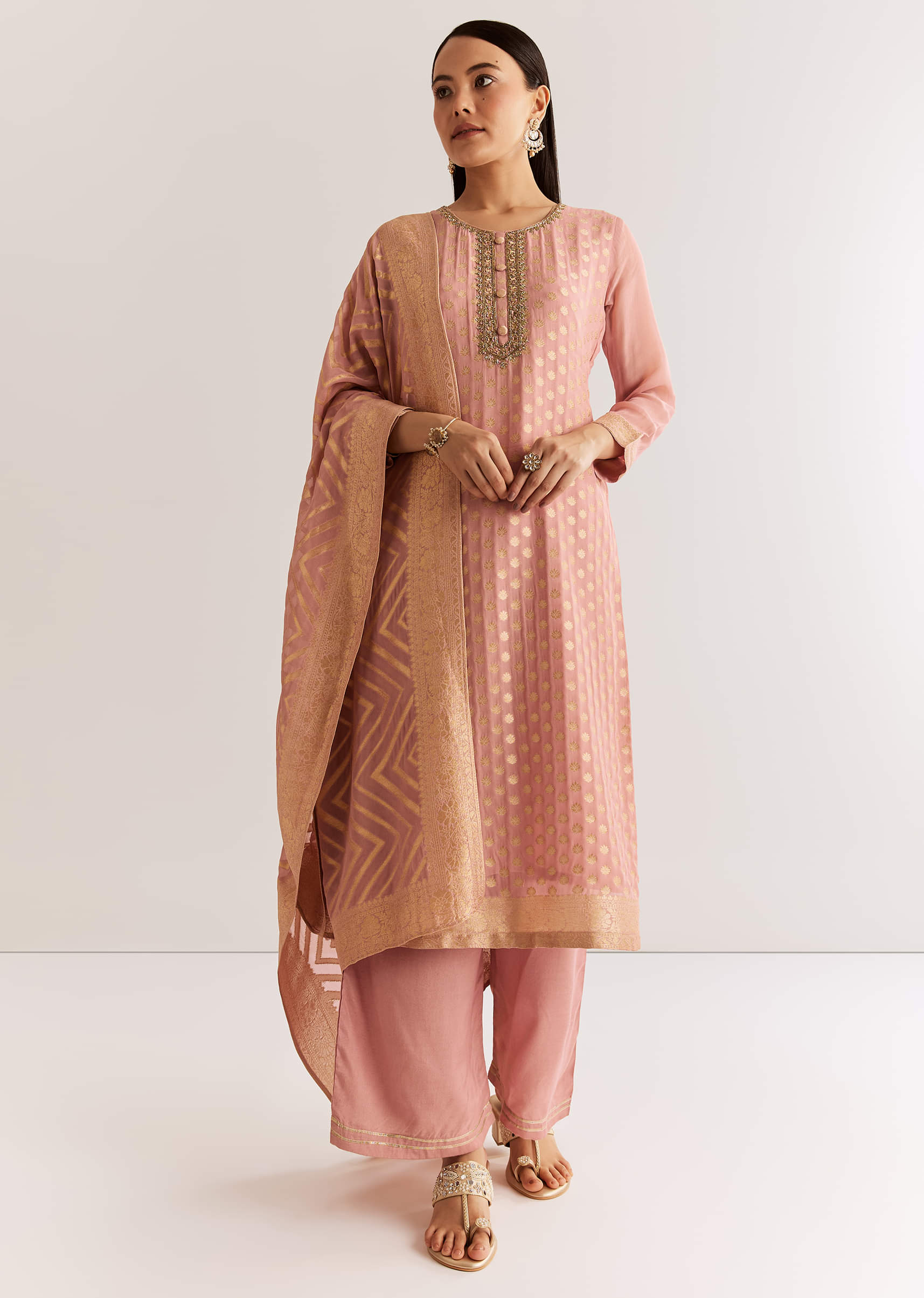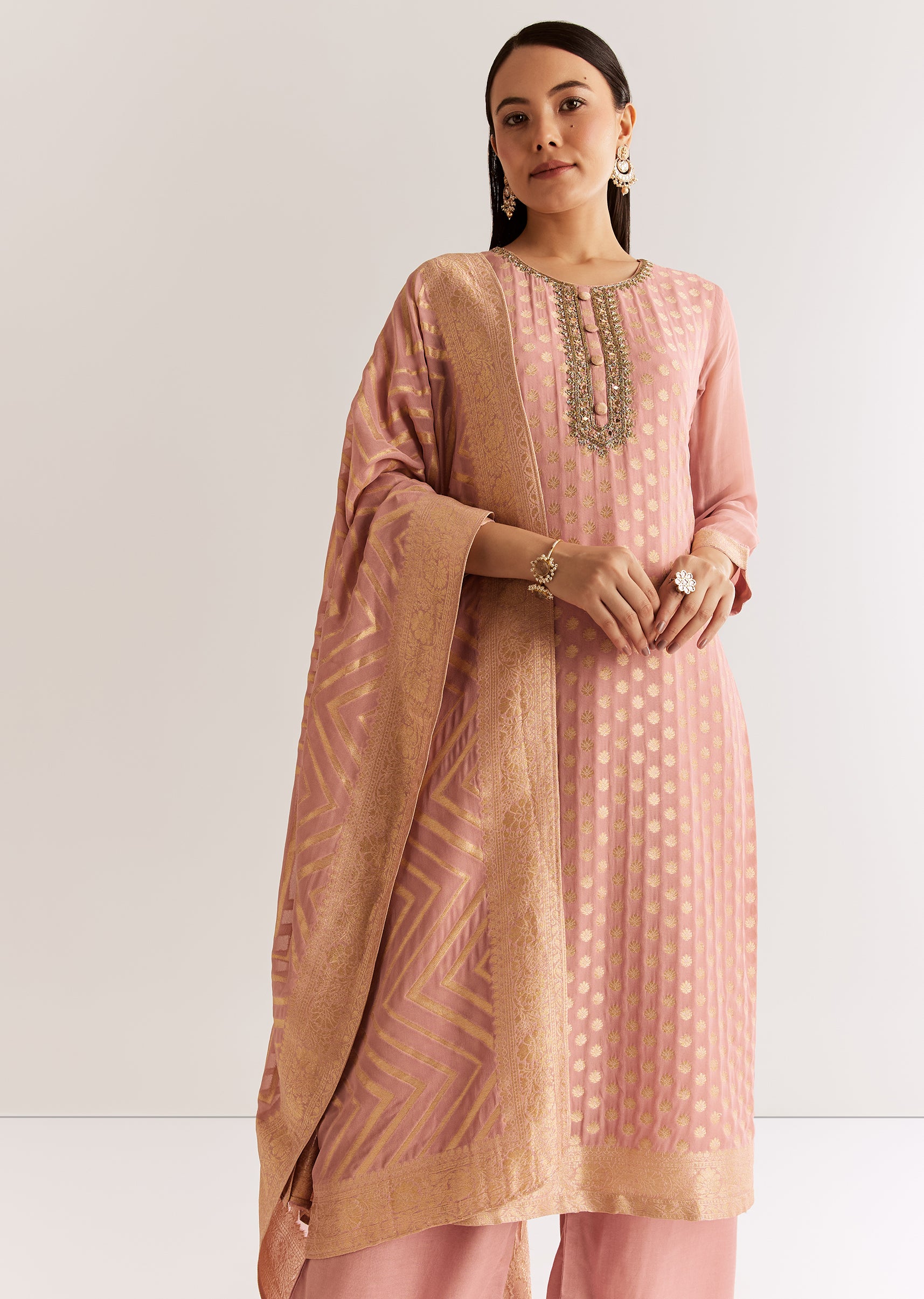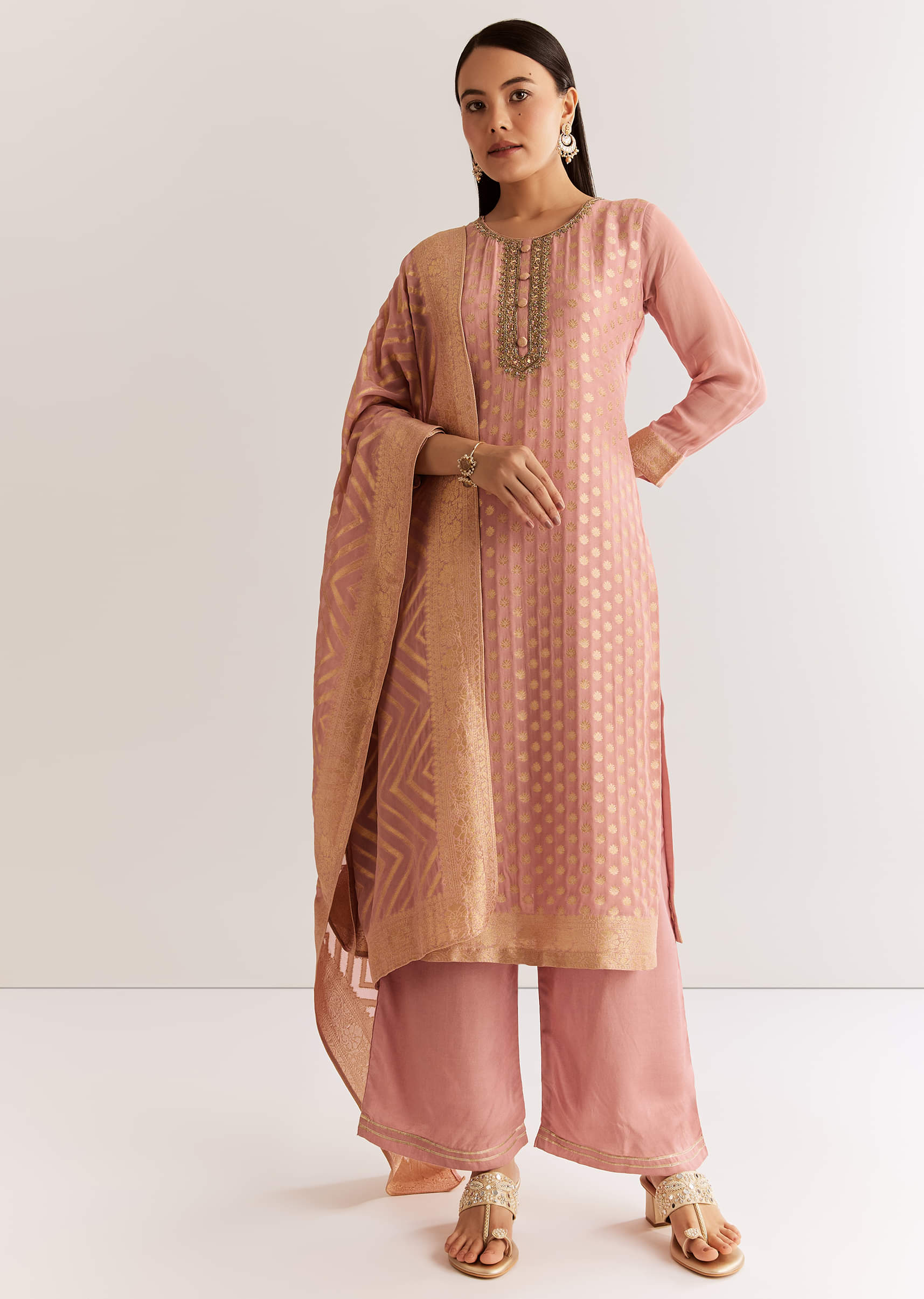 Pink Banarasi Georgette Kurta Set With Zardosi Neckline