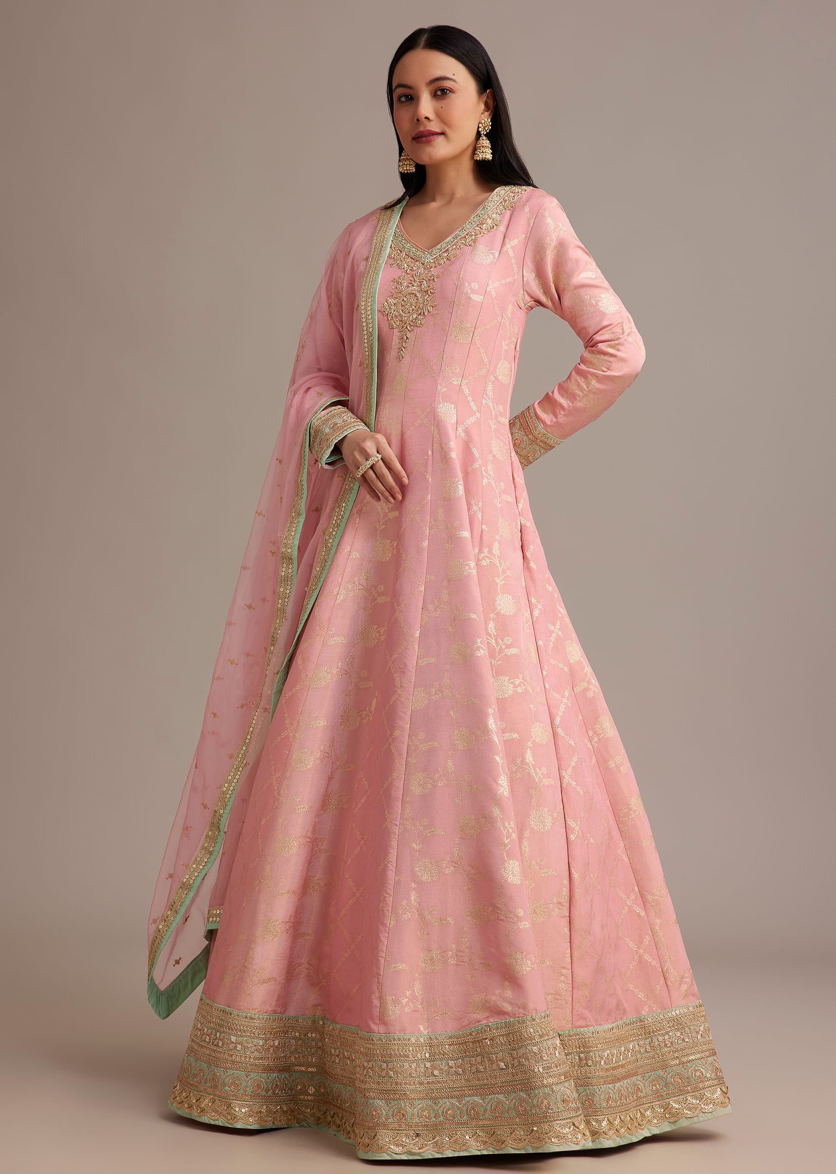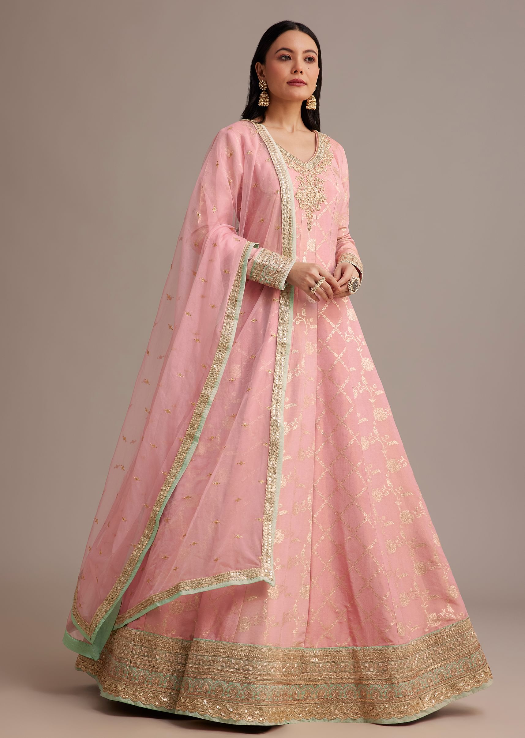 This Pink Banarasi Tissue Anarkali Set Is A Masterpiece Of Rich Craftsmanship Adorned With Intricate Zardosi And Cut Dana Embroidery. The Floorlength Silhouette Features Delicate Gotta Work Along The Sleeves... More Product Details